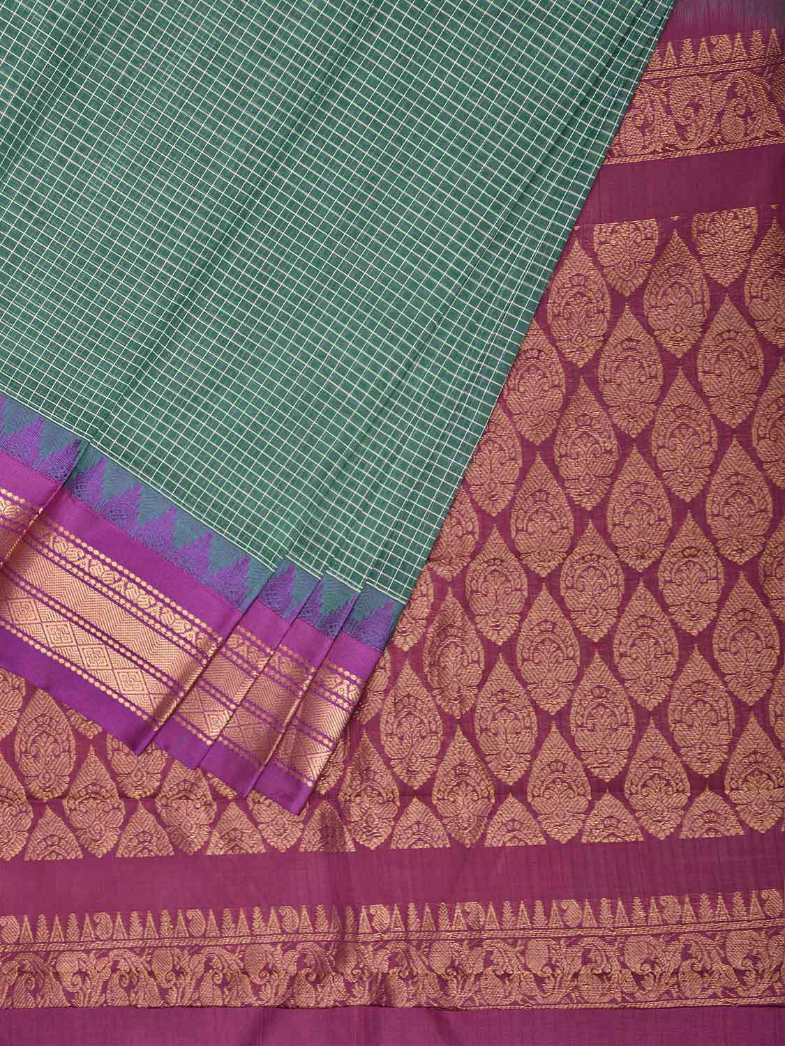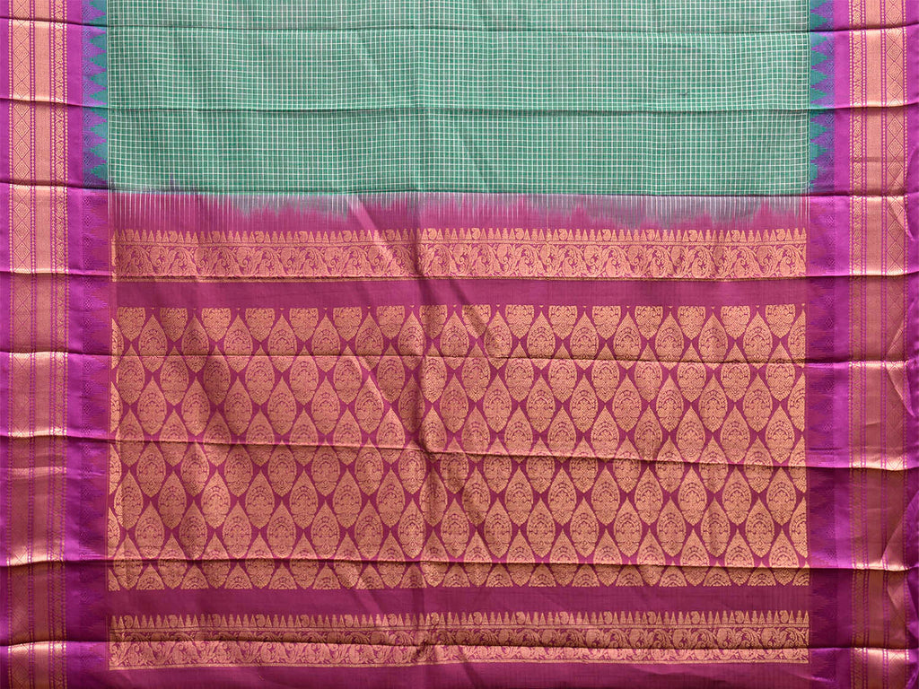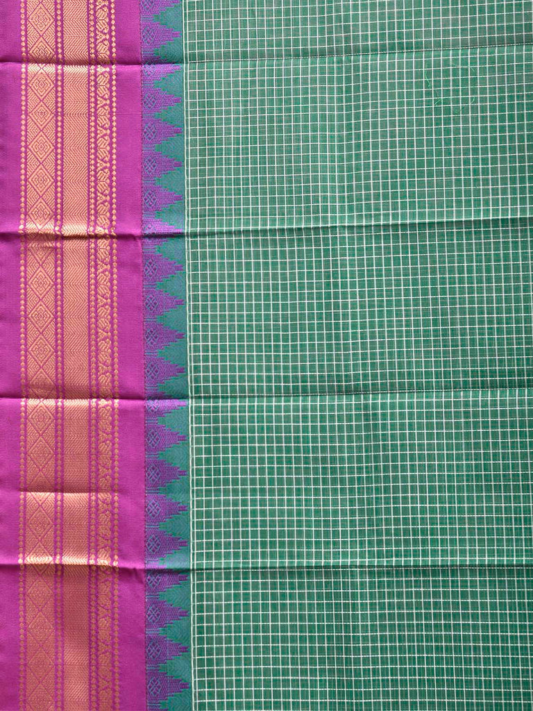 Light Green and Purple Gadwal Cotton Viscose Saree with Checks and Pallu Design No Blouse. Gadwal Sarees are known for their traditional design of border and pallu made of silk and body being either cotton or silk. They are known as Sico sarees for border and pallu being silk and body being cotton. We advice dry clean for fabric care. This saree has no blouse.