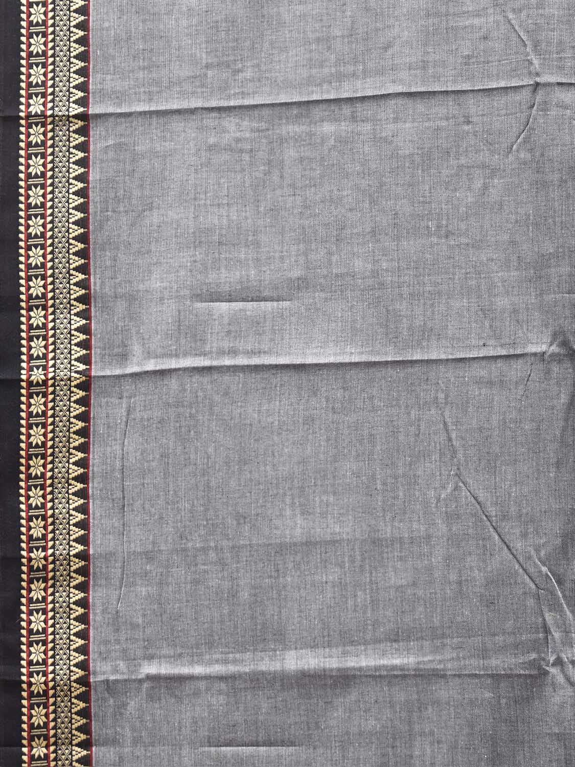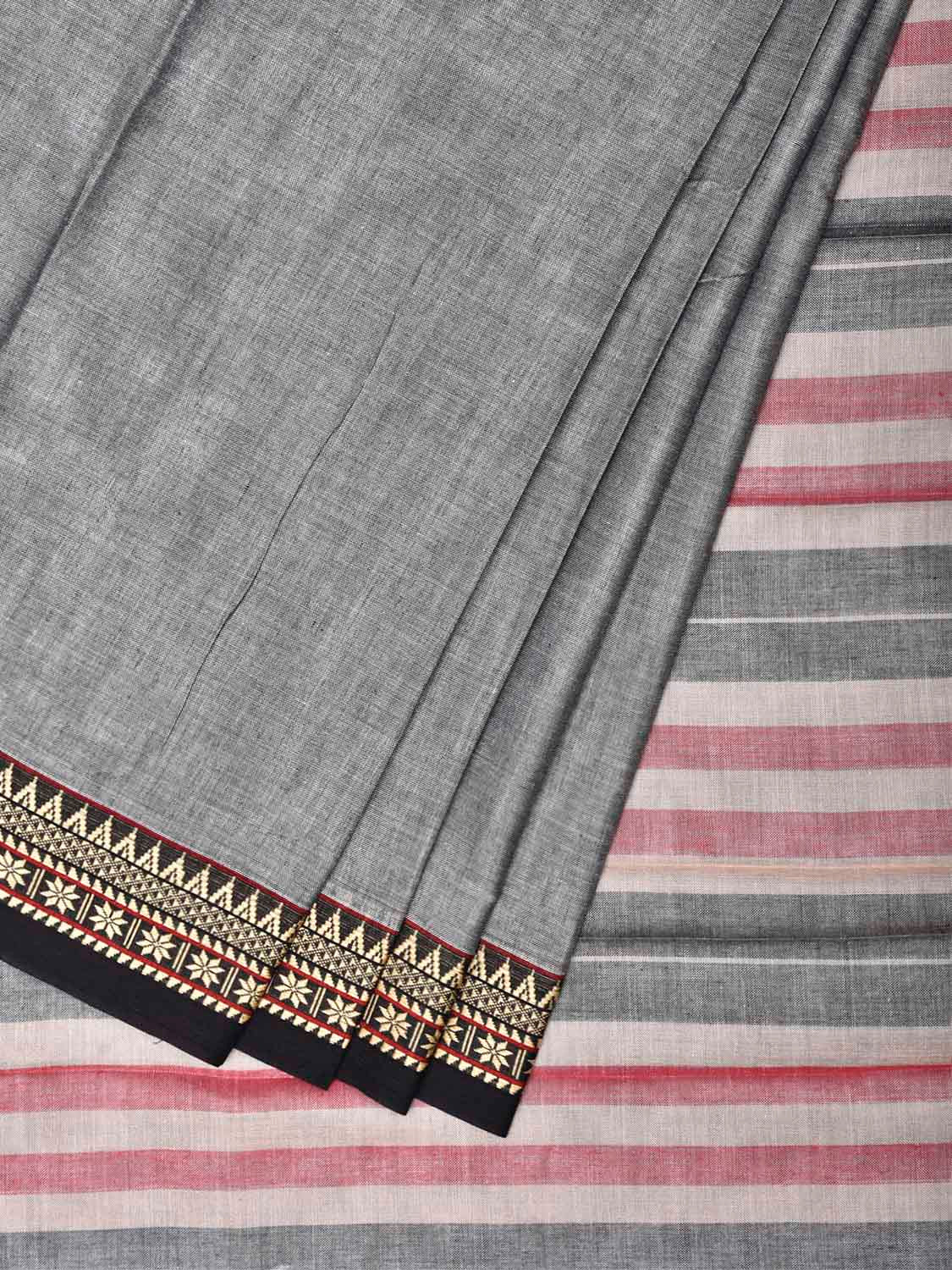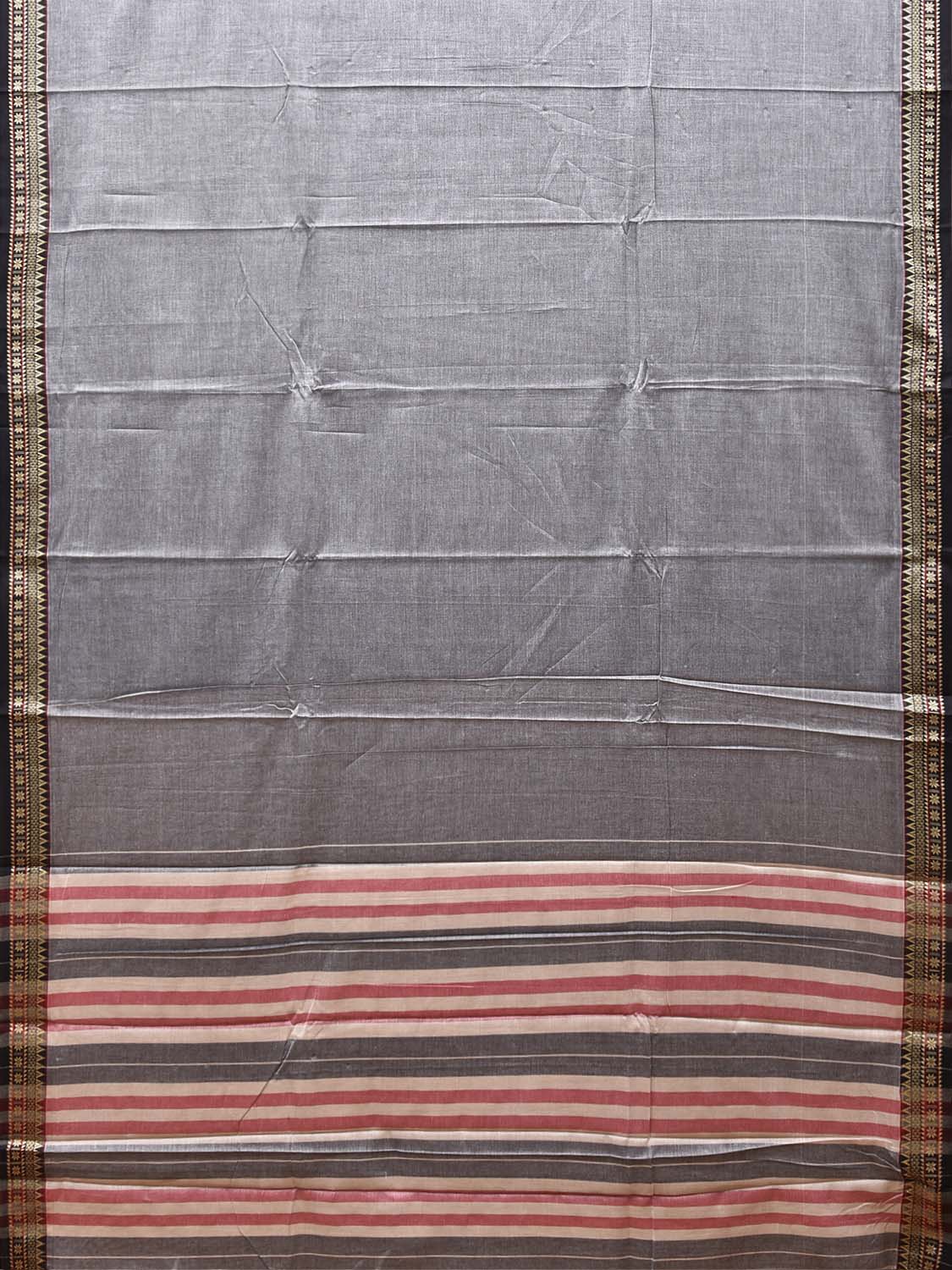 Light Grey and Black Narayanpet Cotton Plain Saree with Strips Pallu Design No Blouse. This saree has no blouse.