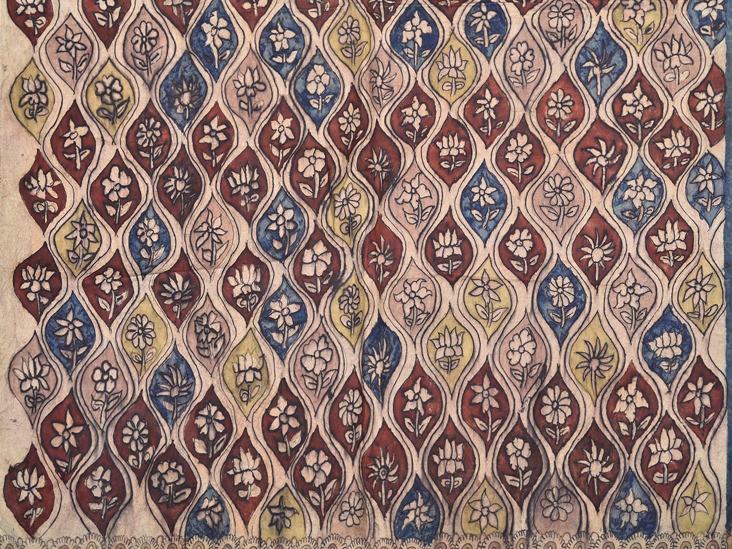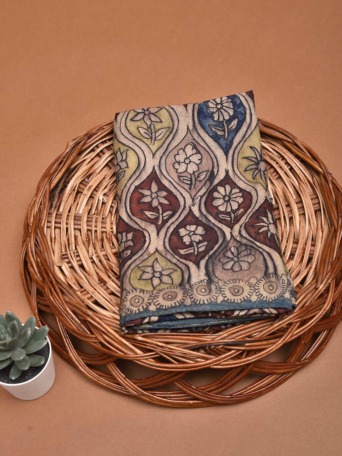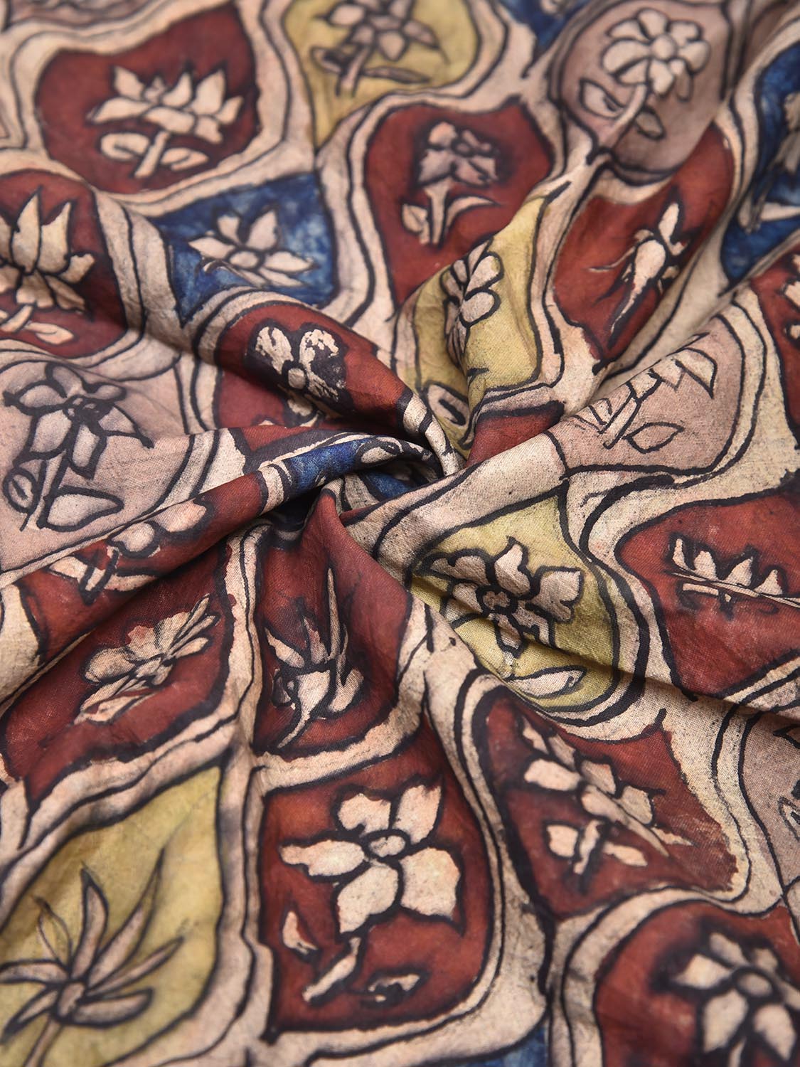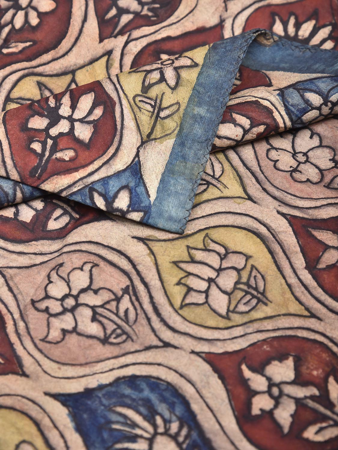 Multicolor Kalamkari Hand Painted Sico Blouse with Floral and Grill Design 1mt Length 35 Inches Width. This hand painted kalamkari is done using natural dyes. As they are natural colors they bleed with initial washes, so we suggest Dry clean.