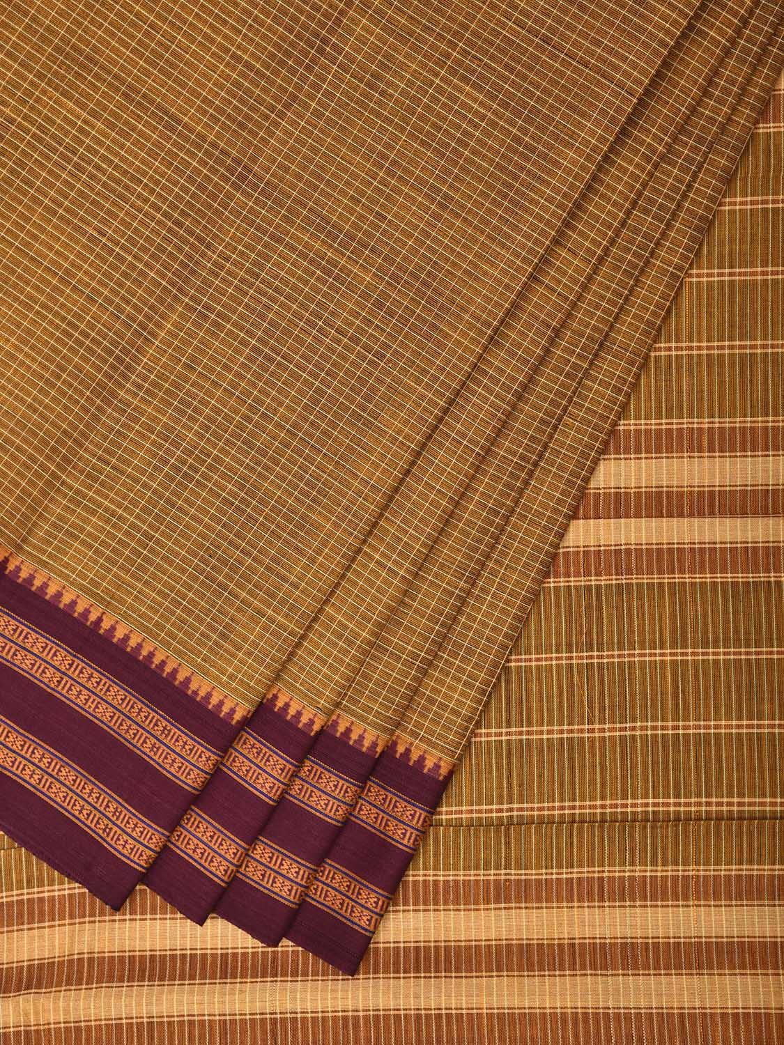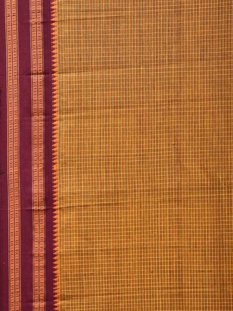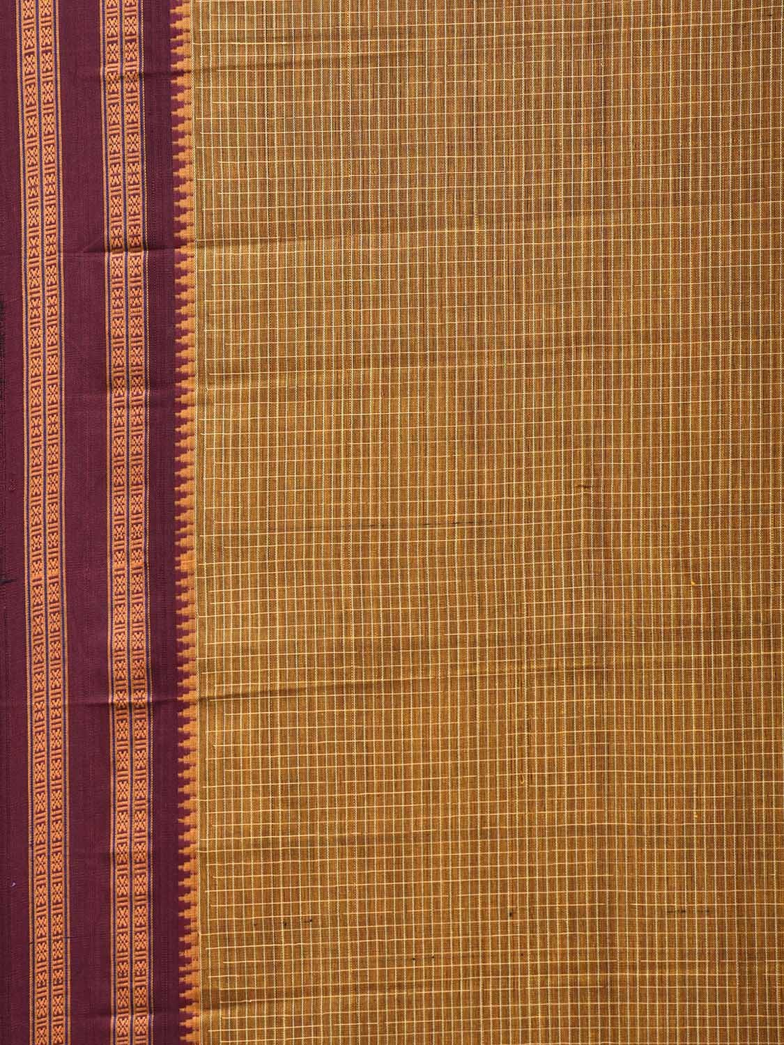 Mustard and Olive Narayanpet Cotton Saree with Checks Design No Blouse. This saree has no blouse.