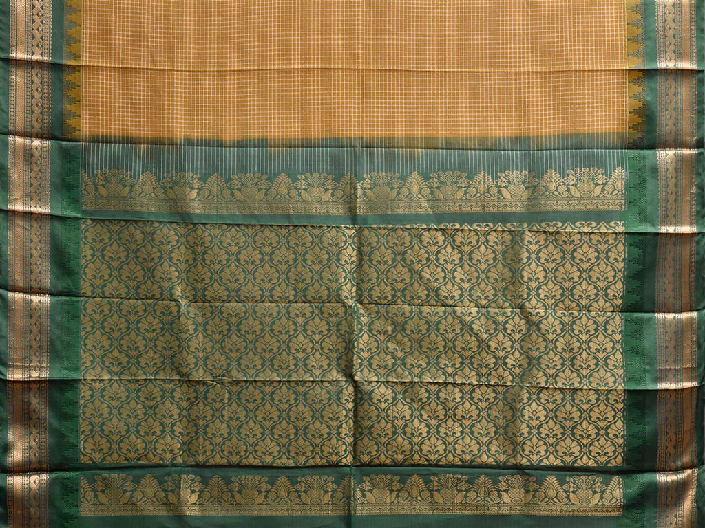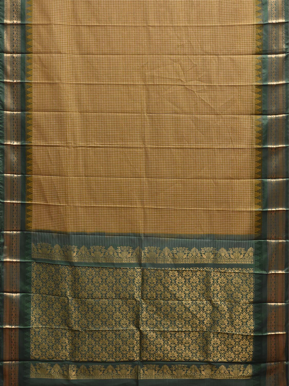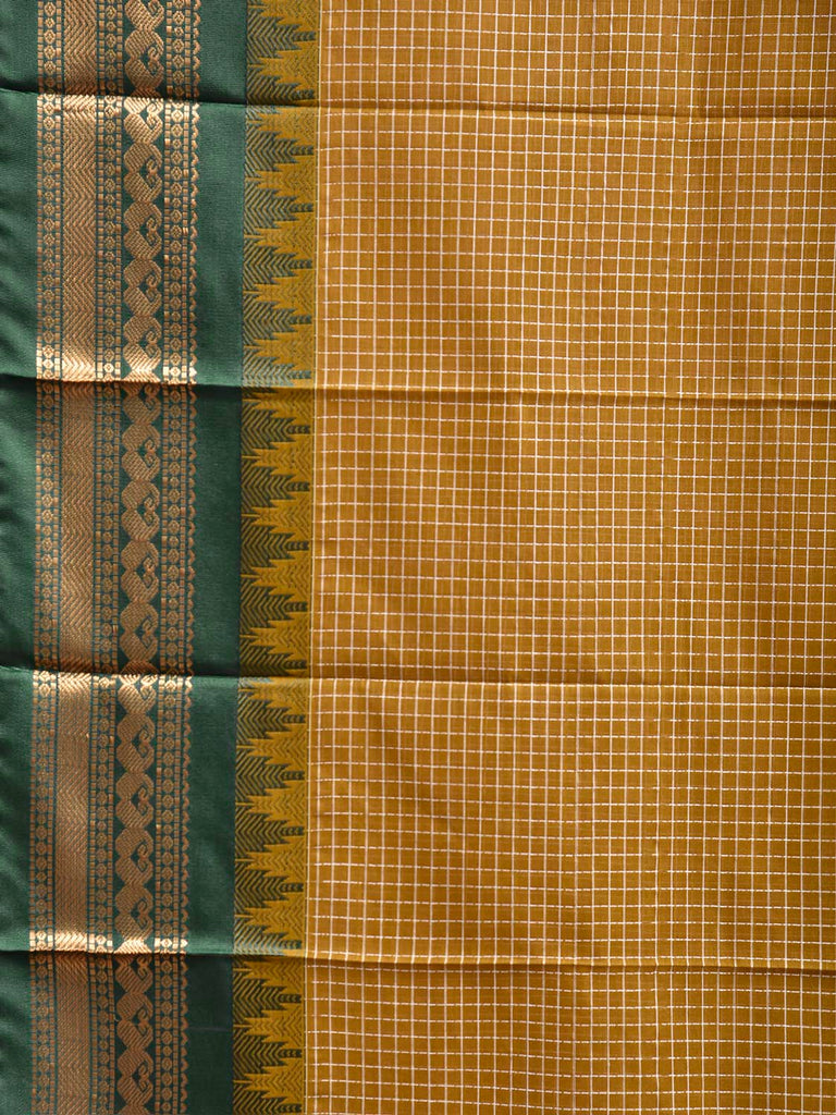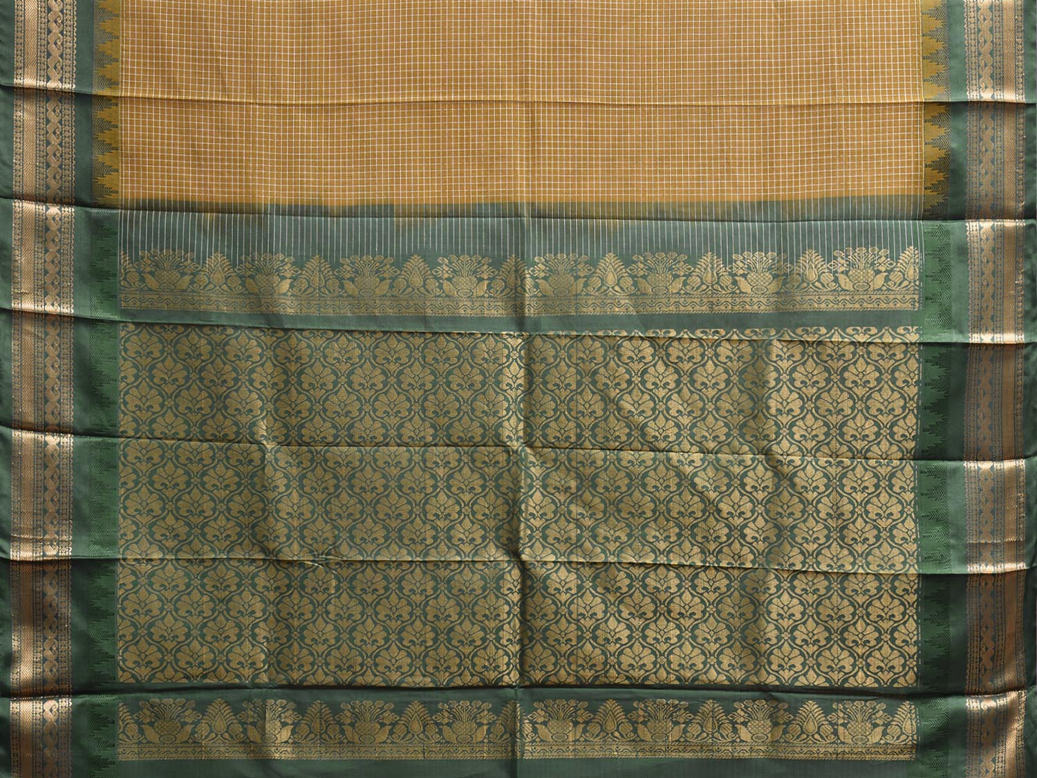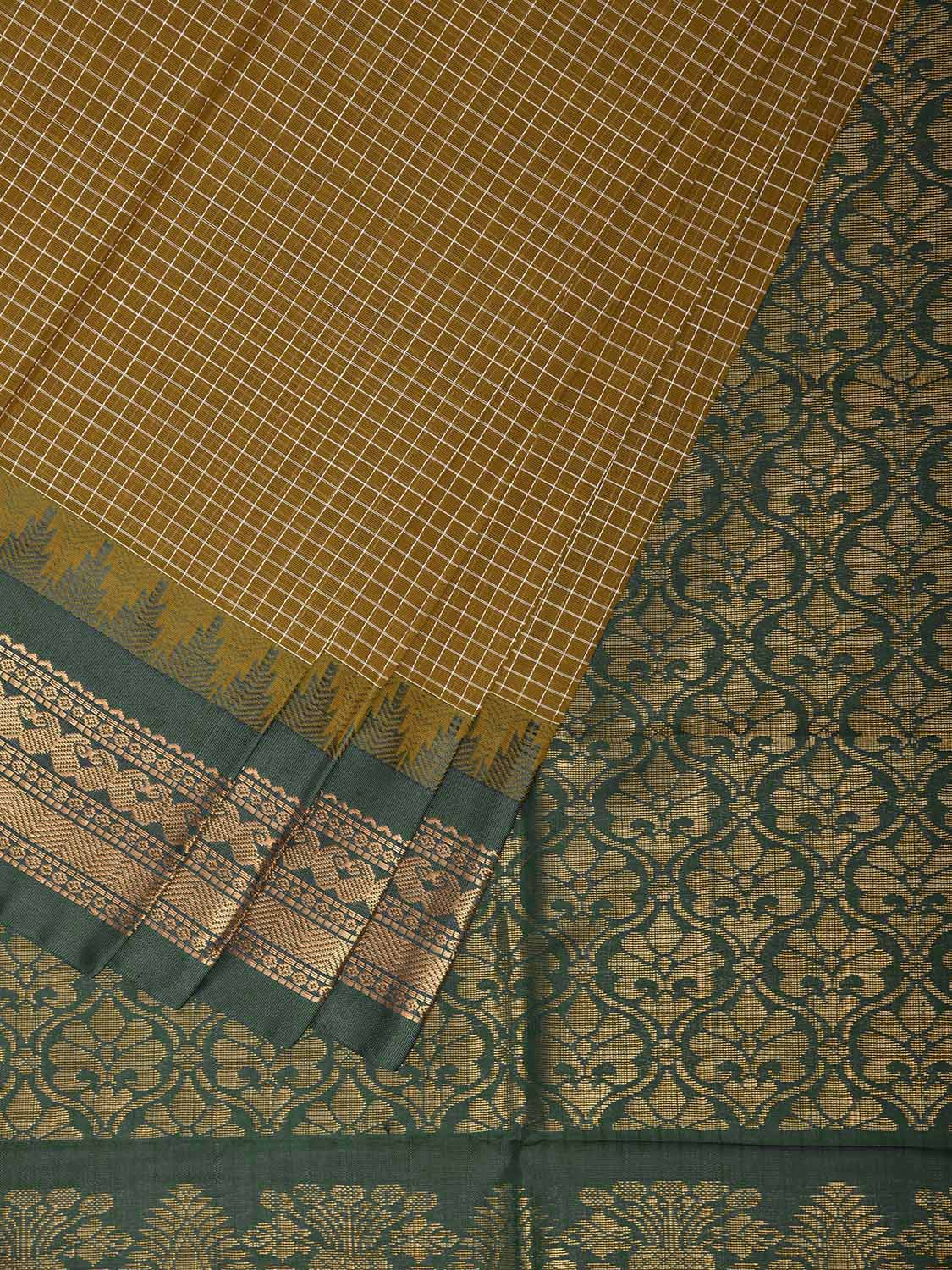 Olive and Green Gadwal Body Cotton Viscose Pallu Saree with Checks and Border-Pallu Design No Blouse. Gadwal Sarees are known for their traditional design of border and pallu made of silk and body being either cotton or silk. They are known as Sico sarees for border and pallu being silk and body being cotton. We advice dry clean for fabric care. This saree has no blouse.