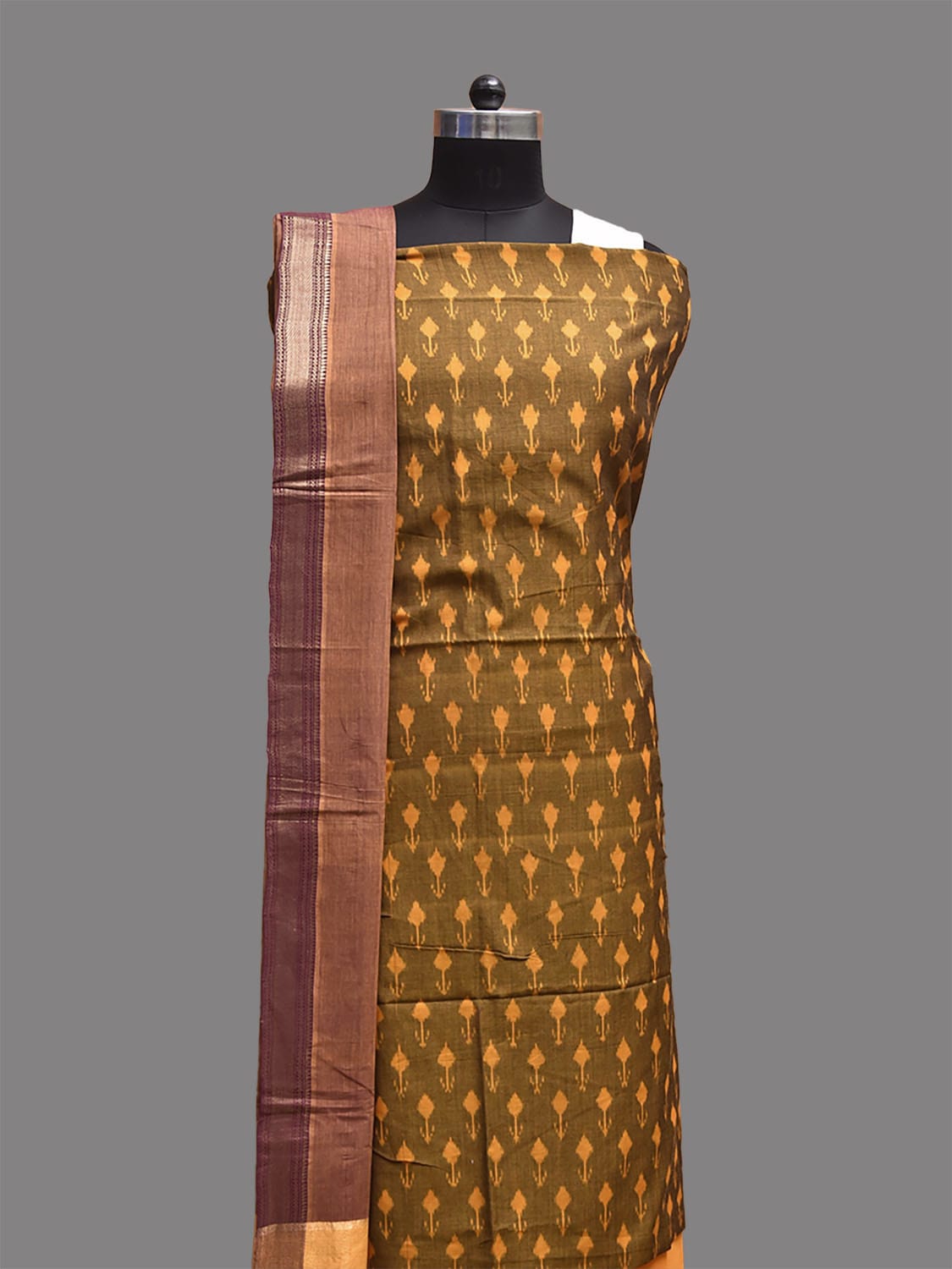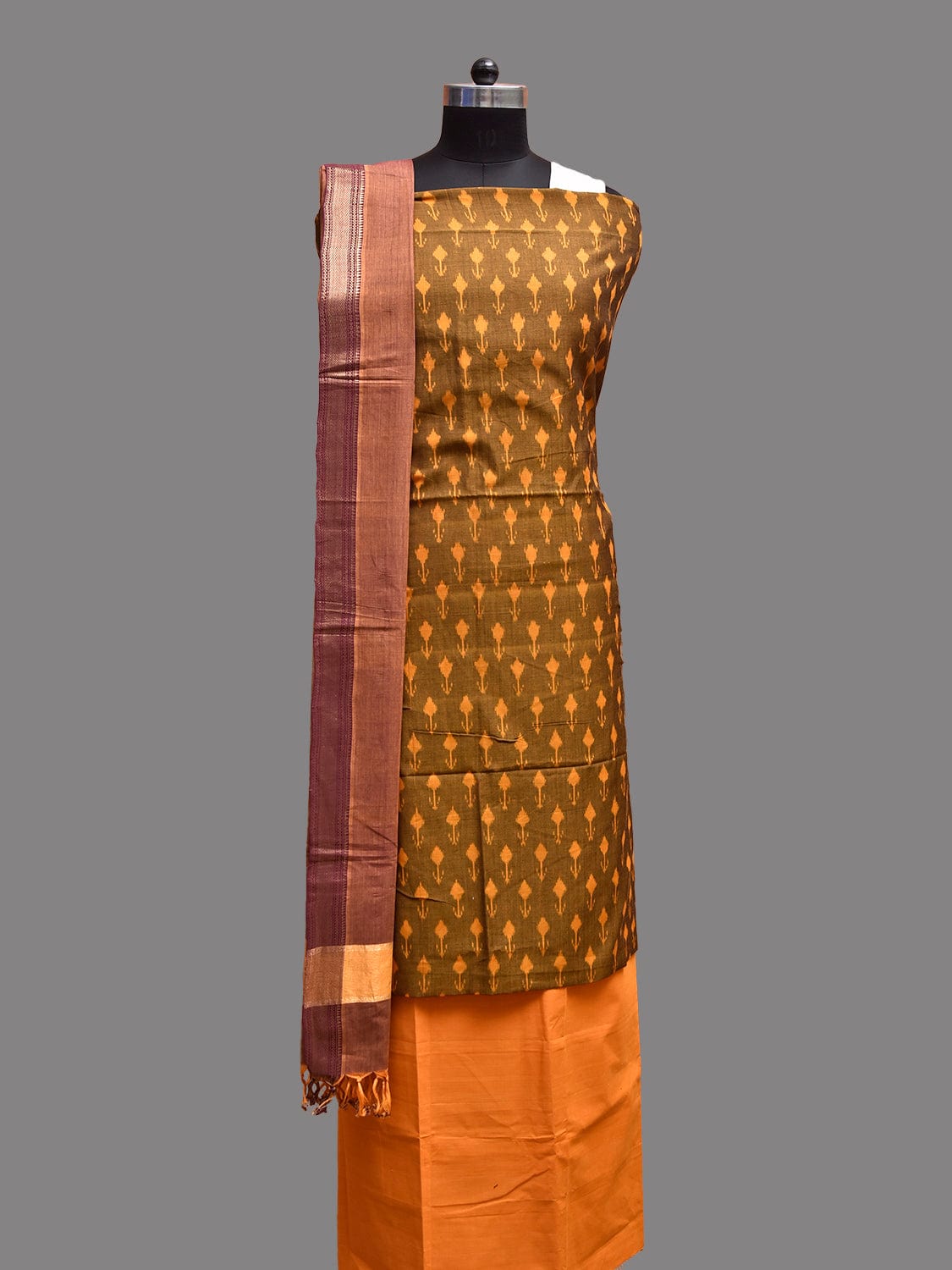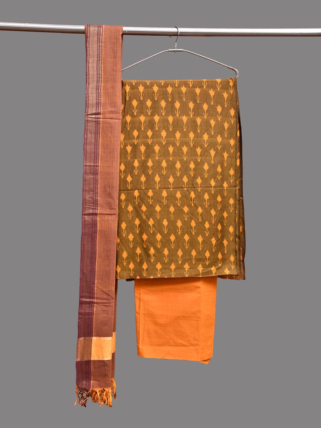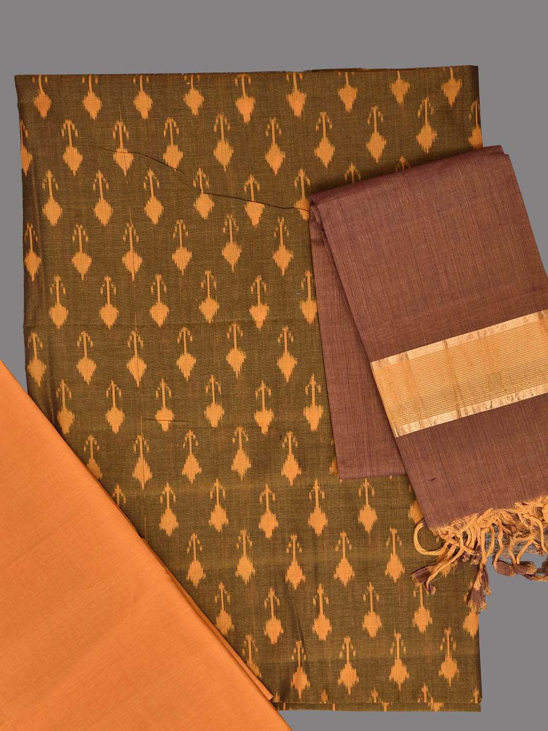Olive and Light Orange Pochampally Ikat Cotton Handloom Dress Material with Top Bottom and Mangalgiri Dupatta. We Advise Gentle Handwash for Fabric Care. Measurements Top - L 2.5mts W 43", Bottom - L 2.2mts W 43", Dupatta - L 2.3mts W 35"