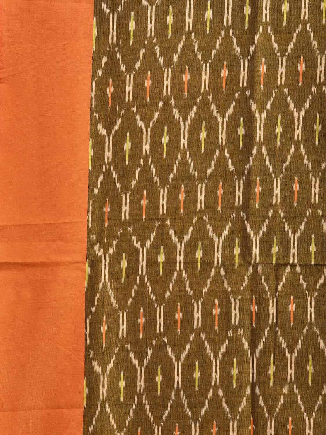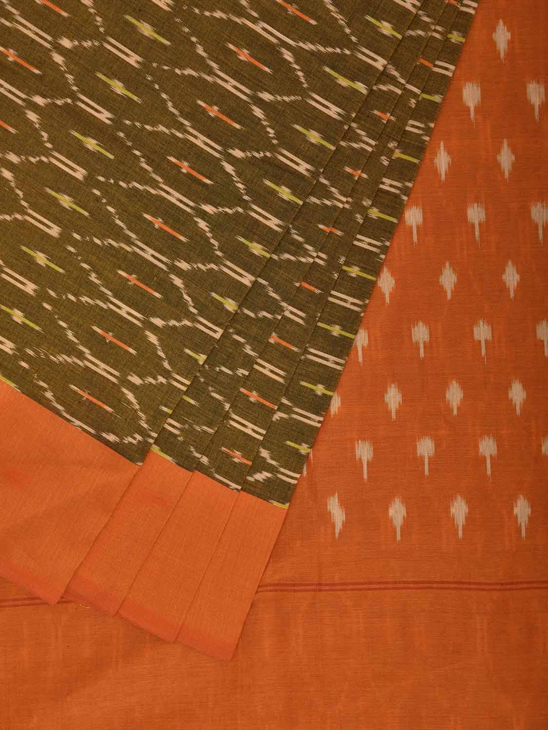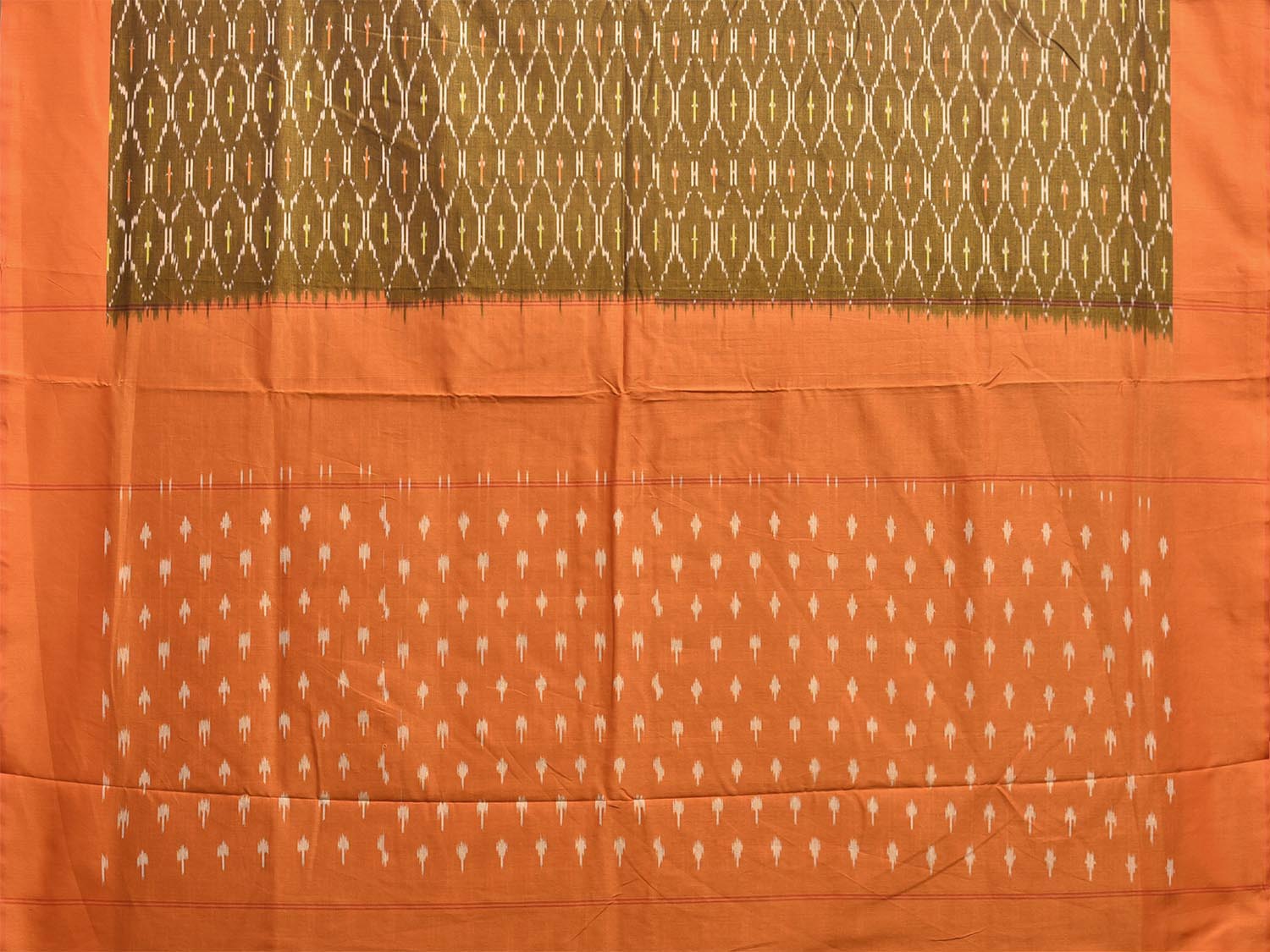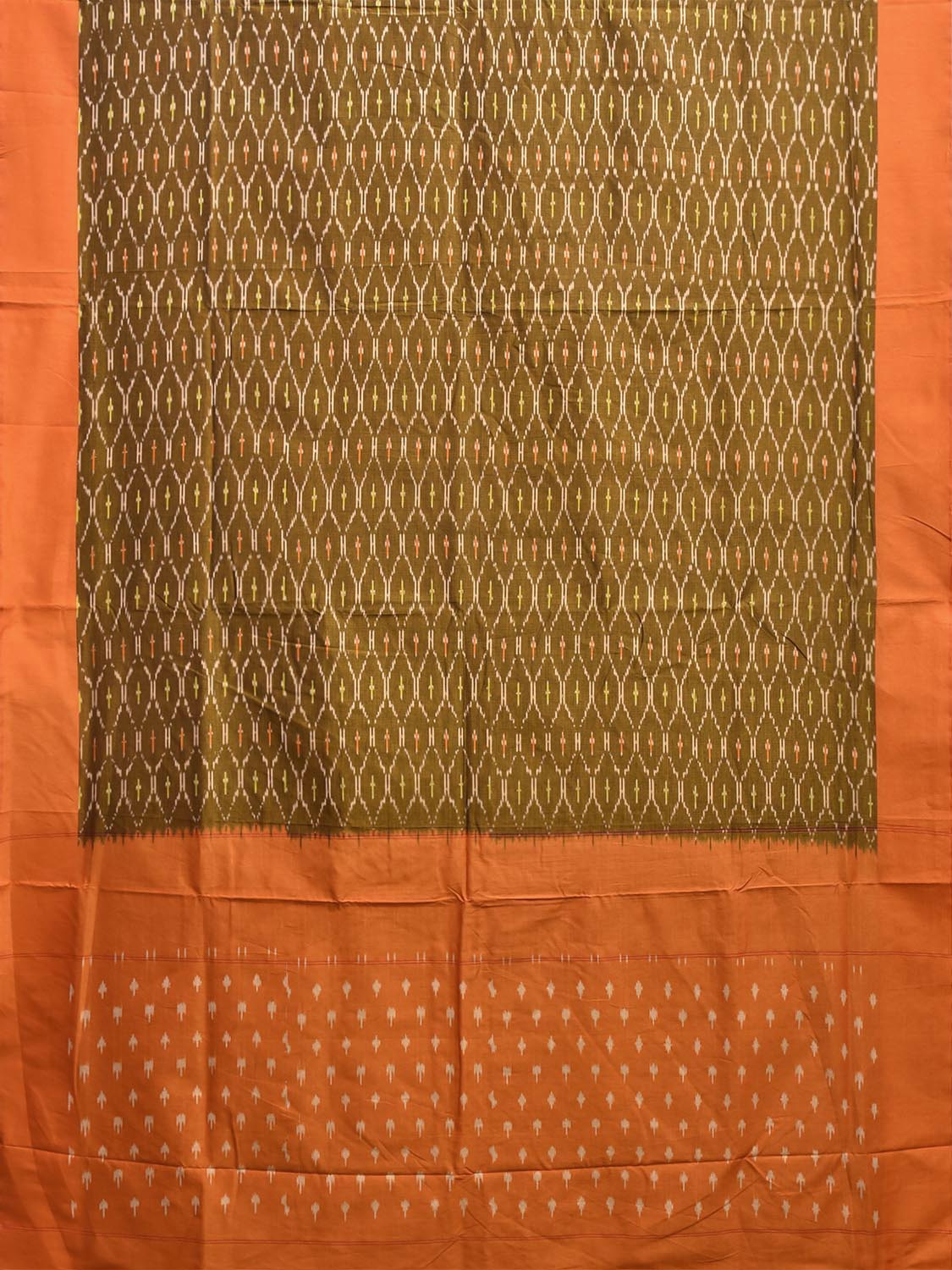 Olive and Orange Pochampally Ikat Cotton Handloom Saree with Grill Body Design No Blouse. This Handloom Saree from Andhra Pradesh has been woven using the resist-dyeing, which produces the unique patterns adorning the fabric. We advise gentle handwash separately for fabric care. This saree has no blouse.