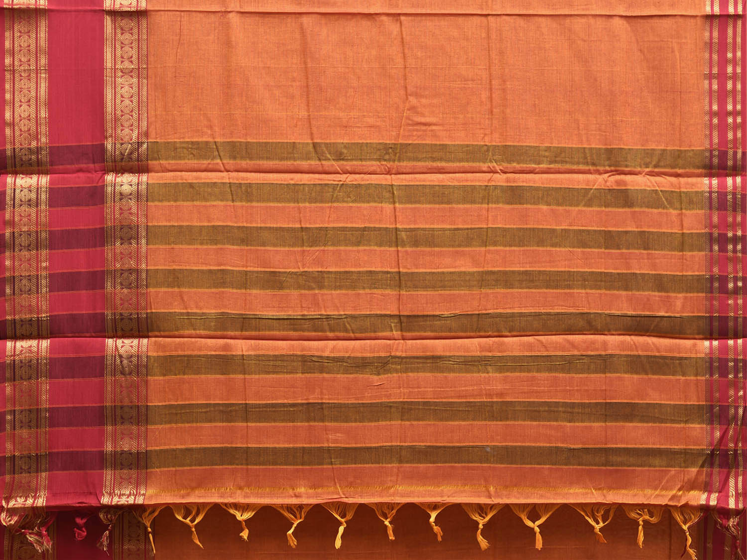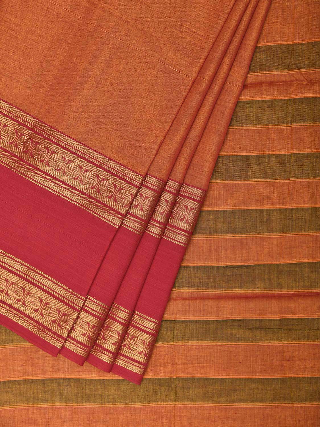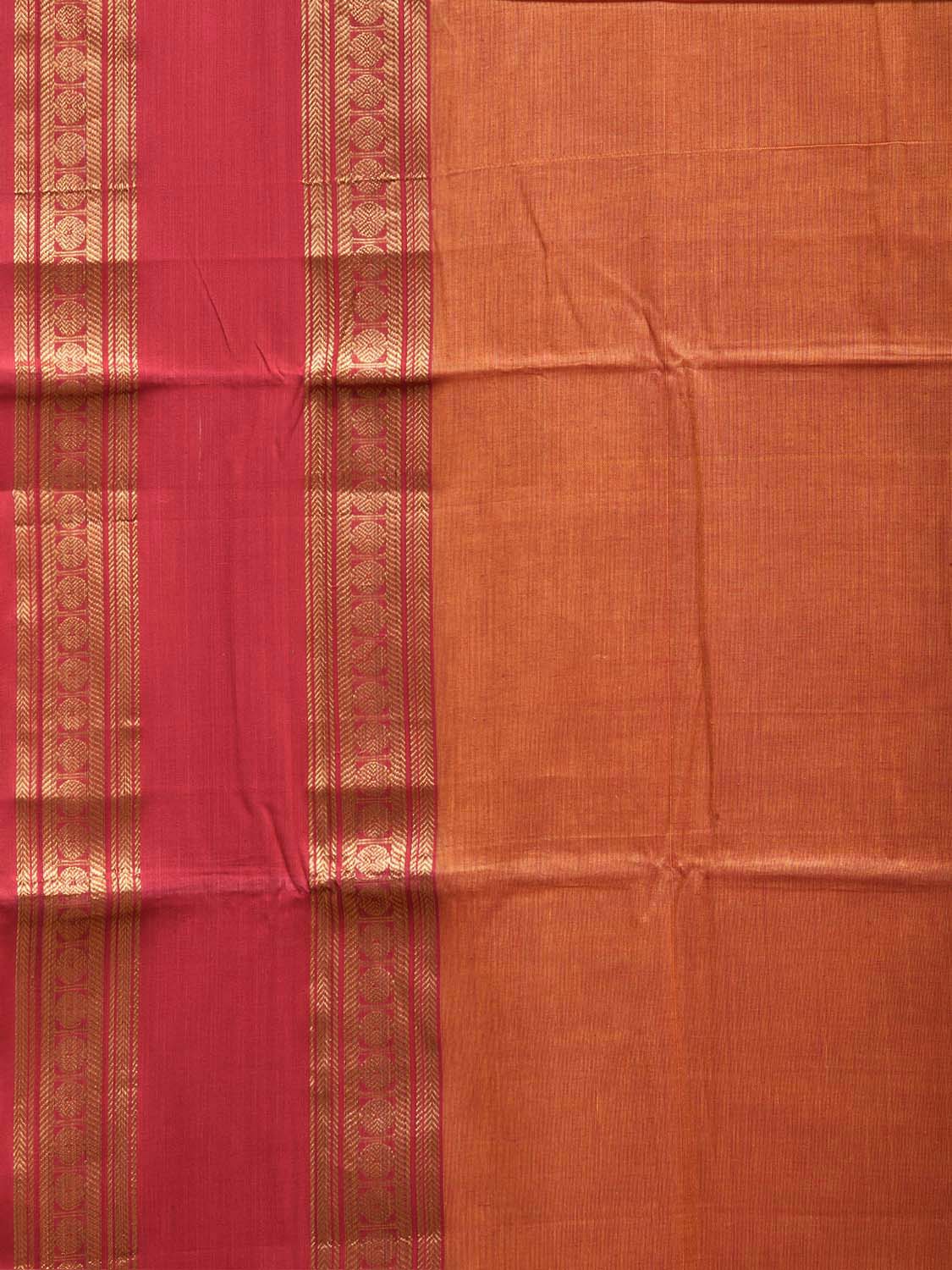 Orange and Red Kanchipuram Cotton Plain Saree with Strips Pallu and Border Design No Blouse. Traditional South Indian Attire Saree for any Special Occasions. For fabric care we advice dry clean. This saree has no blouse.