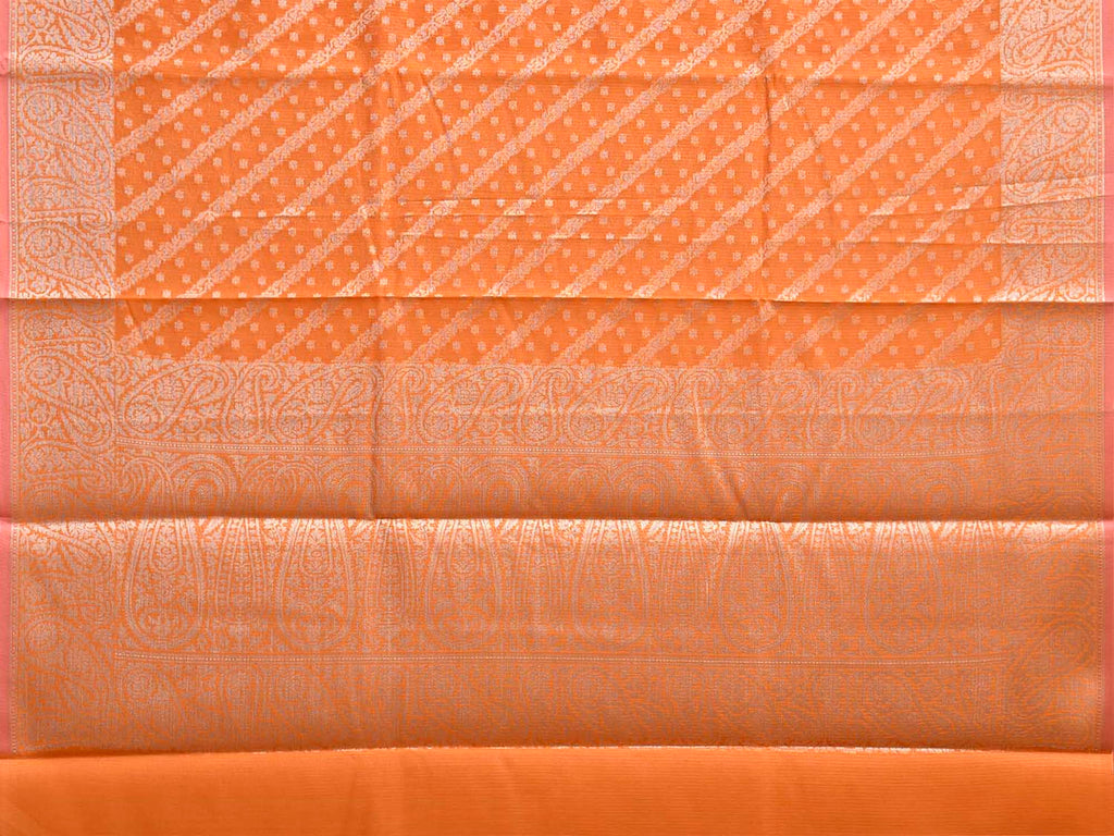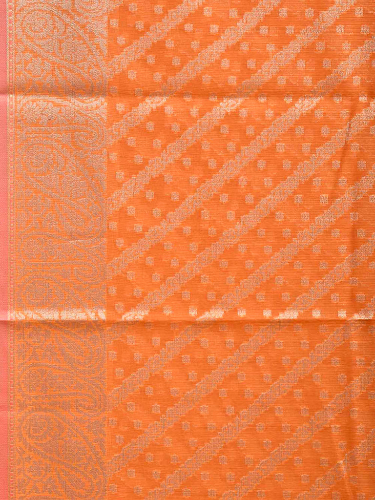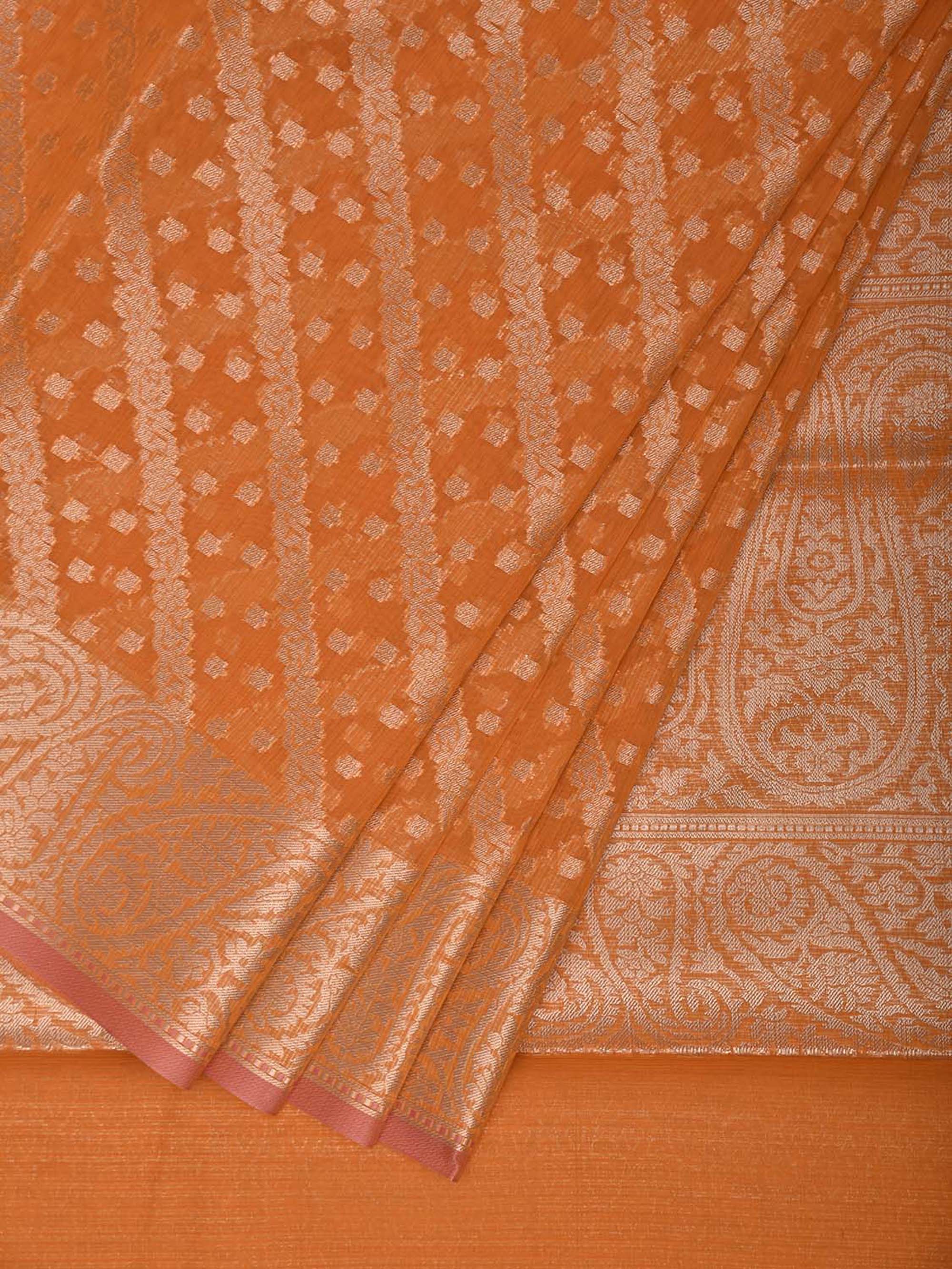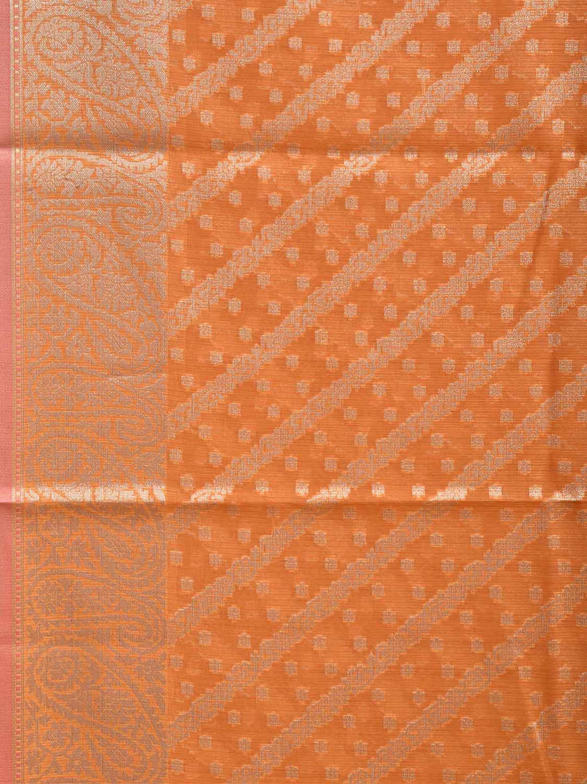 Orange Dhakai Jamdani Cotton Viscose Saree with Diagonal and Pasley Border-Pallu Design. These are some of the traditional Dhakai Jamdani designs, these sarees have geometric designs and sometimes floral or combination of both. We advice gentle handwash separately for fabric care.
