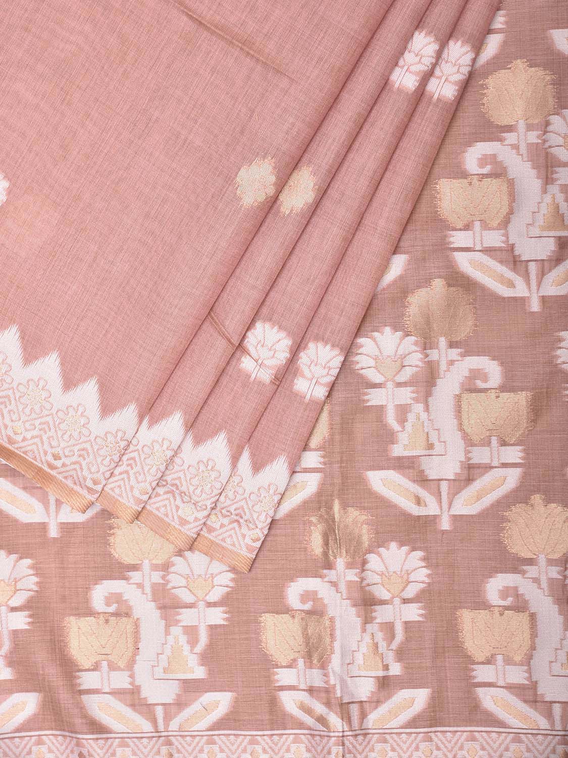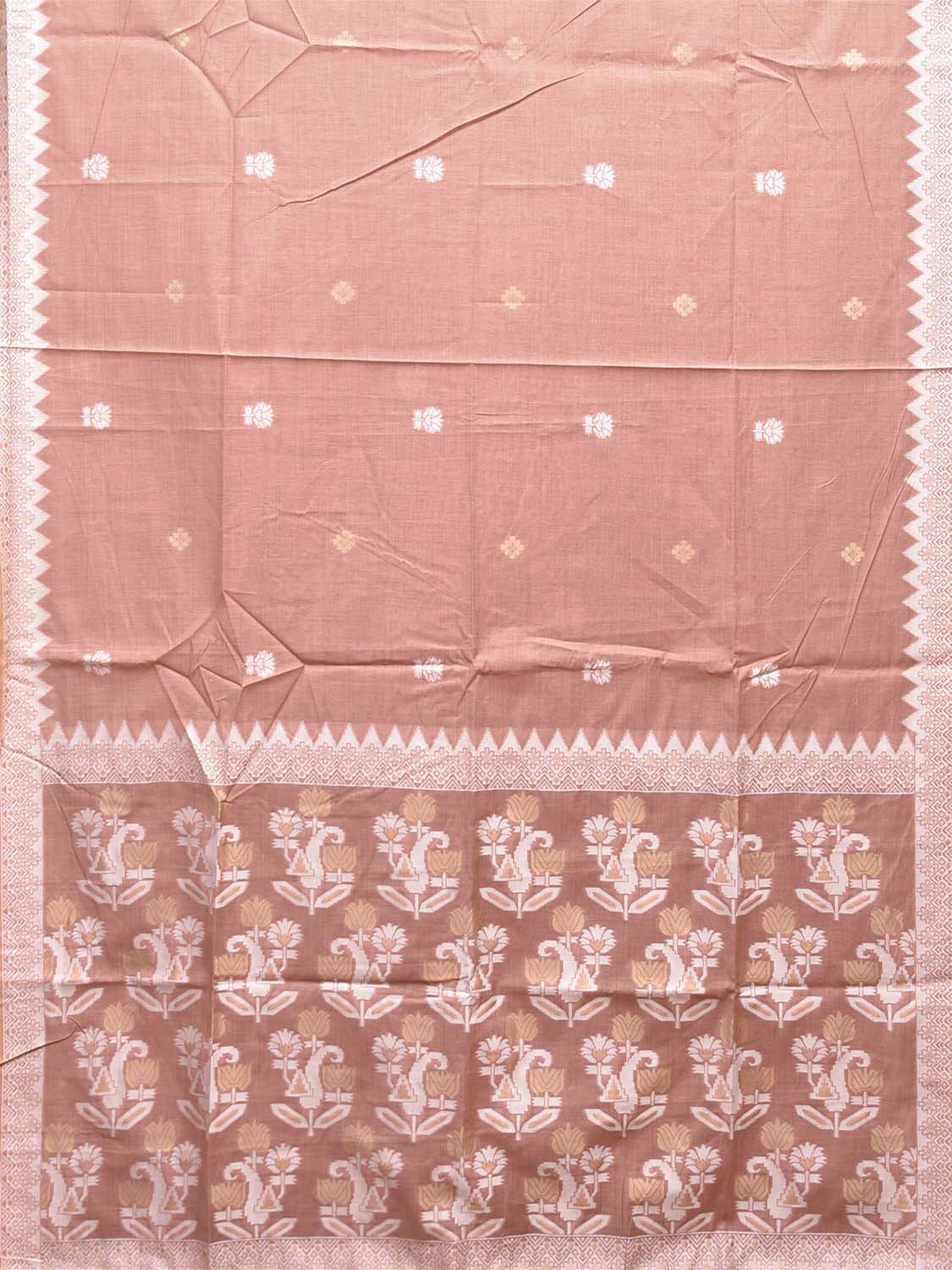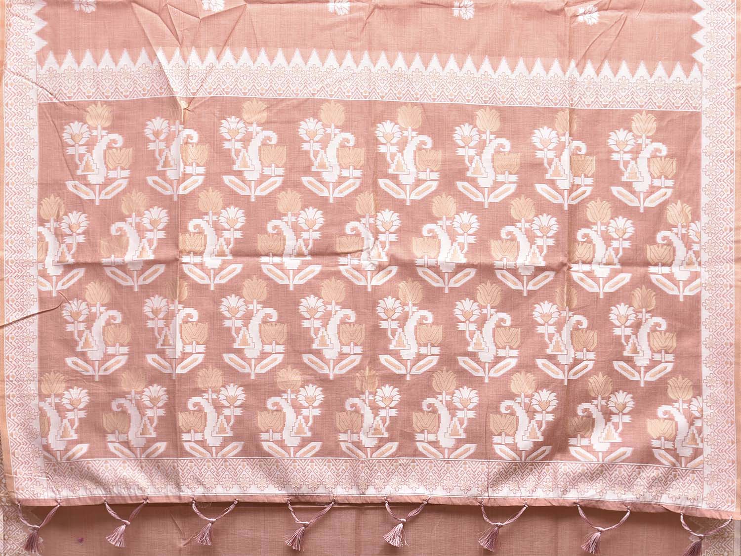 Peach Dhakai Jamdani Cotton Viscose Saree with Pallu and Buta Design. These are some of the traditional Dhakai Jamdani designs, these sarees have geometric designs and sometimes floral or combination of both. We advice gentle handwash separately for fabric care.