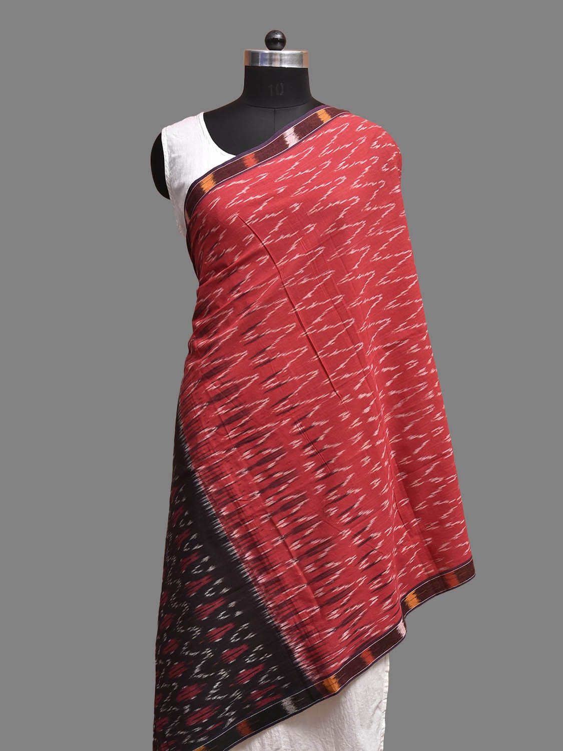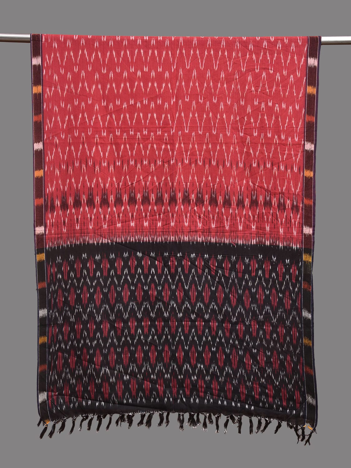 Red and Black Pochampally Ikat Cotton Handloom Dupatta with Zig-Zag Design. This Handloom Saree has been woven using the resist-dyeing, which produces the unique patterns adorning the fabric. We advise gentle handwash separately for fabric care.