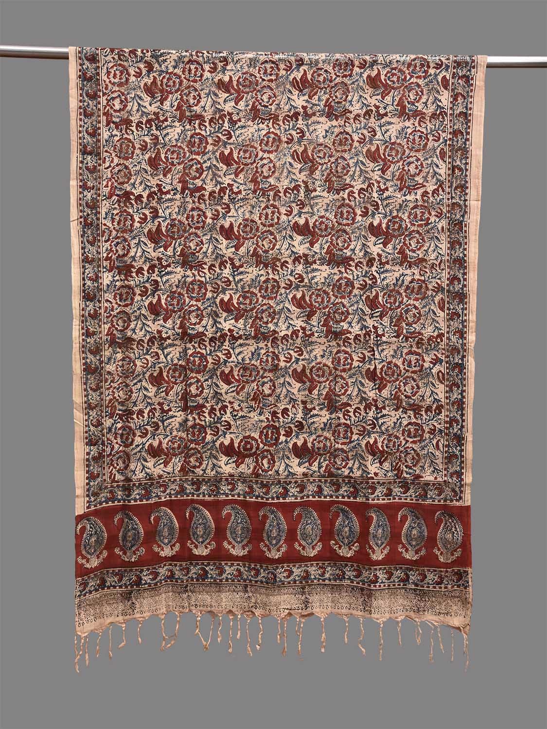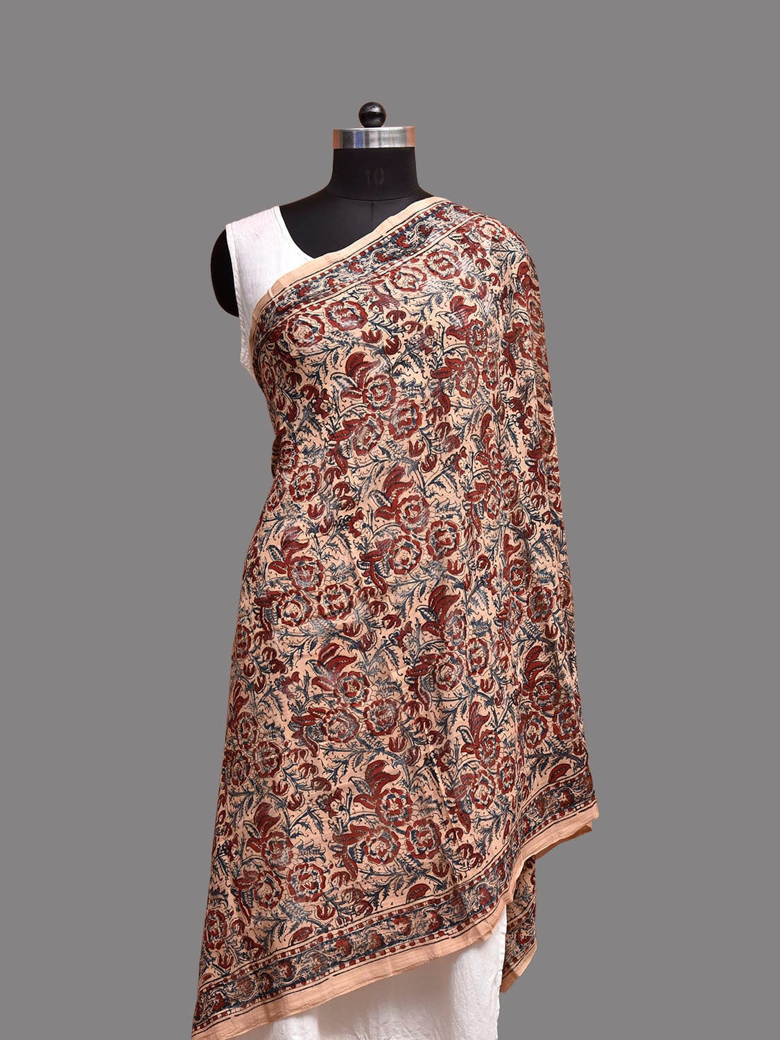 Red and Cream Kalamkari Block Print Cotton Dupatta with Floral Design. We advise gentle handwash separately for fabric care.