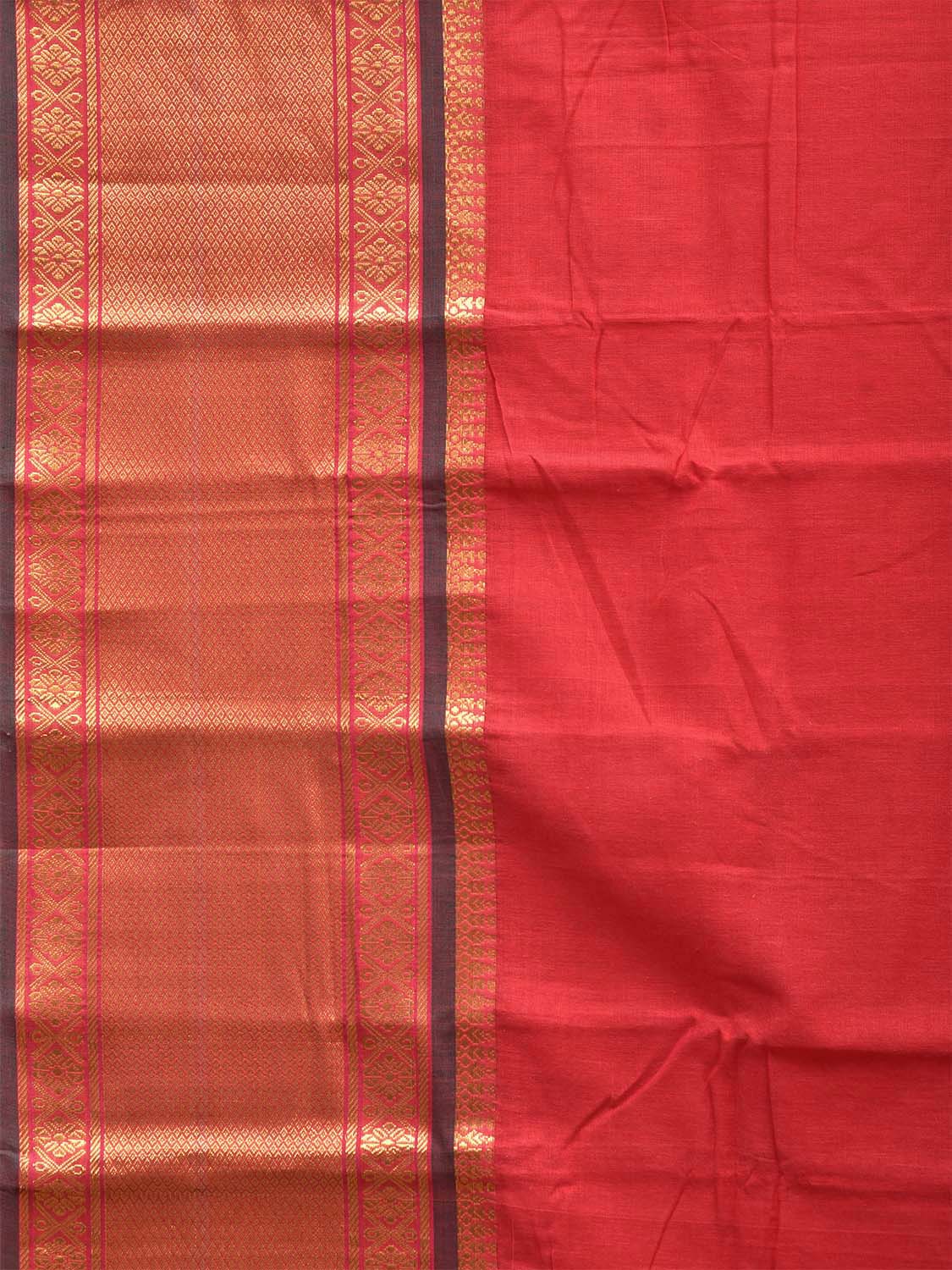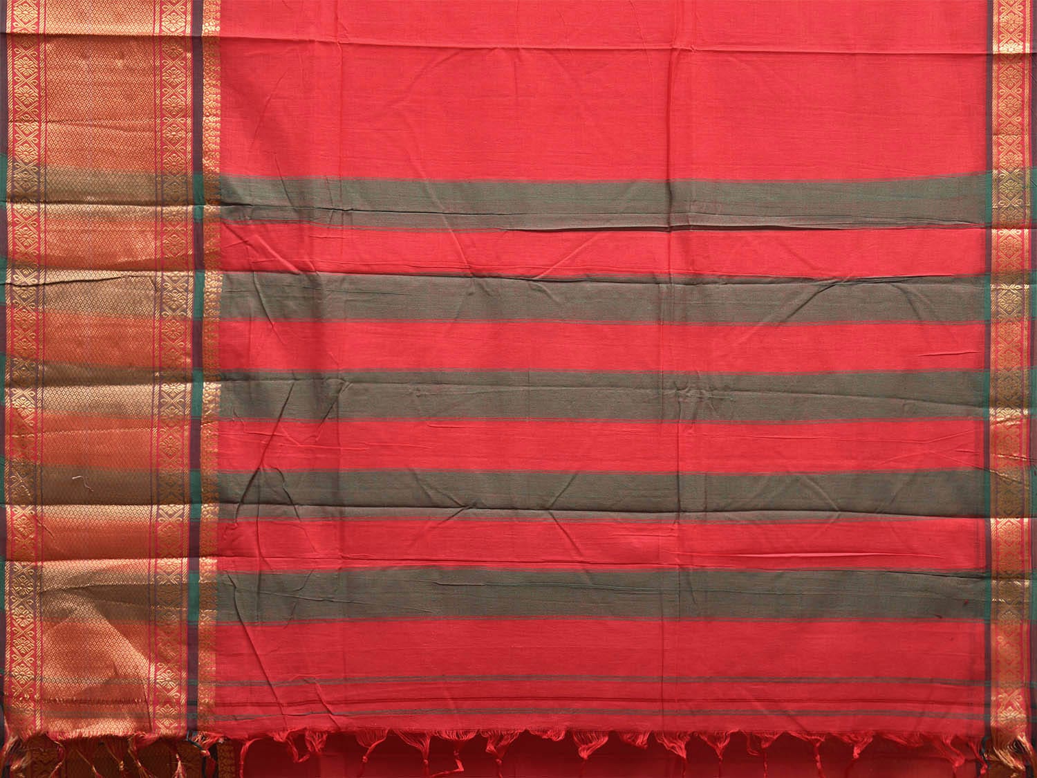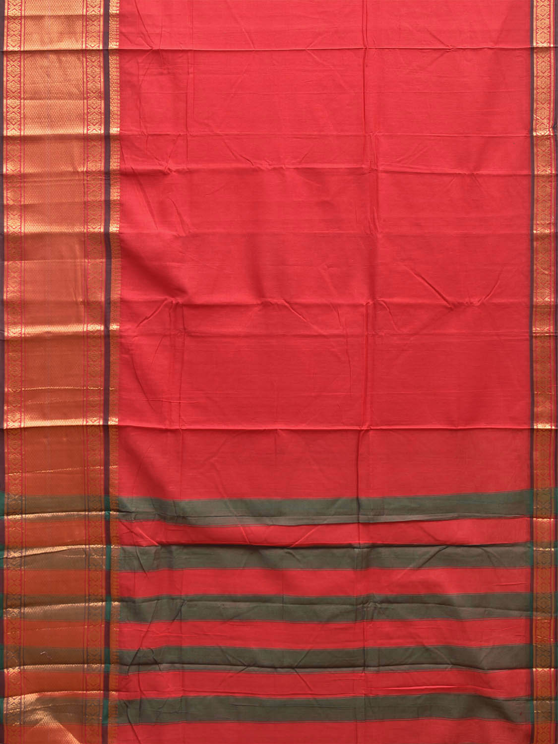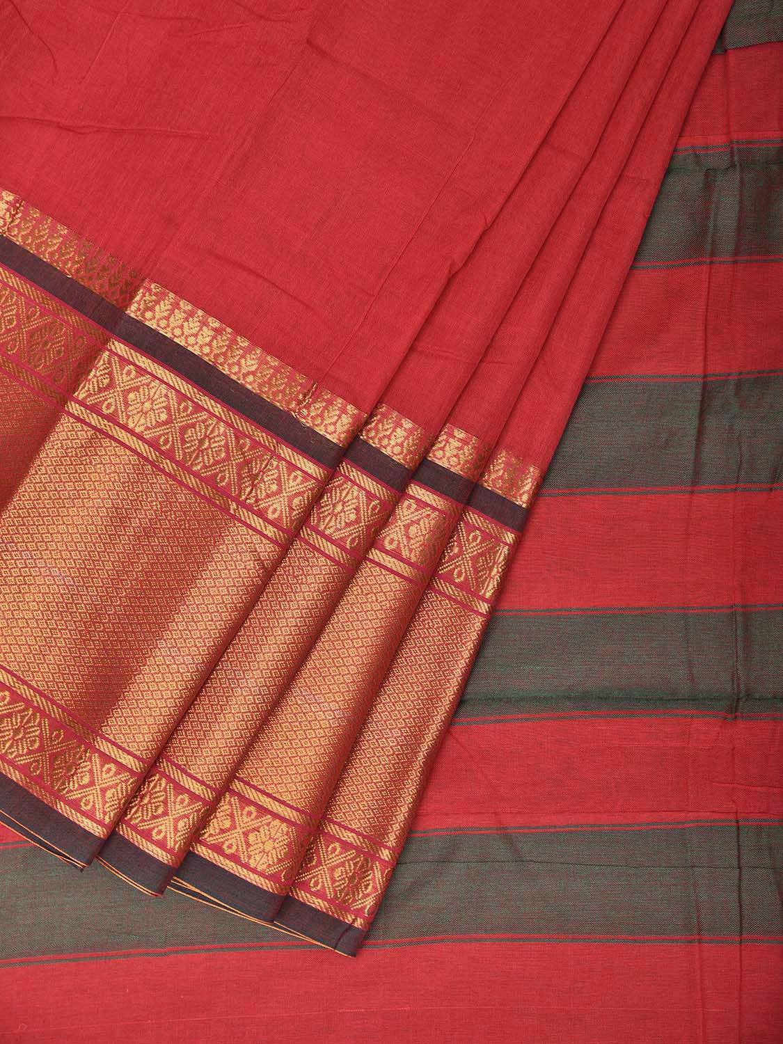 Red and Green Kanchipuram Cotton Plain Saree with Strips Pallu and Border Design No Blouse. Traditional South Indian Attire Saree for any Special Occasions. For fabric care we advice dry clean. This saree has no blouse.