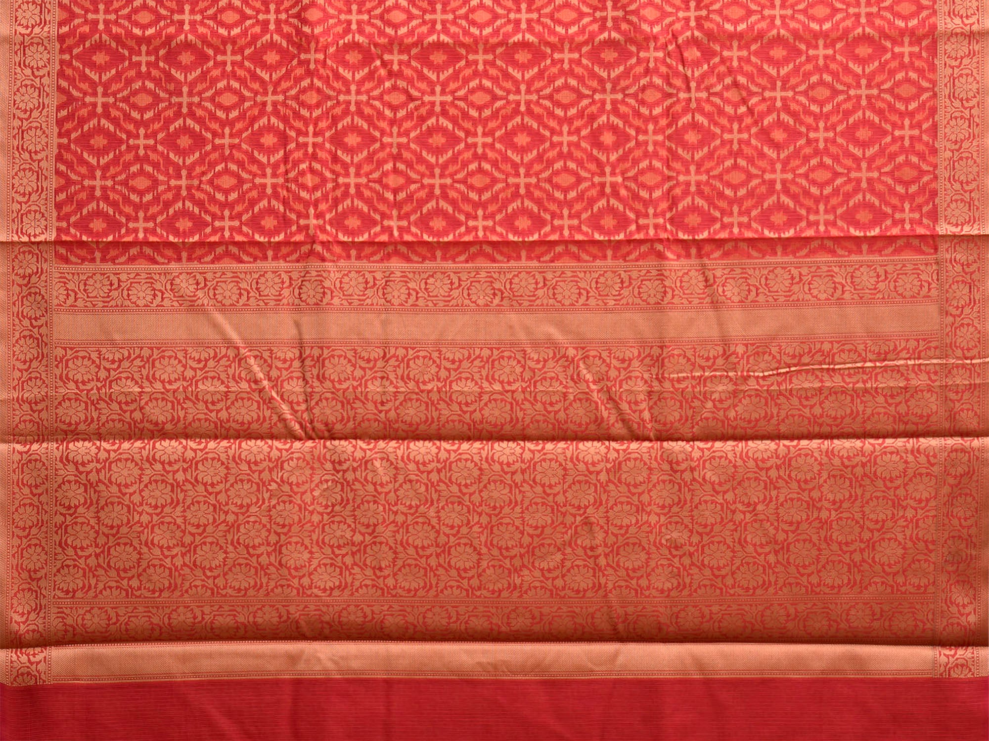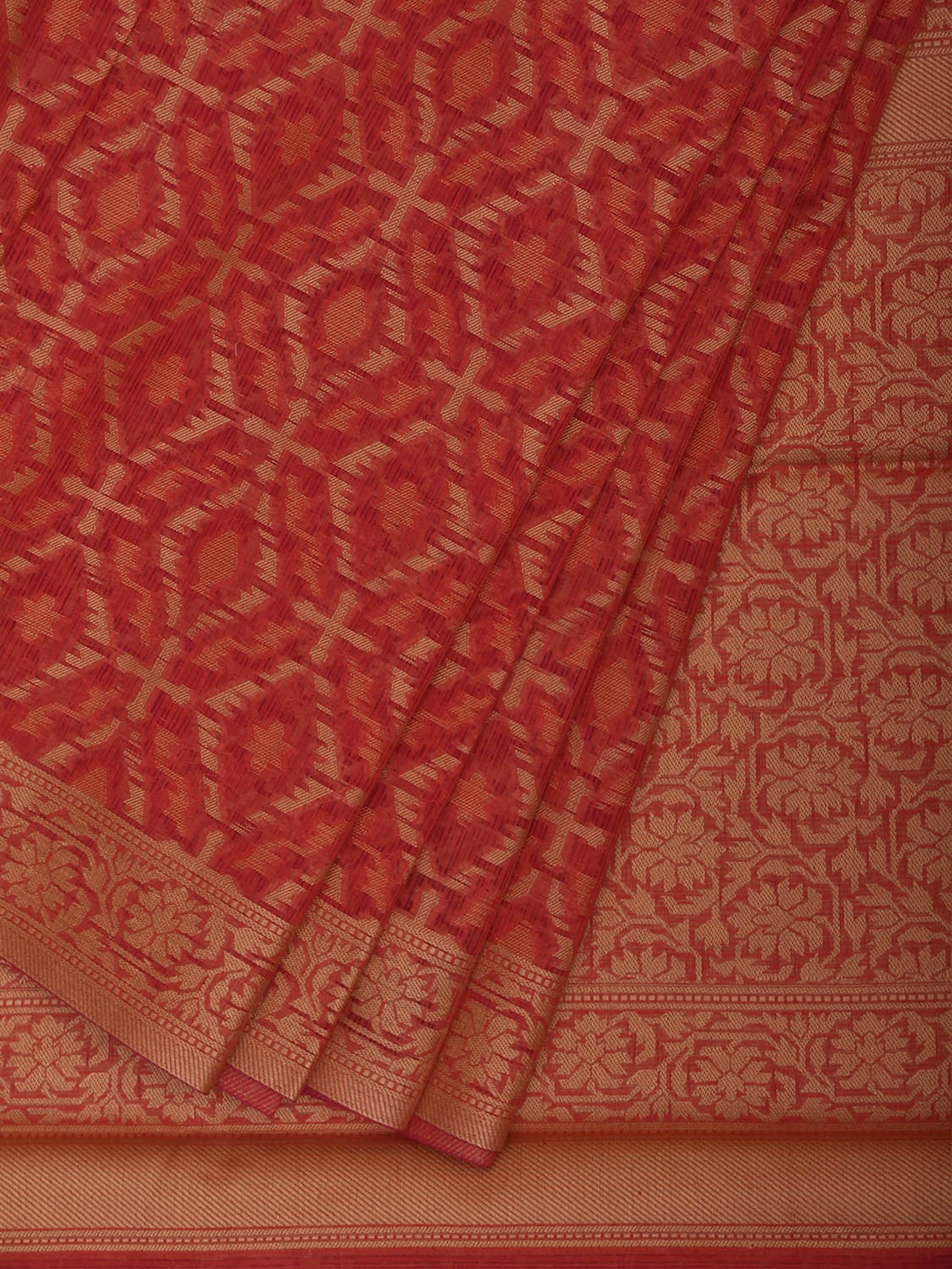 Red Dhakai Jamdani Cotton Viscose Saree with All Over and Floral Pallu Design. These are some of the traditional Dhakai Jamdani designs, these sarees have geometric designs and sometimes floral or combination of both. We advice gentle handwash separately for fabric care.