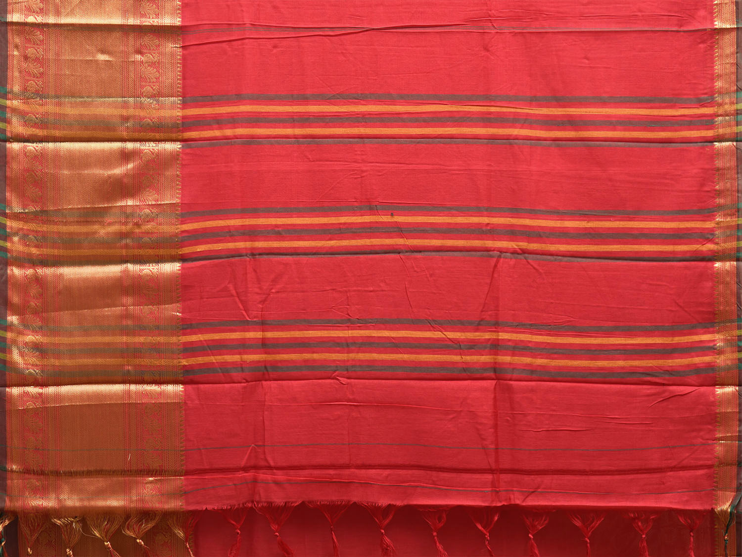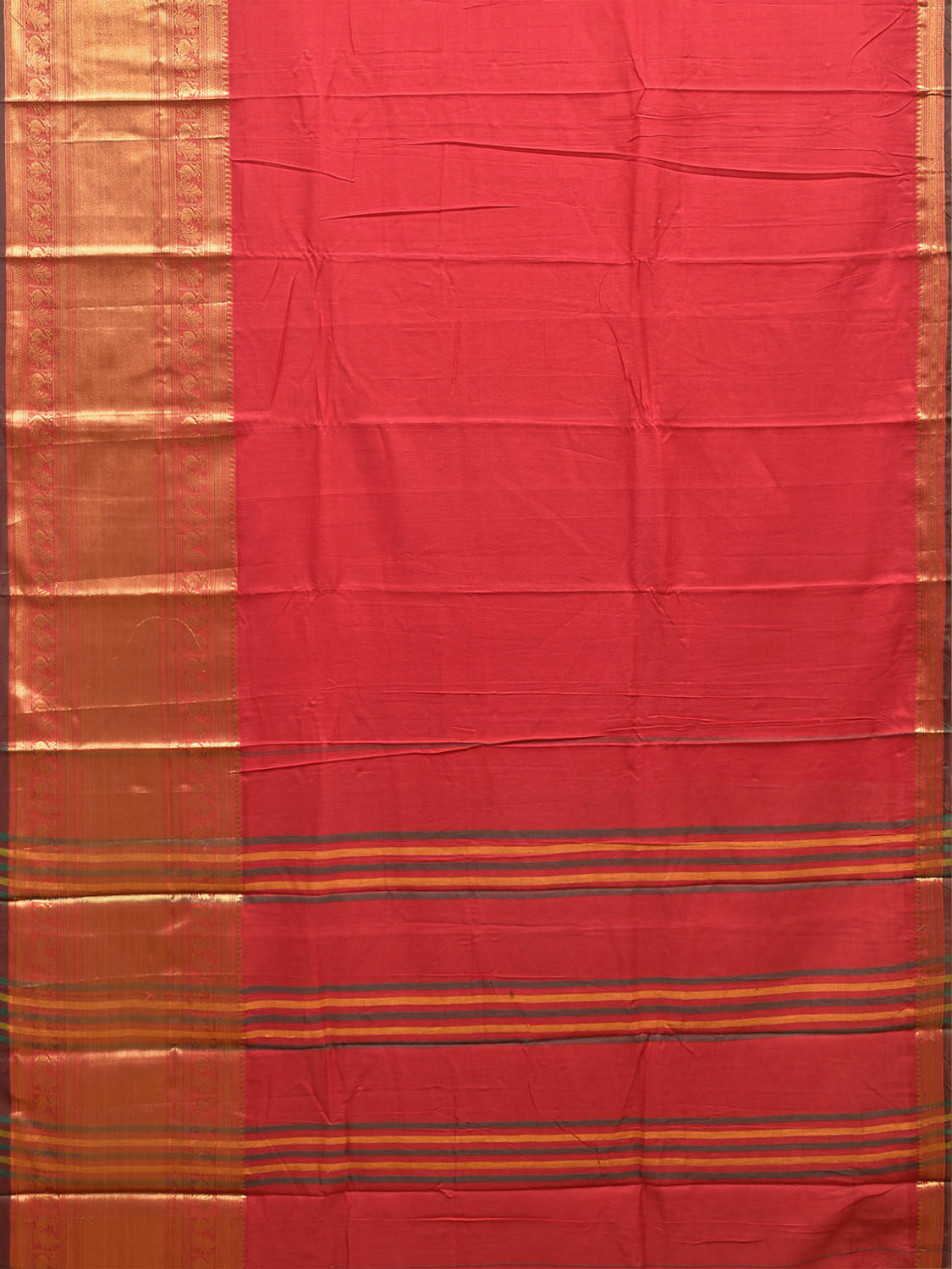 Red Narayanpet Cotton Plain Saree with Big Border and Strips Pallu Design No Blouse. This saree has no blouse.