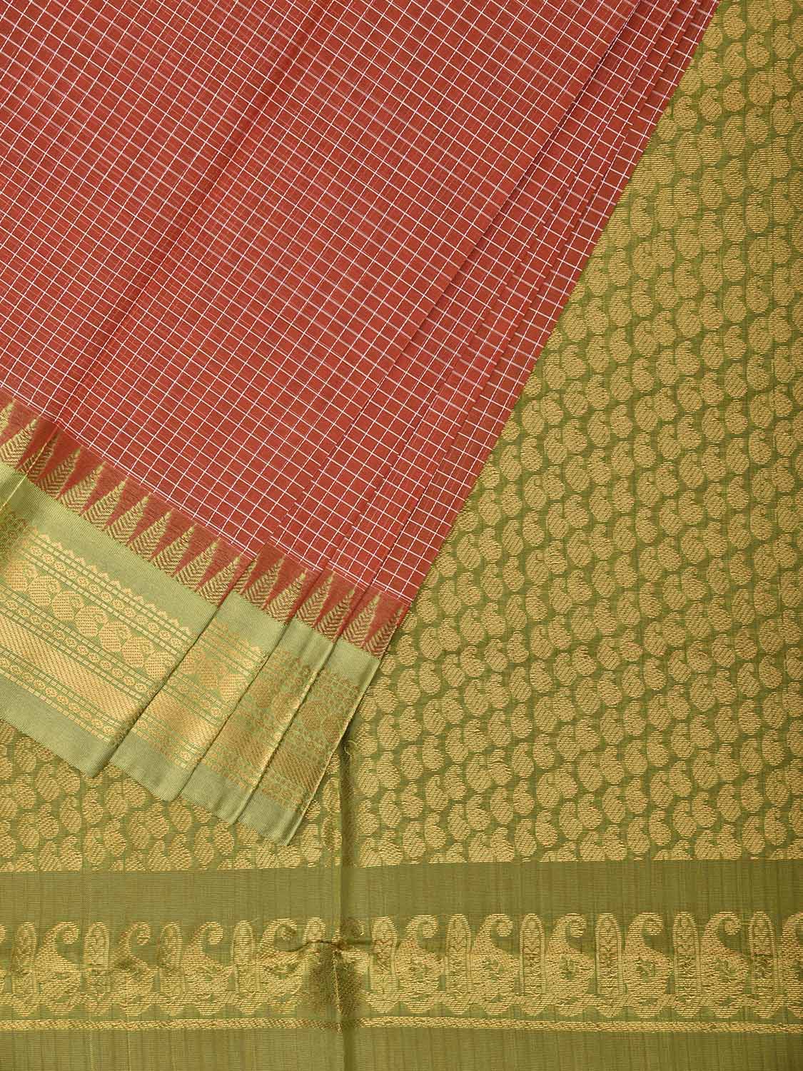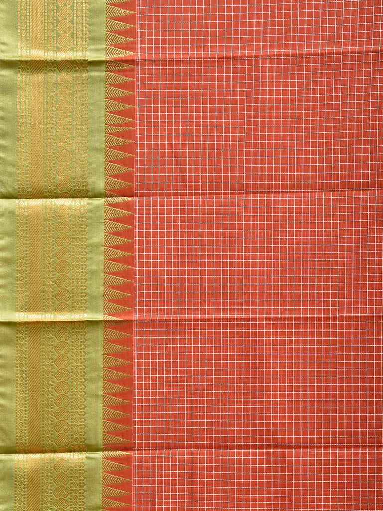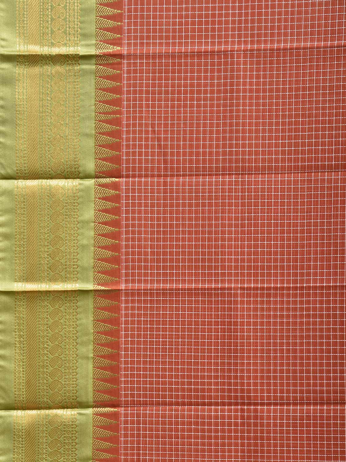 Rust and Light Green Gadwal Cotton Viscose Saree with Checks and Pallu Design No Blouse. Gadwal Sarees are known for their traditional design of border and pallu made of silk and body being either cotton or silk. They are known as Sico sarees for border and pallu being silk and body being cotton. We advice dry clean for fabric care. This saree has no blouse.