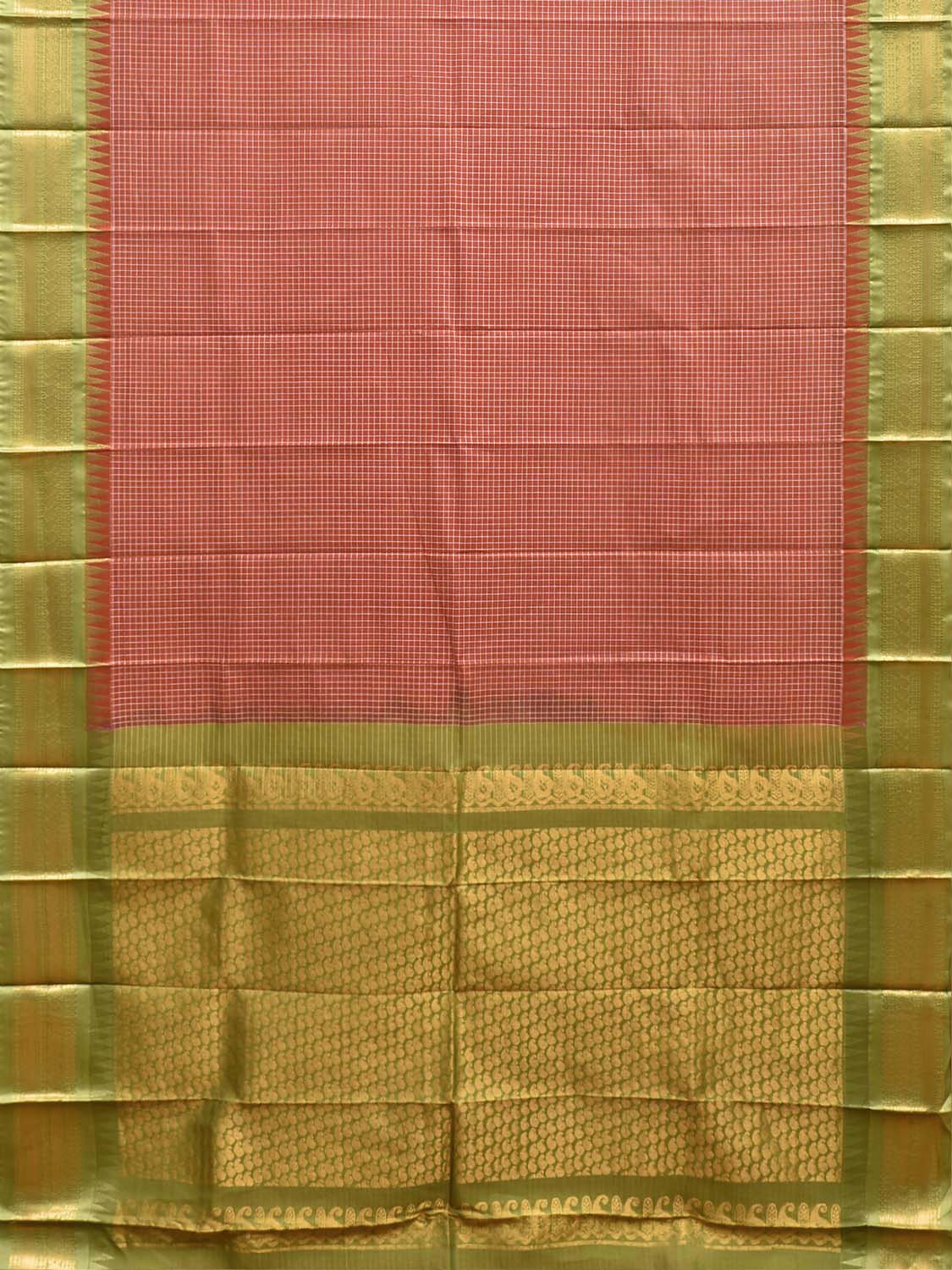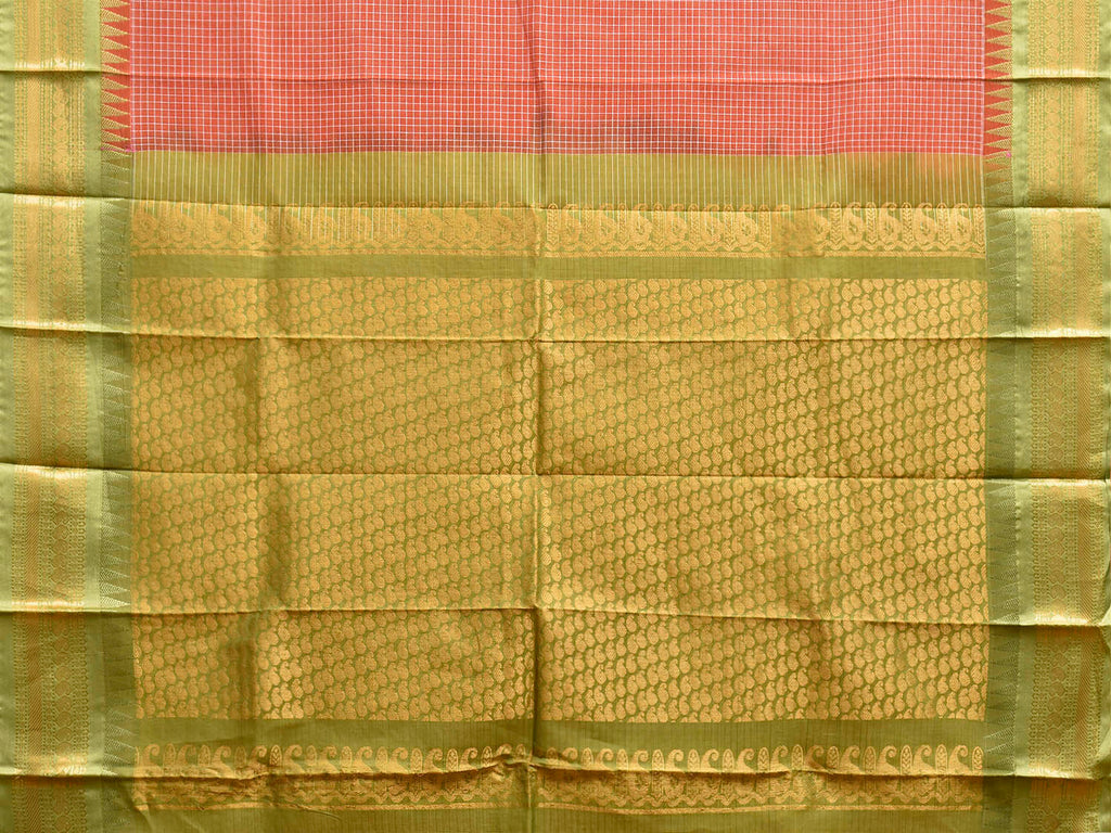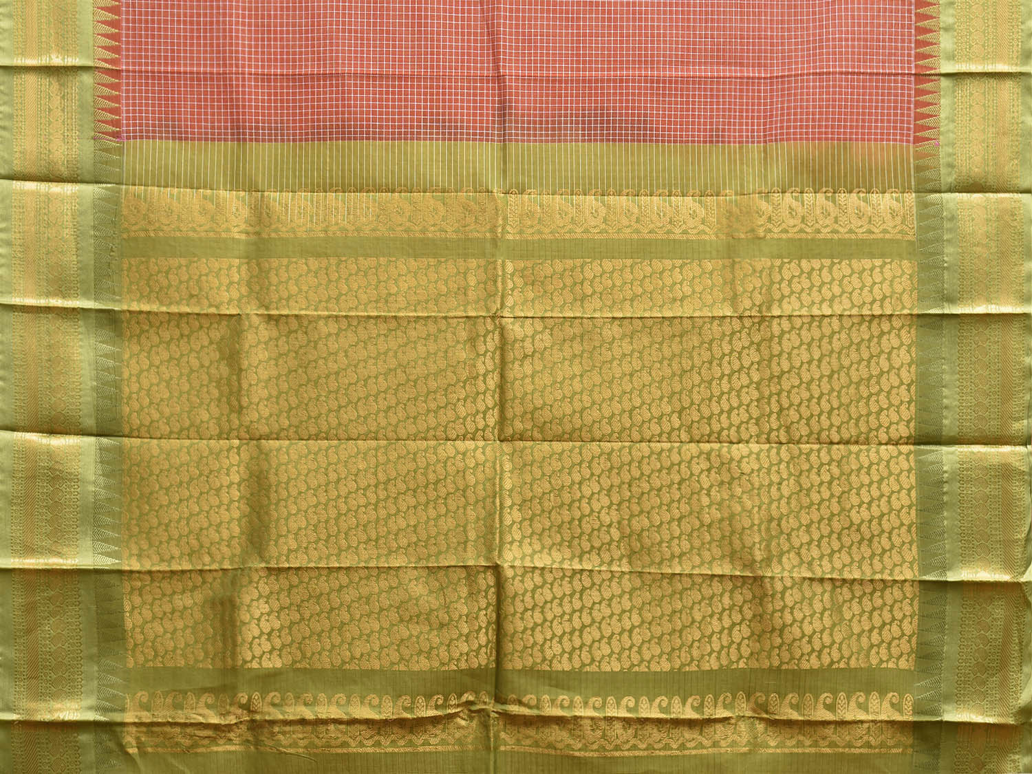 Rust and Light Green Gadwal Cotton Viscose Saree with Checks and Pallu Design No Blouse. Gadwal Sarees are known for their traditional design of border and pallu made of silk and body being either cotton or silk. They are known as Sico sarees for border and pallu being silk and body being cotton. We advice dry clean for fabric care. This saree has no blouse.