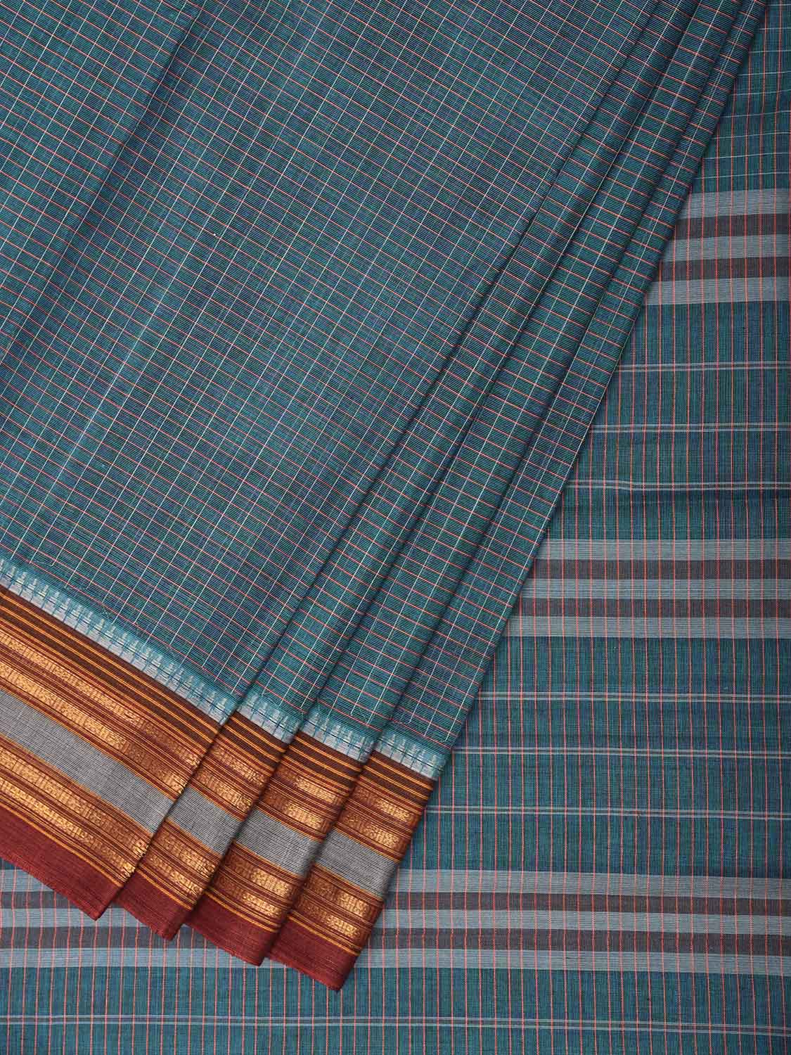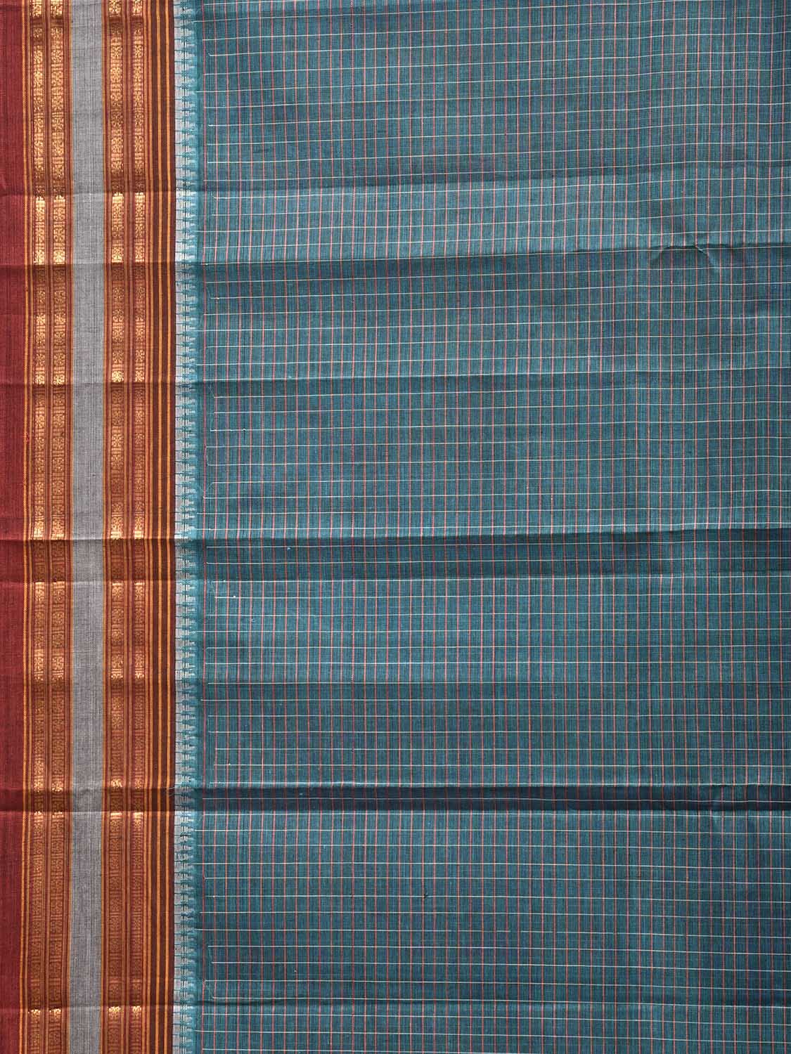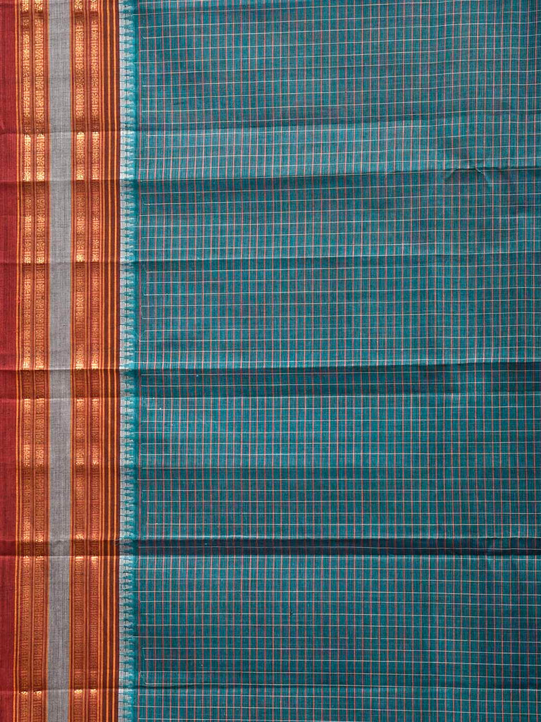 Teal and Dark Red Narayanpet Cotton Saree with Checks Design No Blouse. This saree has no blouse.