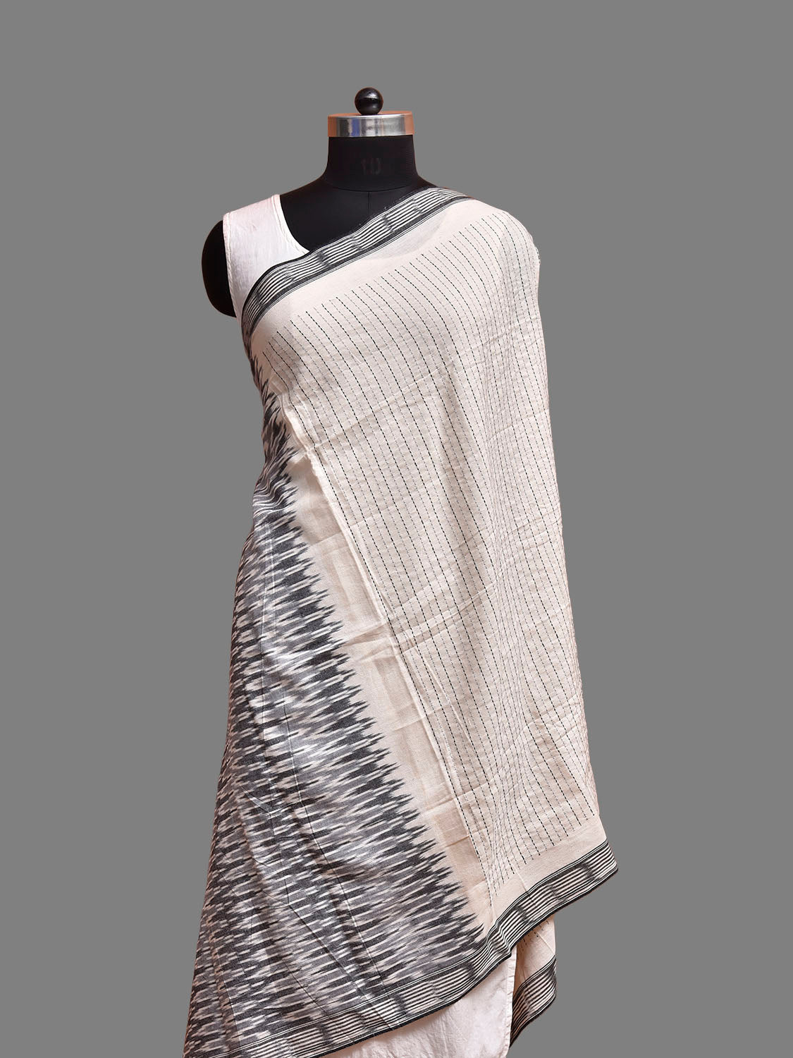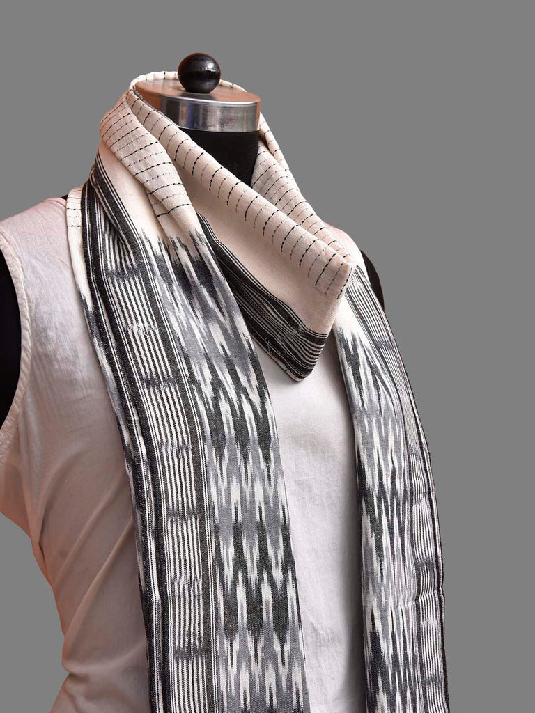 White and Grey Pochampally Ikat Cotton Handloom Dupatta with Embroidary Strips Design. This Handloom Dupatta has been woven using the resist-dyeing, which produces the unique patterns adorning the fabric. We advise gentle handwash separately for fabric care.