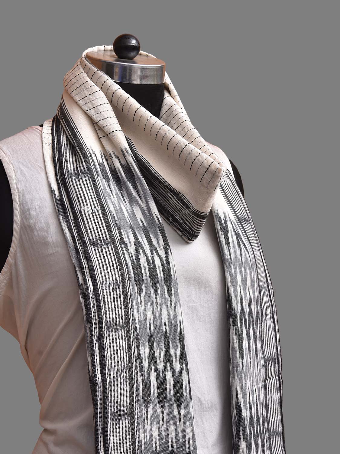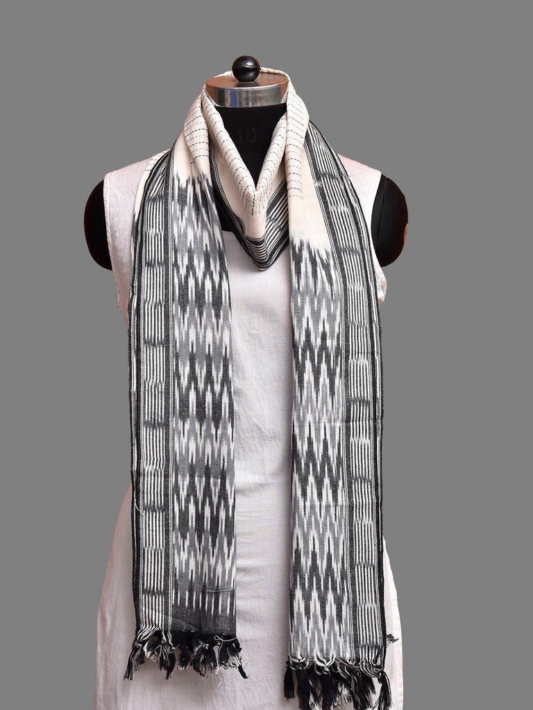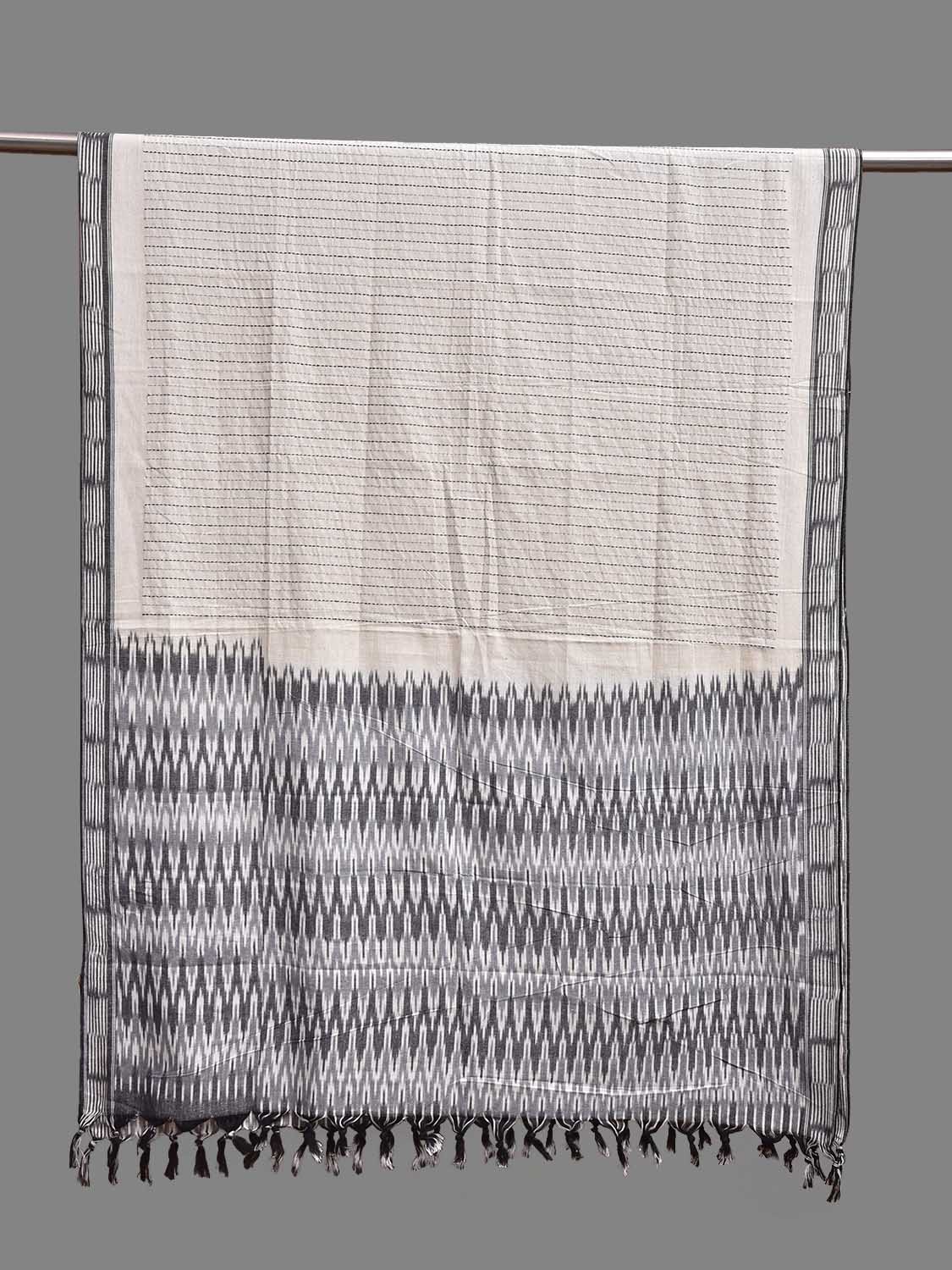 White and Grey Pochampally Ikat Cotton Handloom Dupatta with Embroidary Strips Design ds3954