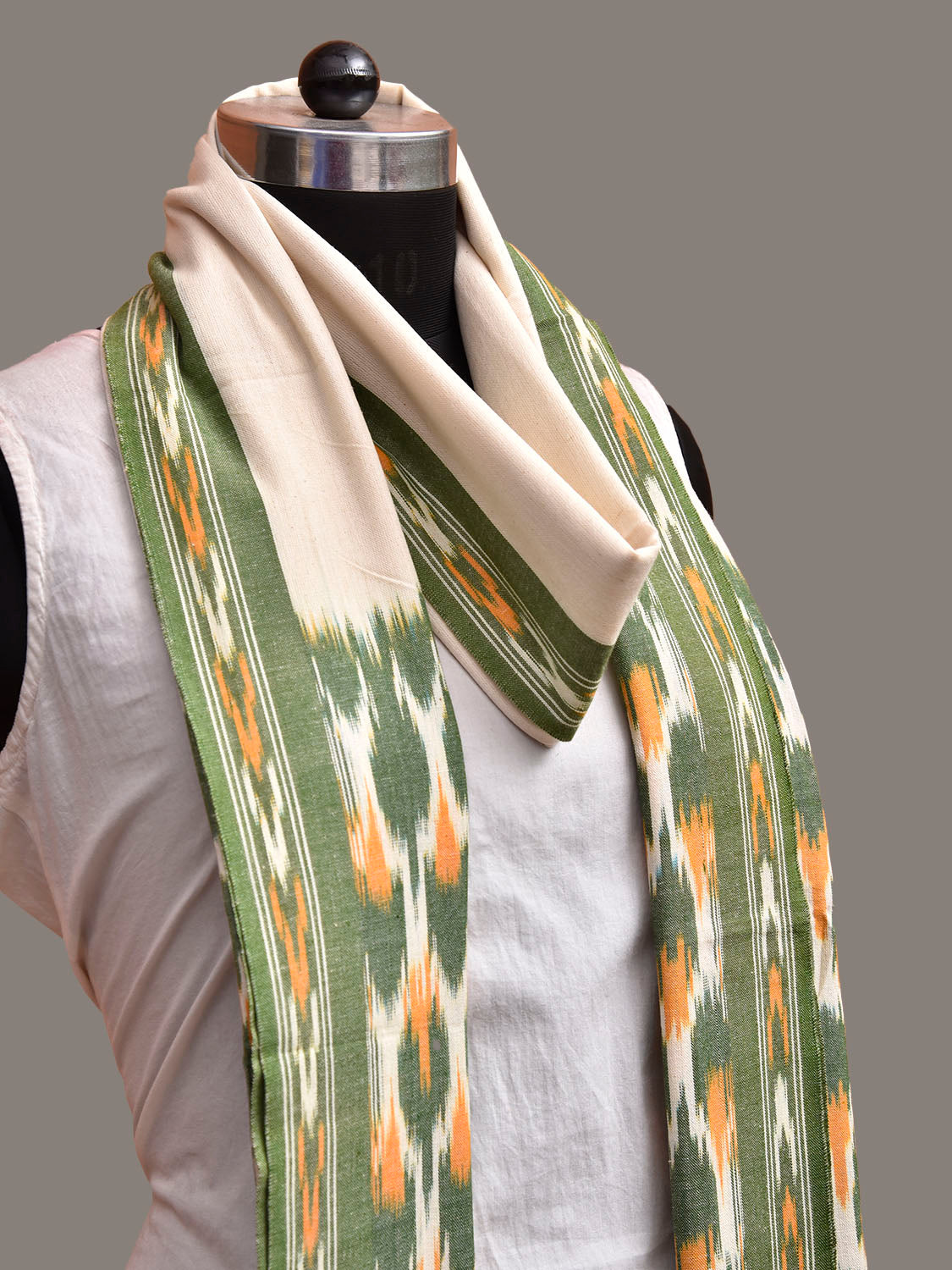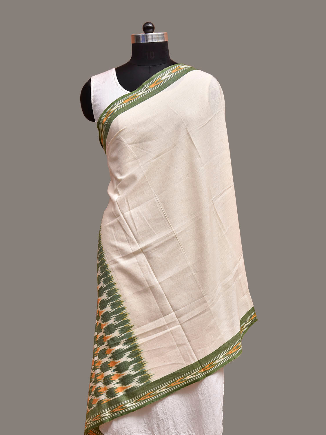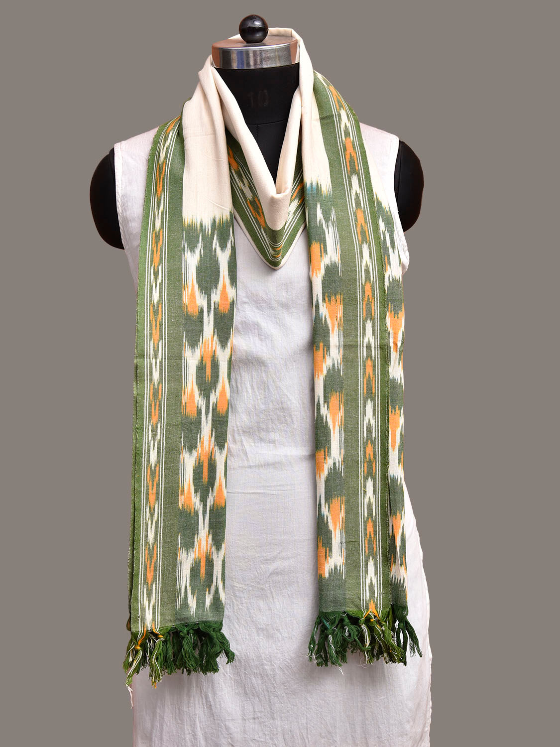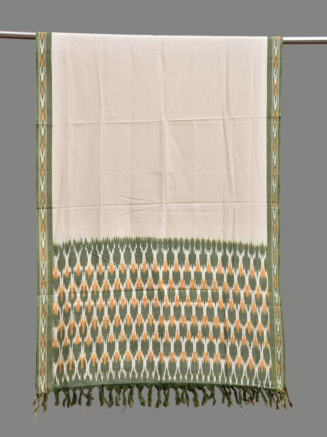 White and Light Green Pochampally Ikat Cotton Handloom Dupatta with Grill Pallu Design. This Handloom Dupatta has been woven using the resist-dyeing, which produces the unique patterns adorning the fabric. We advise gentle handwash separately for fabric care.