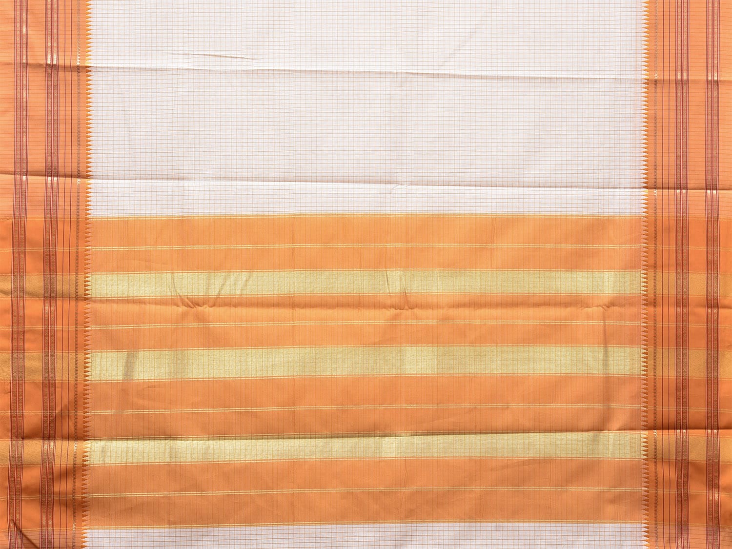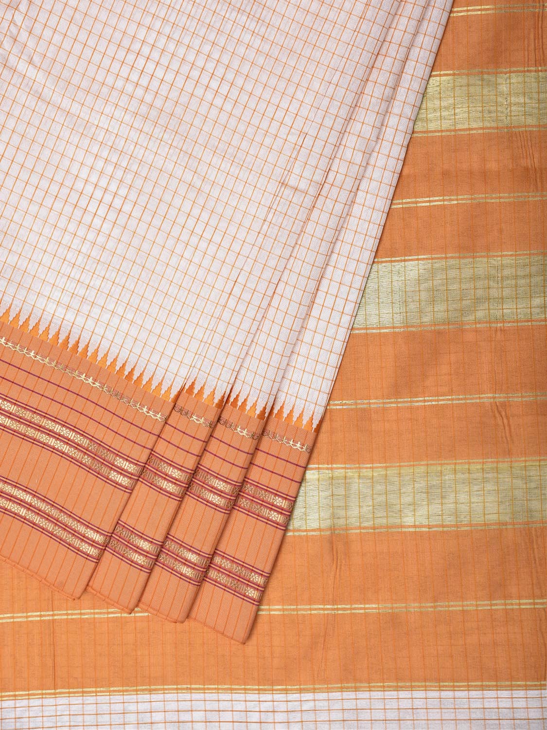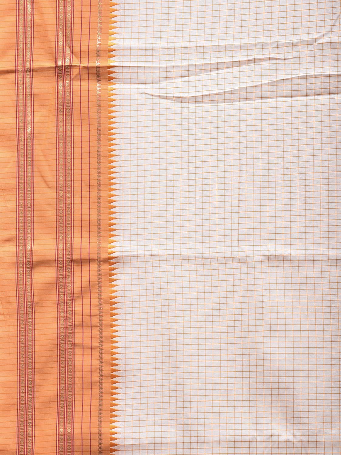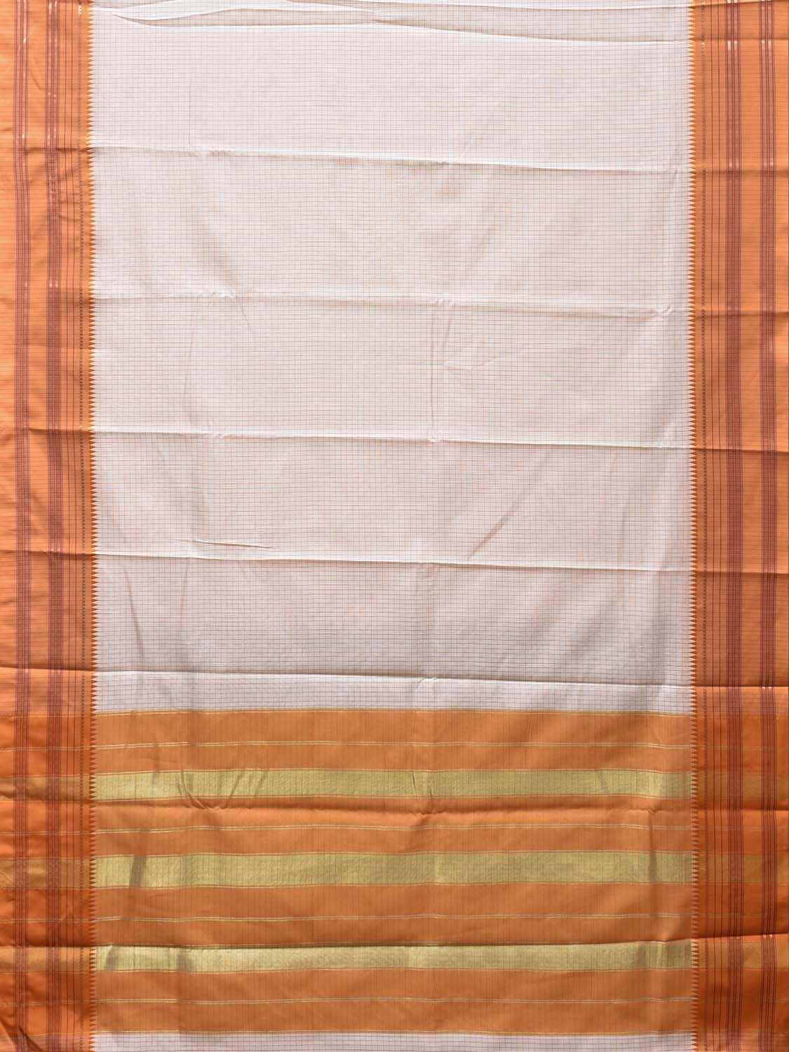 White and Orange Bamboo Cotton Viscose Silk Saree with Checks Design No Blouse. This is a blend of bamboo and cotton fibers, they have characteristics of both bamboo and cotton combined into one fabric. We Advise Gentle Handwash for Fabric Care. This saree has no blouse.