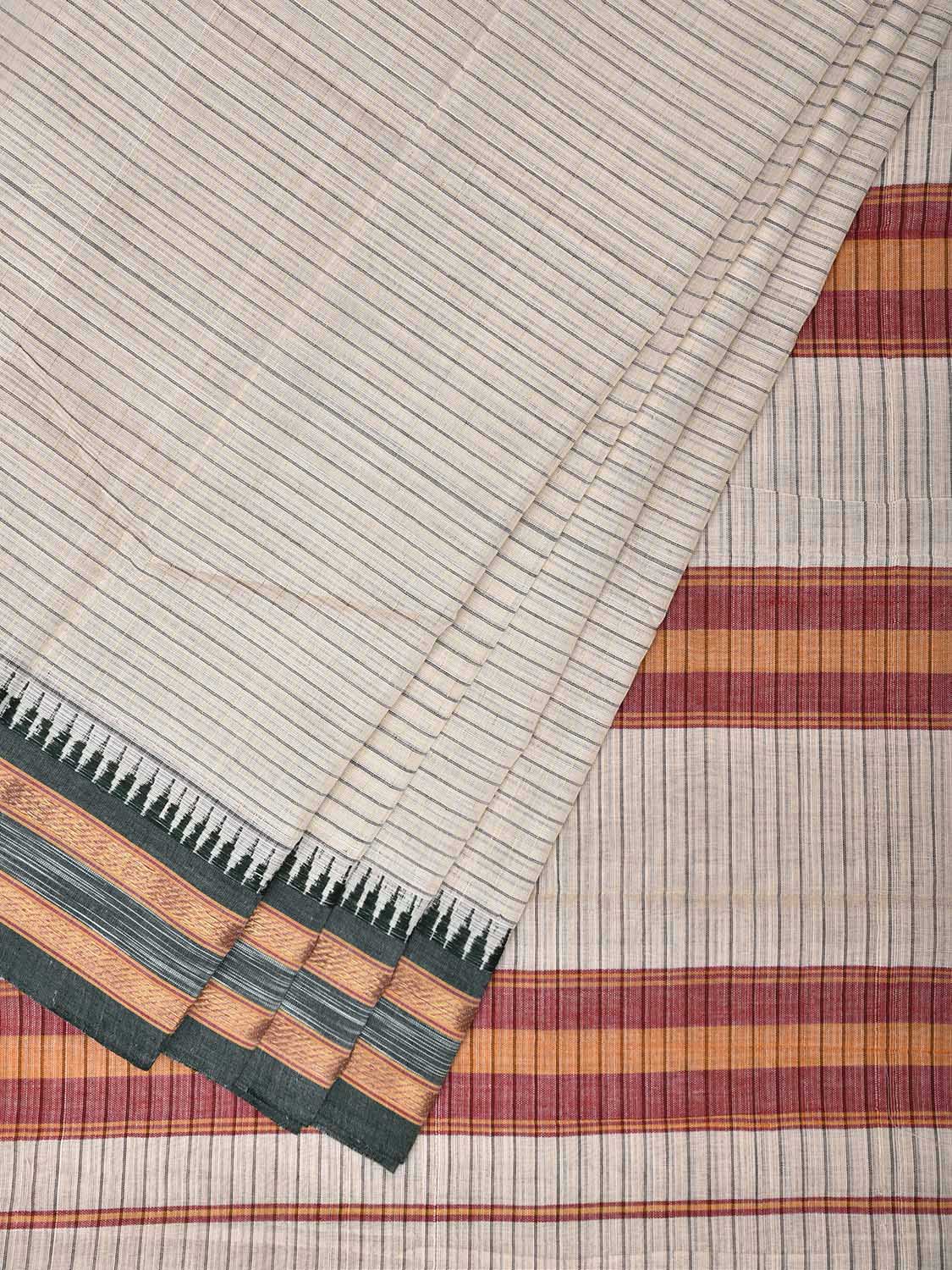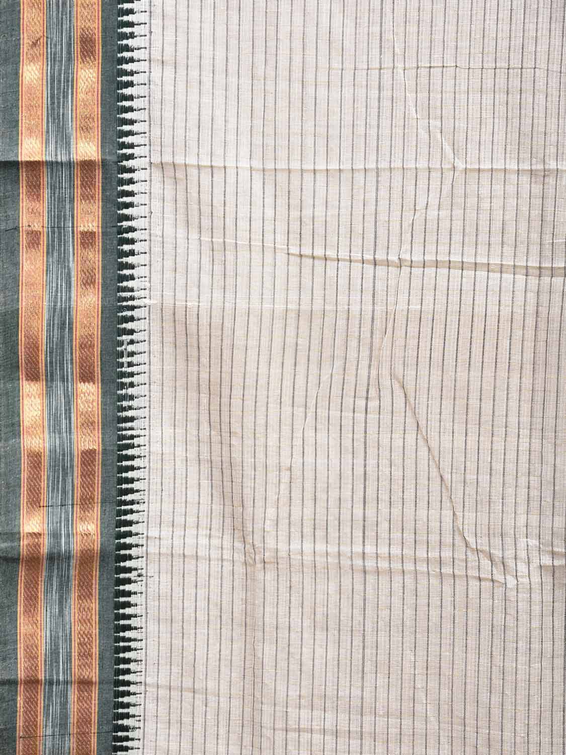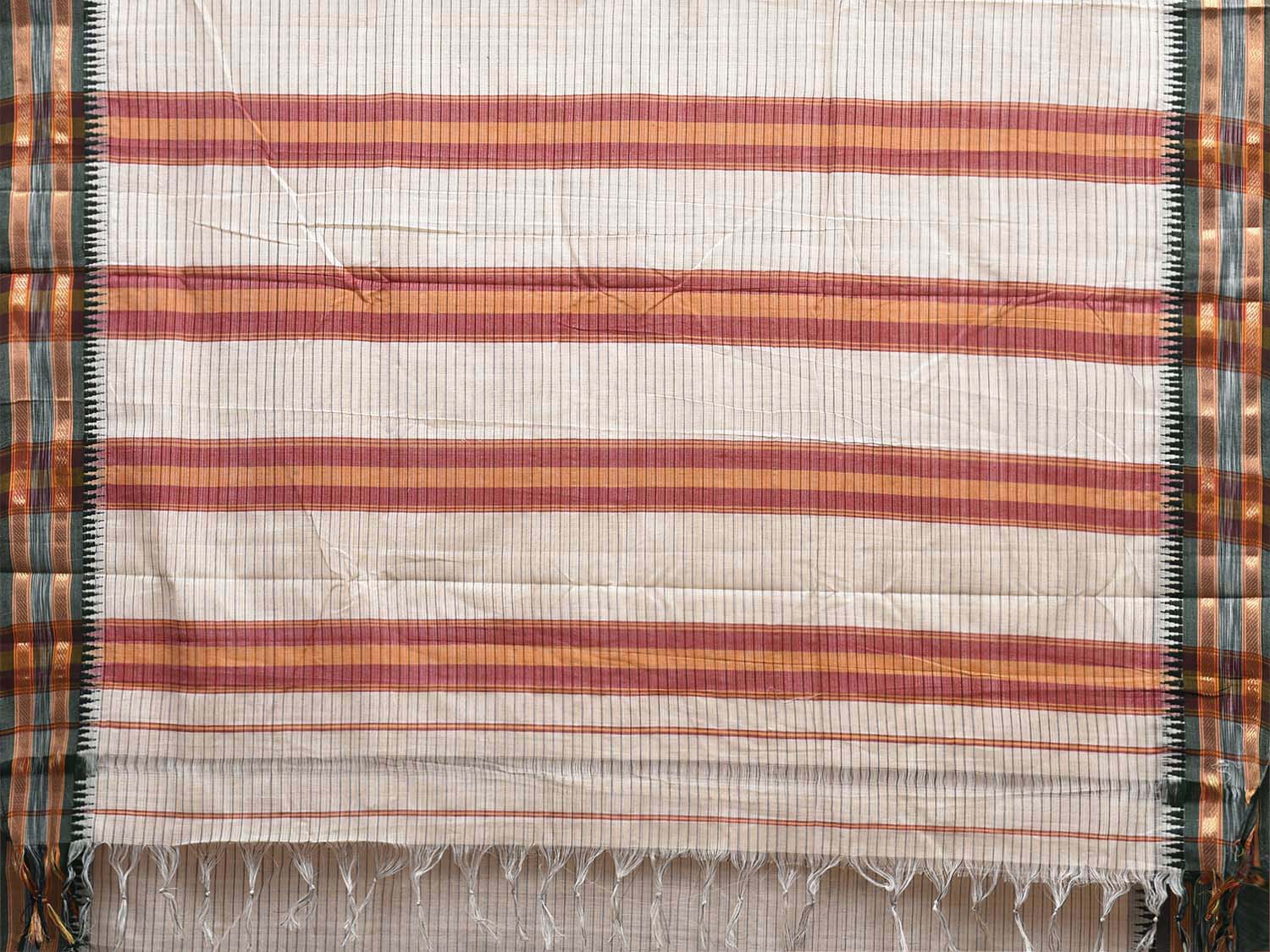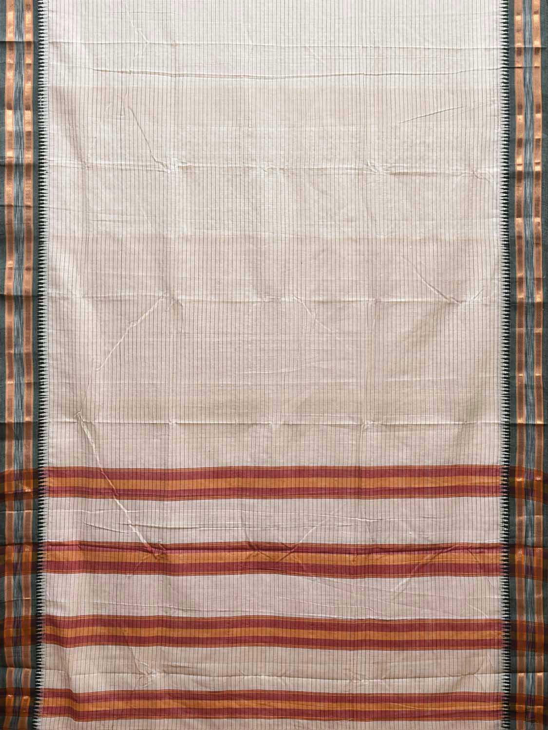White Narayanpet Cotton Saree with Strips and Small Temple Border Design No Blouse. This saree has no blouse.