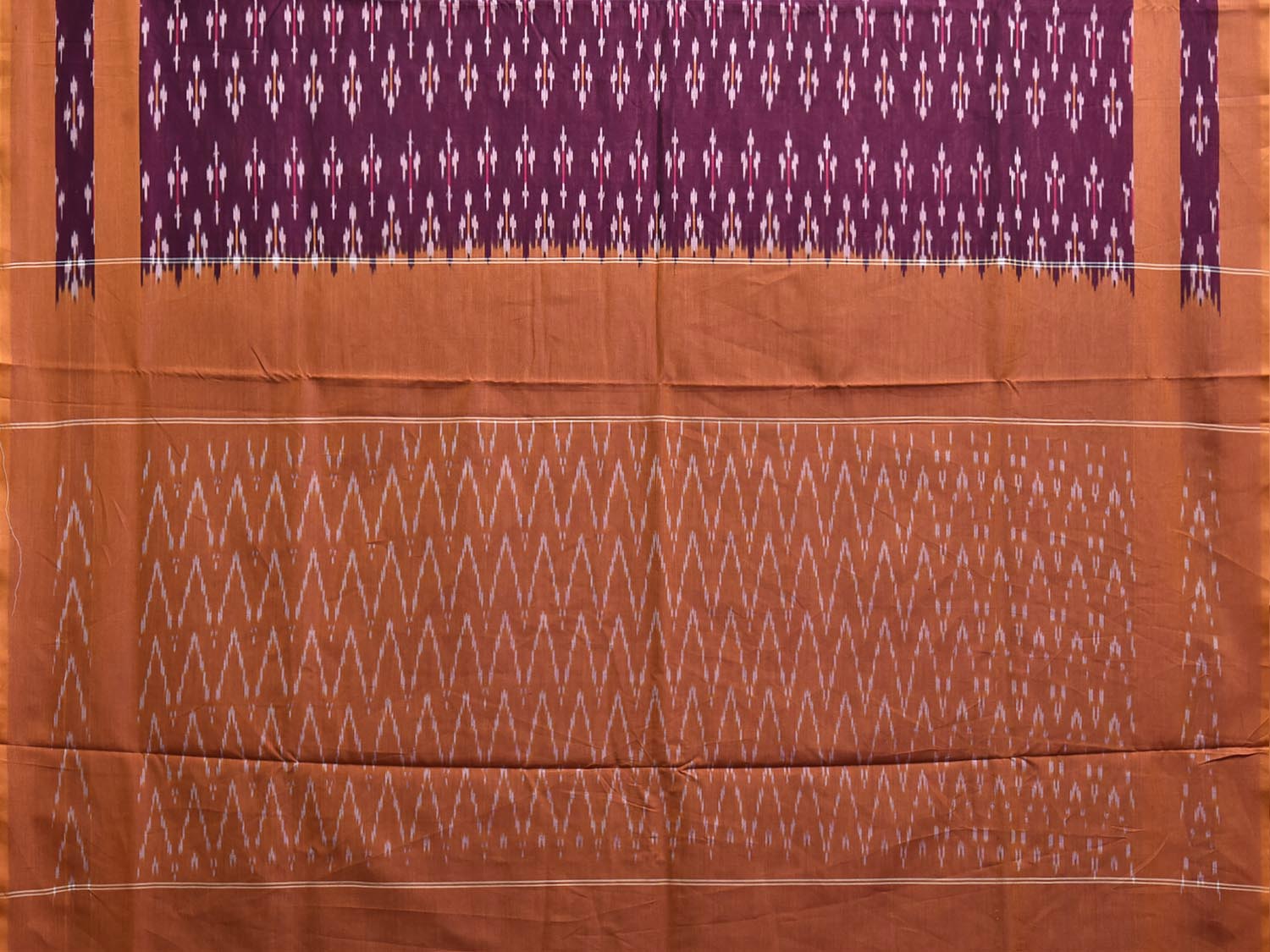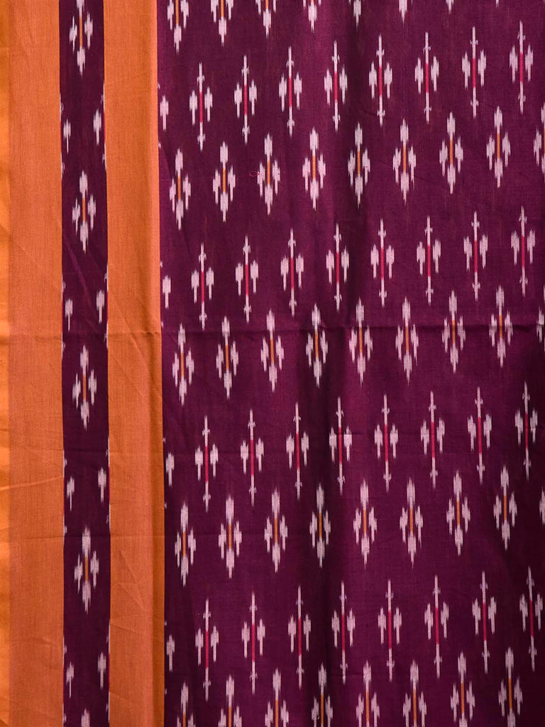 Wine and Orange Pochampally Ikat Cotton Handloom Saree with All Over and Zig-Zag Pallu Design No Blouse. This Handloom Saree from Andhra Pradesh has been woven using the resist-dyeing, which produces the unique patterns adorning the fabric. We advise gentle handwash separately for fabric care. This saree has no blouse.