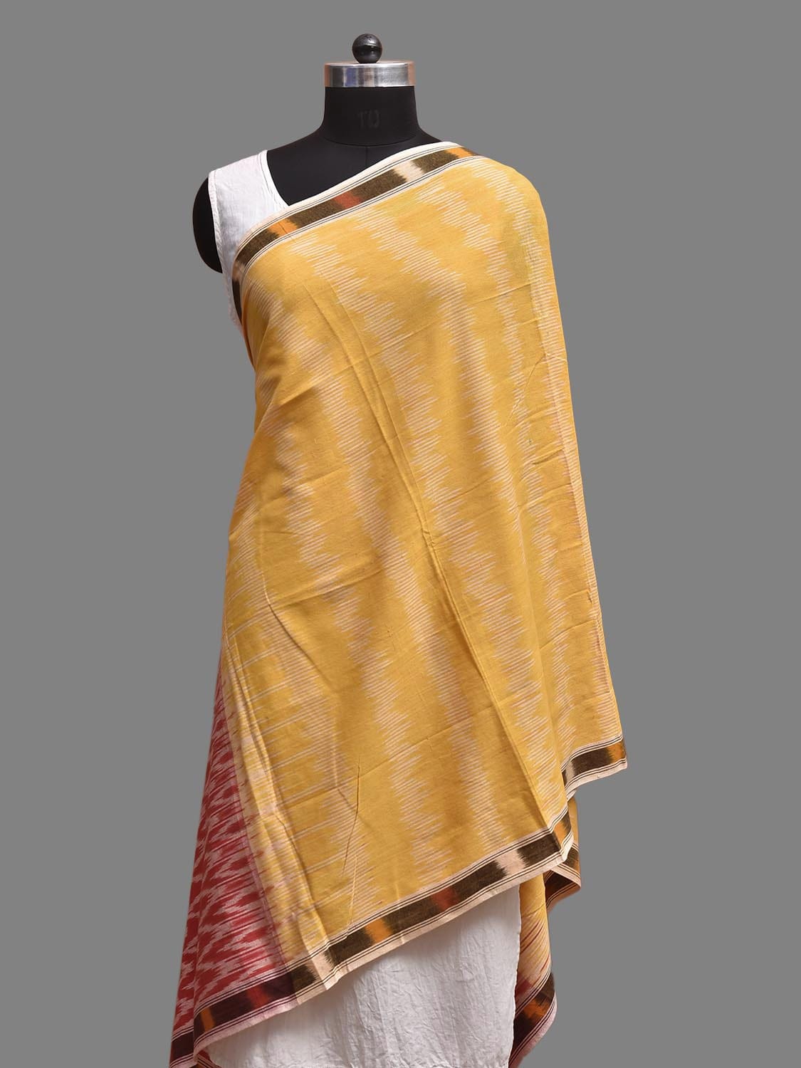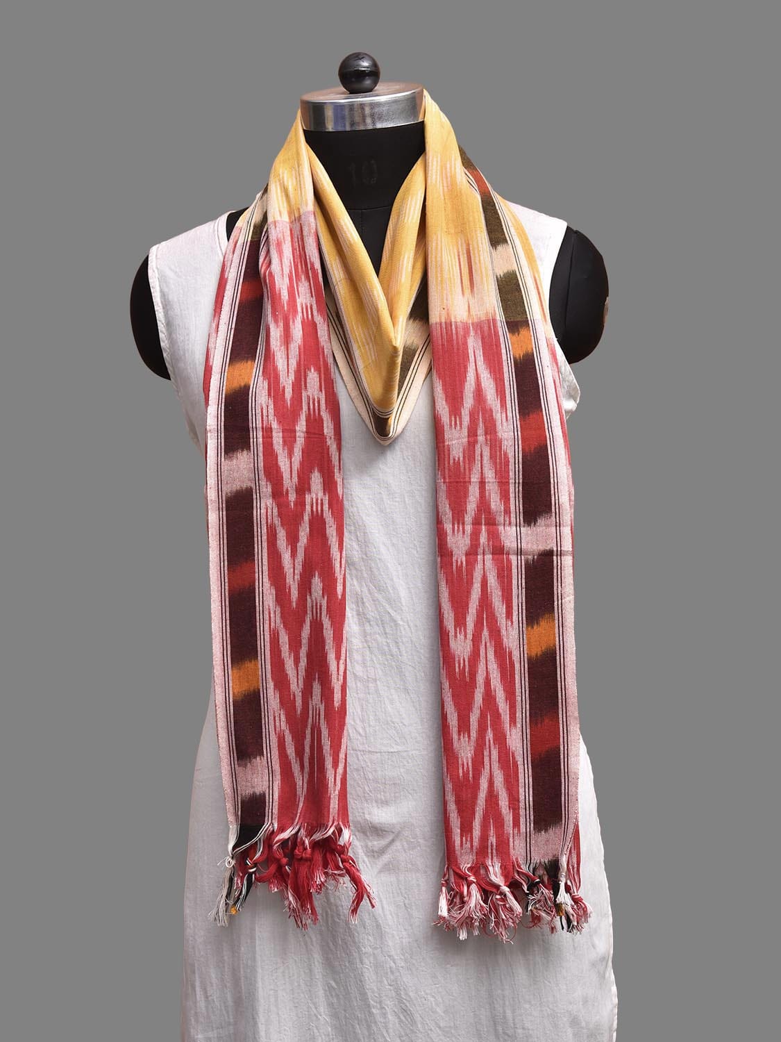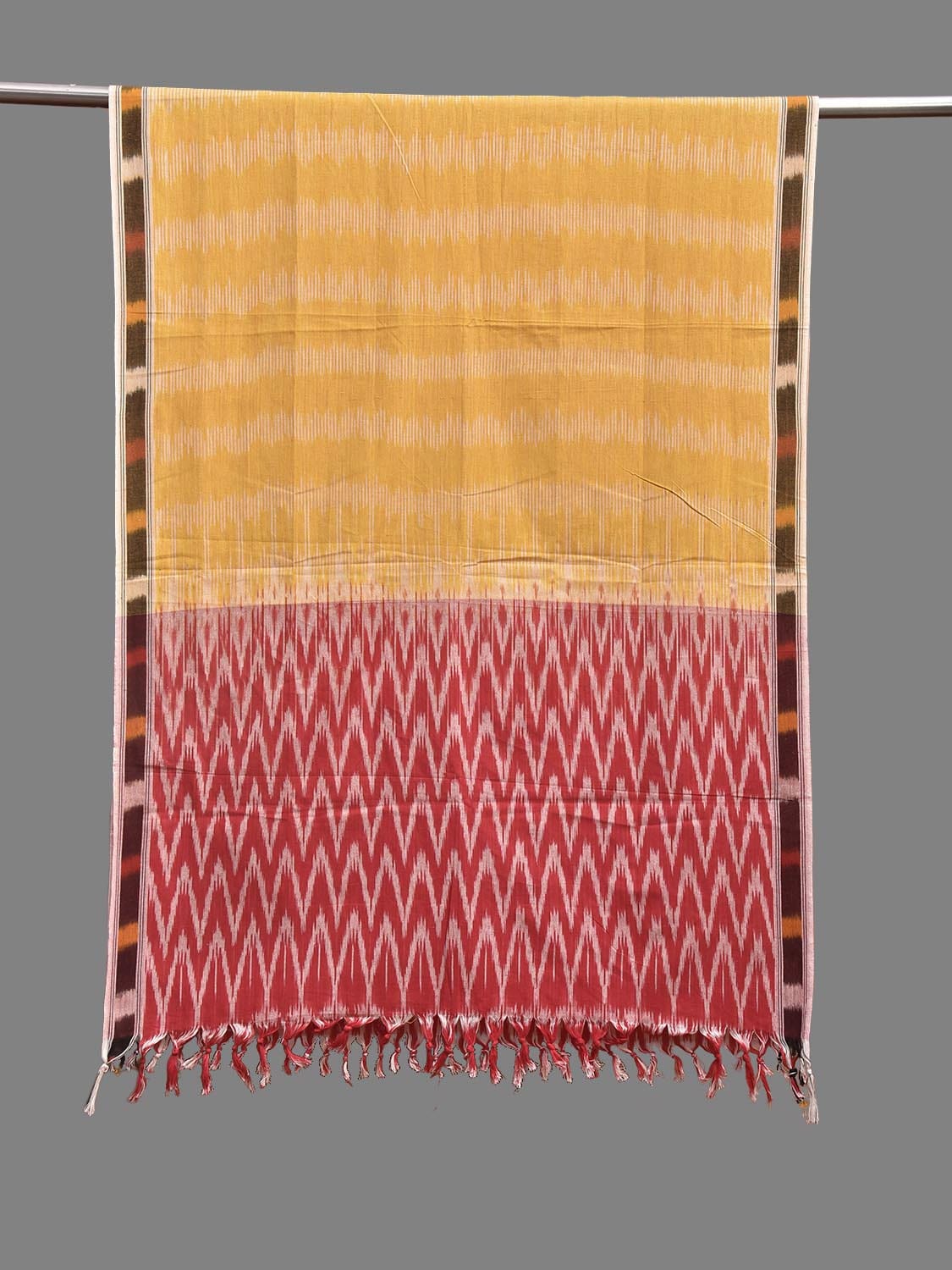 Yellow and Red Pochampally Ikat Cotton Handloom Dupatta with Strips and Zig-Zag Design. This Handloom Saree has been woven using the resist-dyeing, which produces the unique patterns adorning the fabric. We advise gentle handwash separately for fabric care.