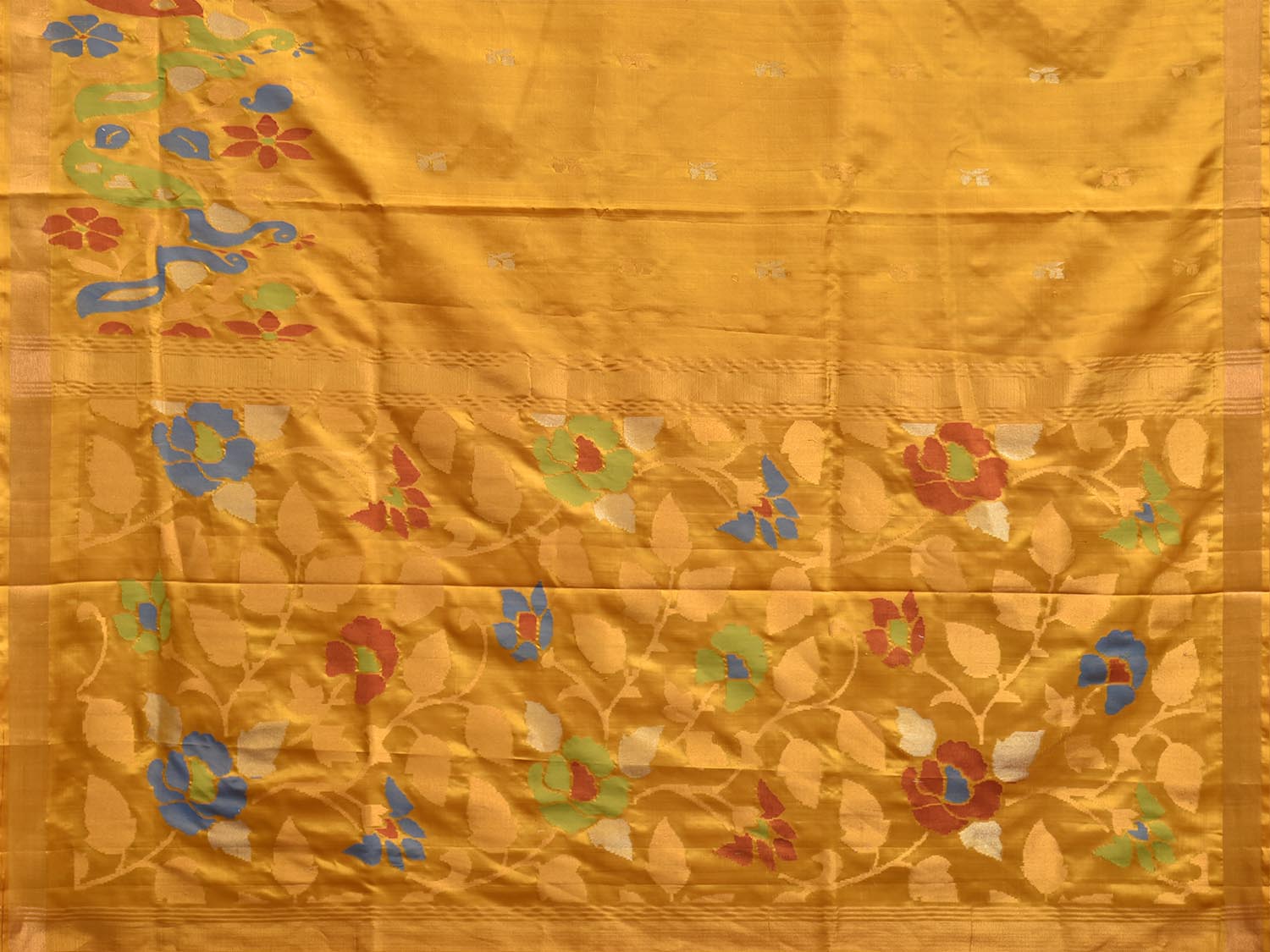 Delicate Floral Body: Providing a perfect balance to the ornate border and pallu, the silk body is scattered with delicate, elegant flower motifs that add a touch of grace and subtlety.