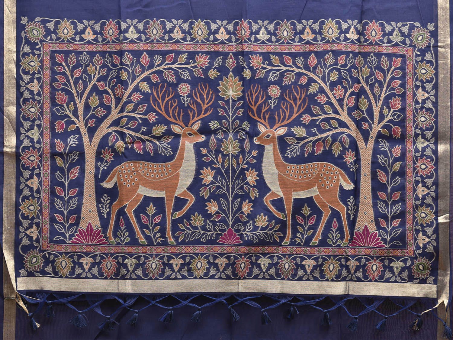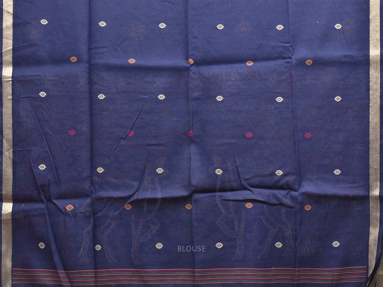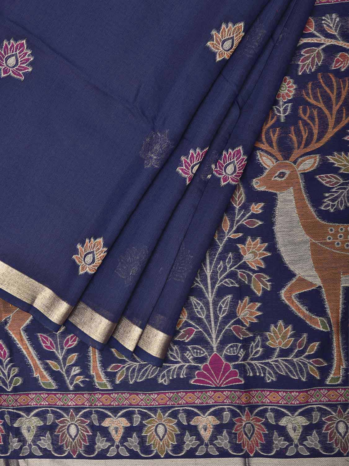 Dark Blue Dhakai Jamdani Cotton Viscose Saree with Buta and Deers Pallu Design. These are some of the traditional Dhakai Jamdani designs, these sarees have geometric designs and sometimes floral or combination of both. We advice gentle handwash separately for fabric care.