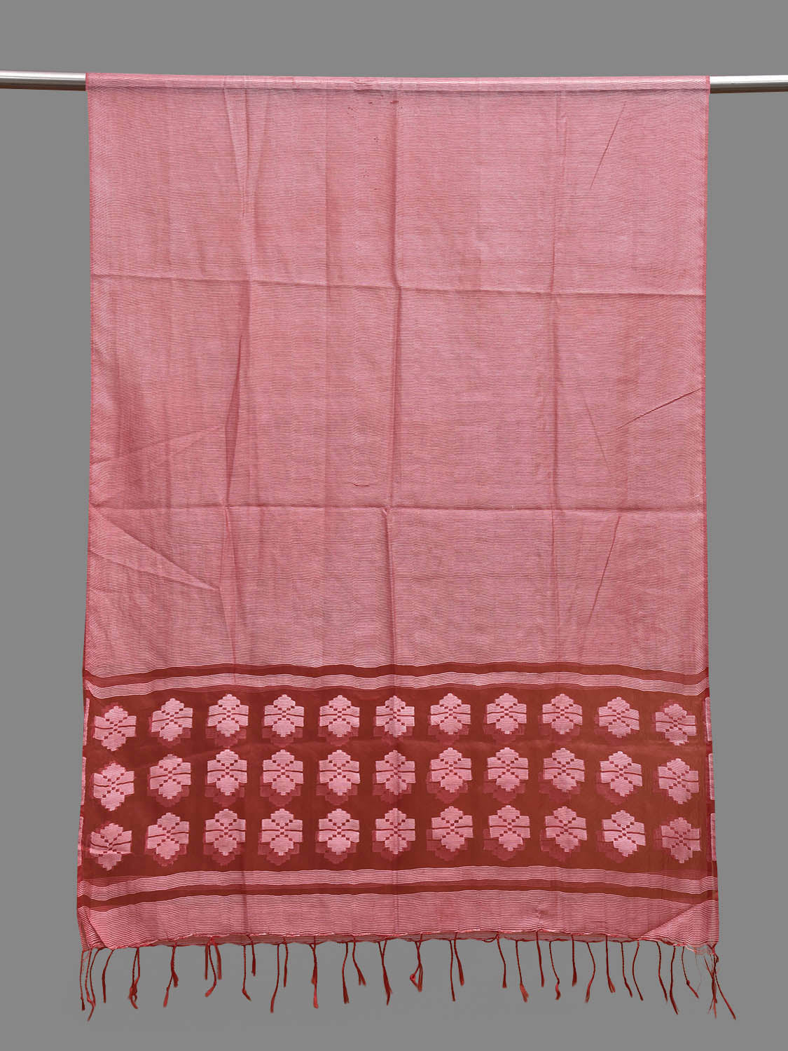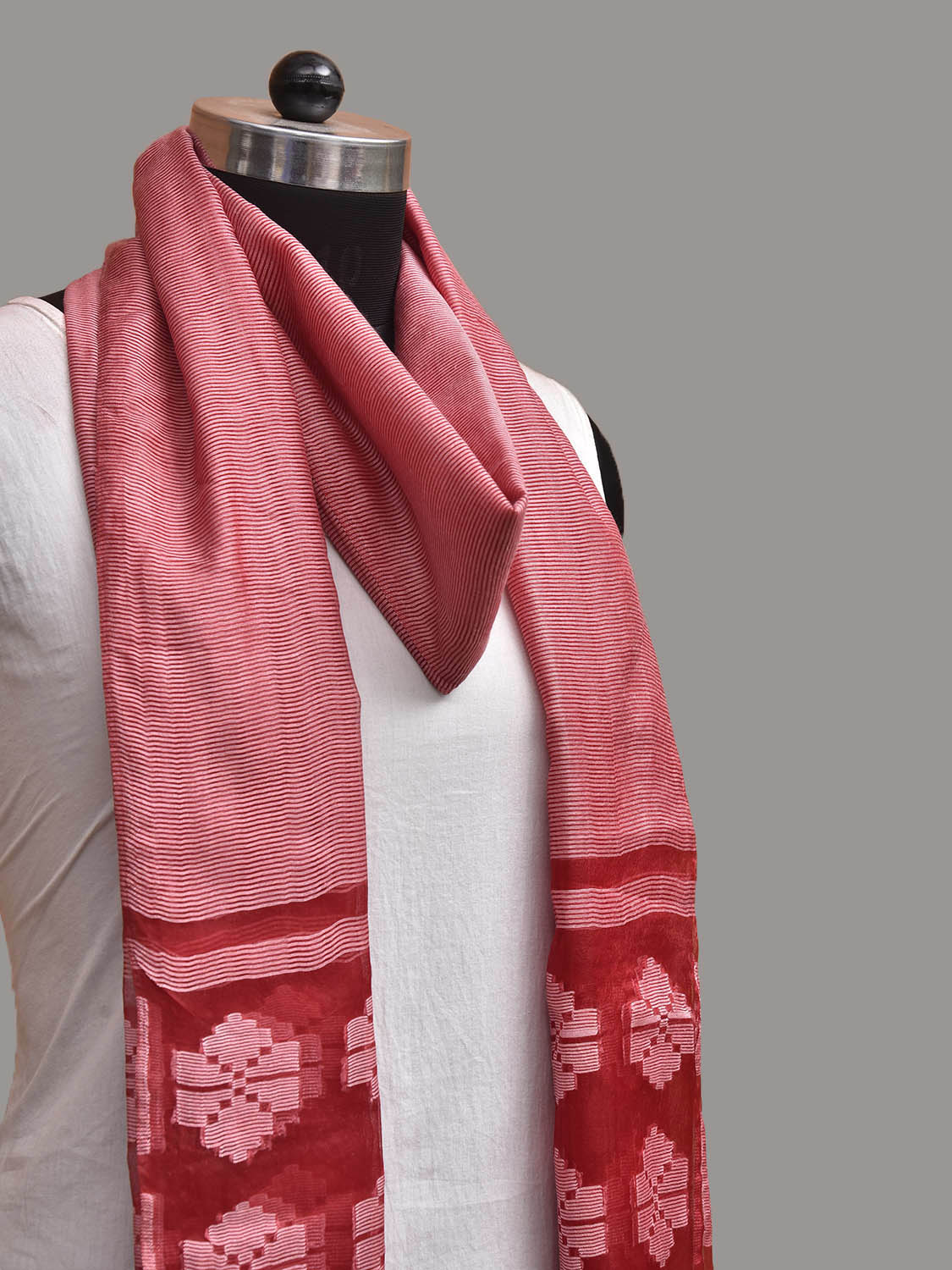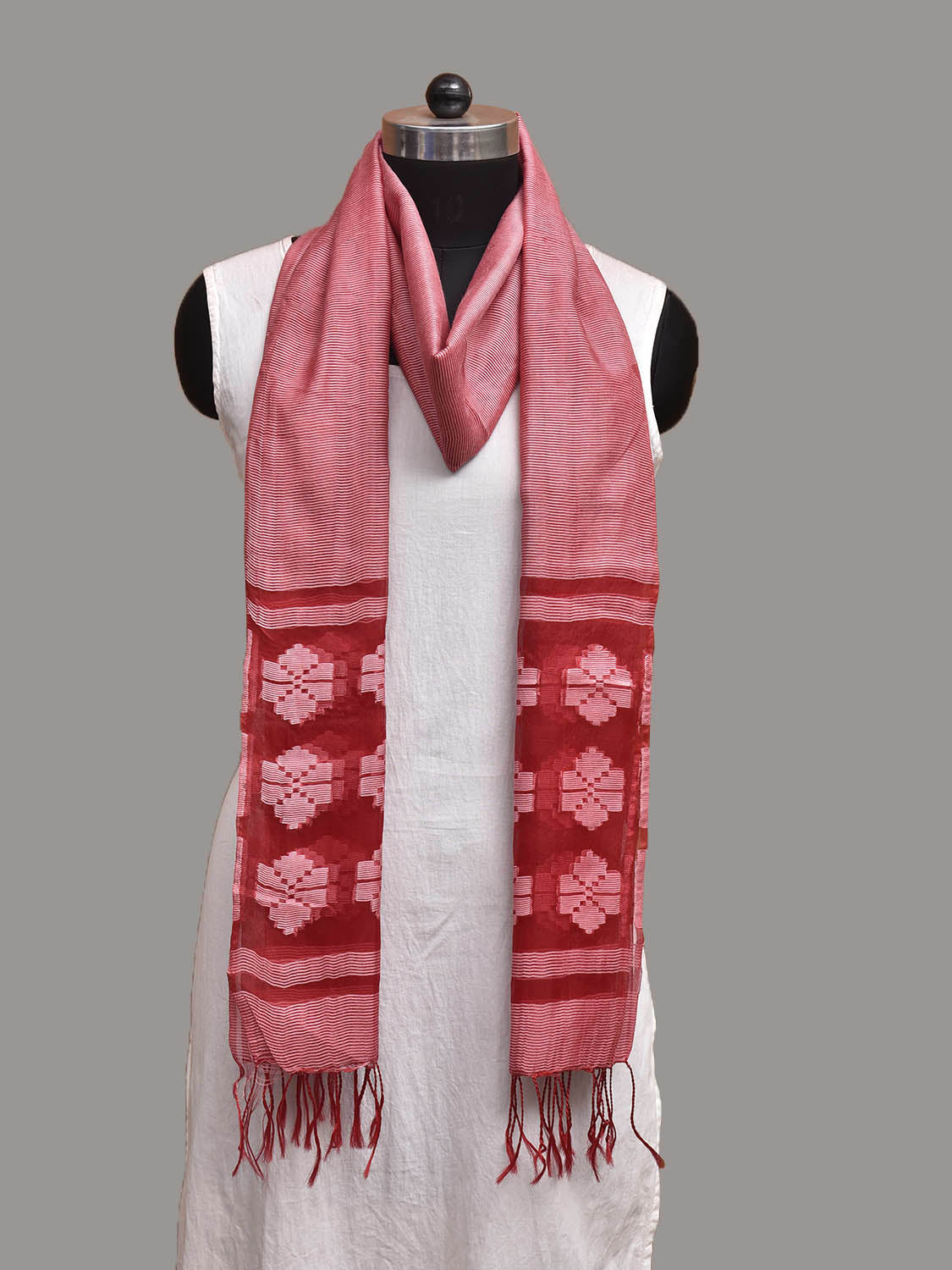 Light Pink and Red Dhakai Jamdani Cotton Viscose Dupatta with Floral Pallu Design. For fabric care we advise gentle handwash it separately.