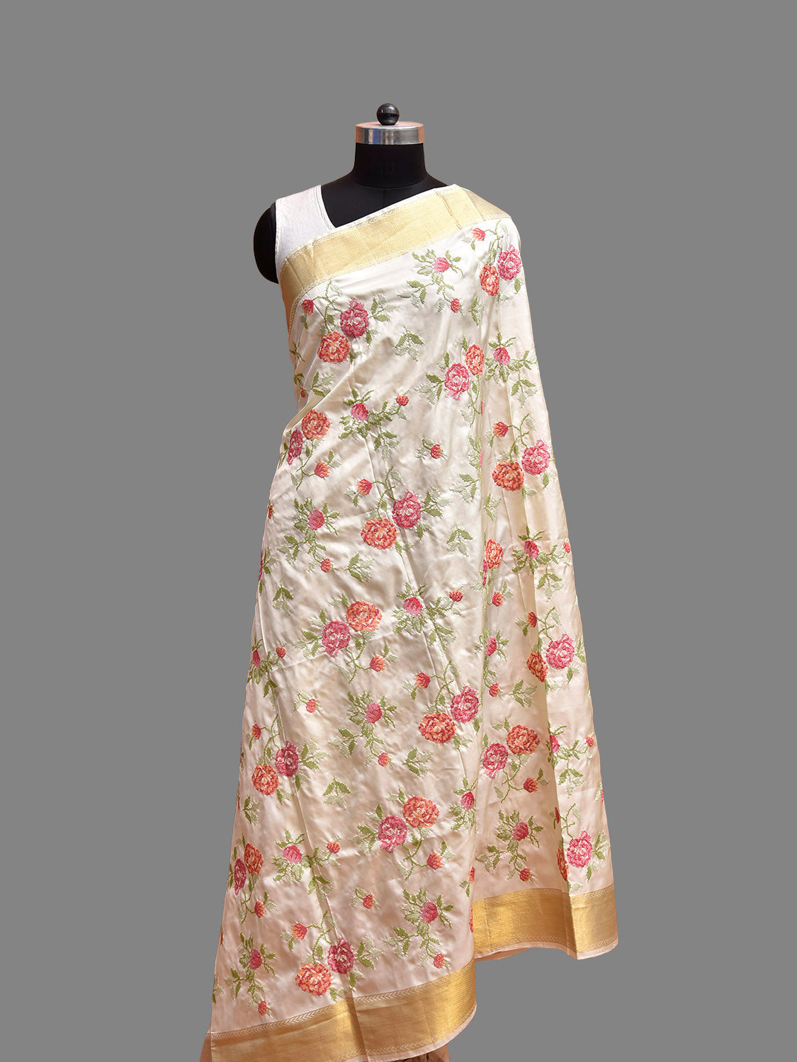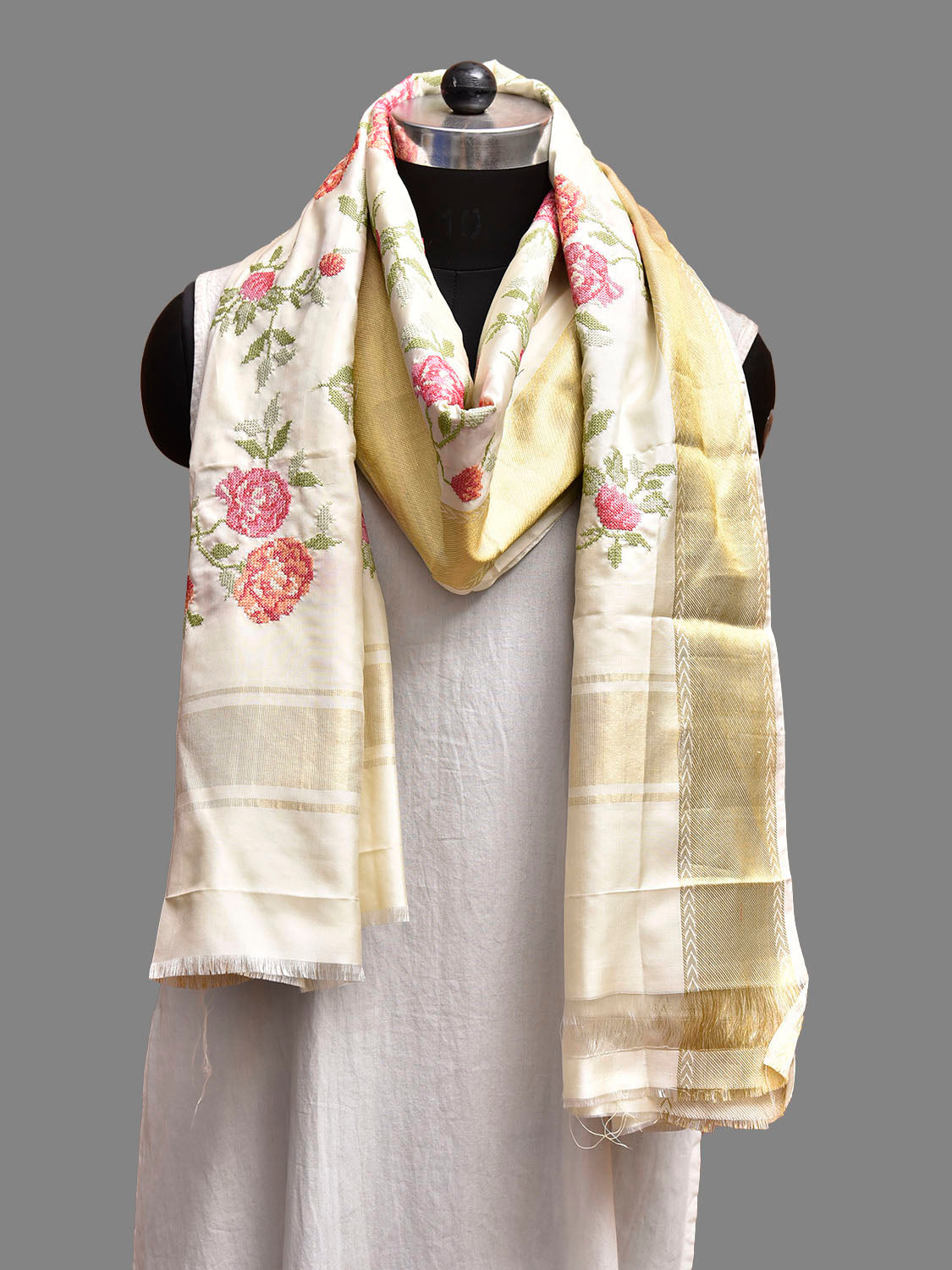 White Petite Embroidary Kanchipuram Silk Dupatta with Floral Design. For fabric care we advise dry clean only.