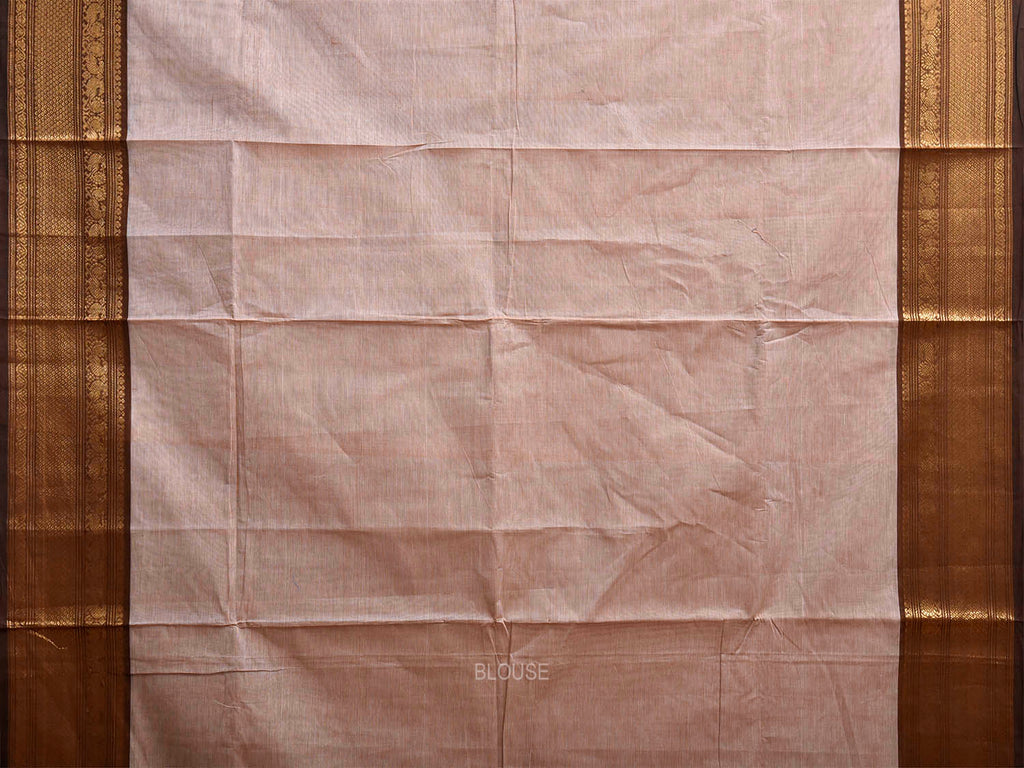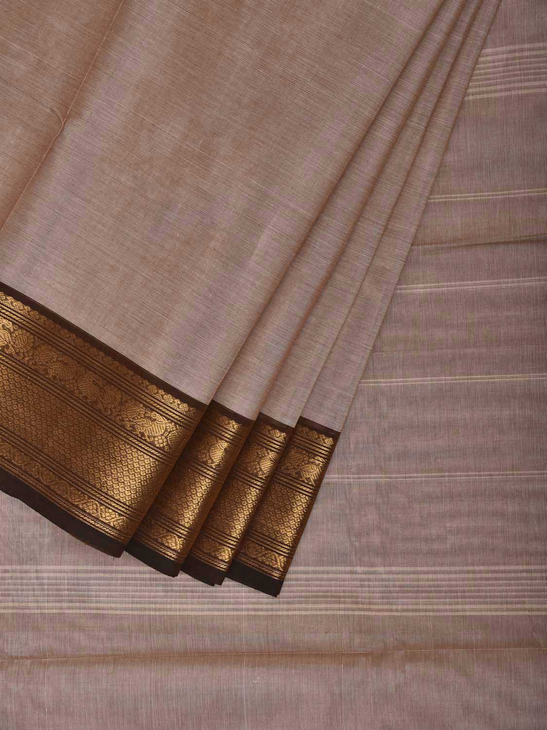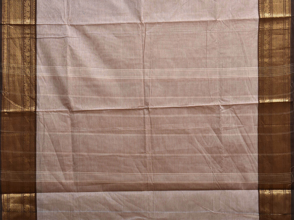 Cream and Brown Kanchipuram Cotton Plain Saree with Border and Strips Pallu Design. Traditional Simple South Indian Attire Saree for any Casual Occasions. As it’s a cotton saree we advice gentle handwash separately for fabric care.