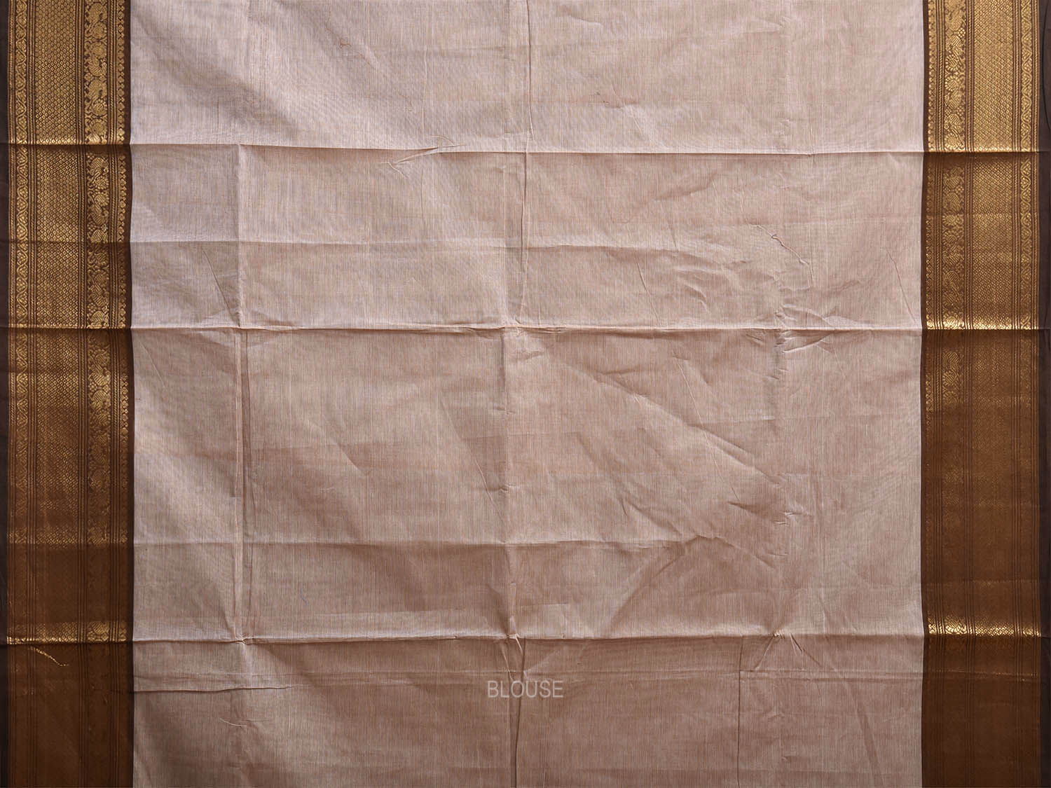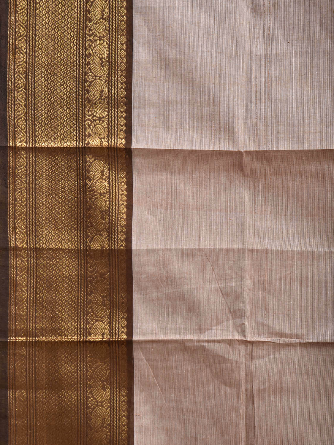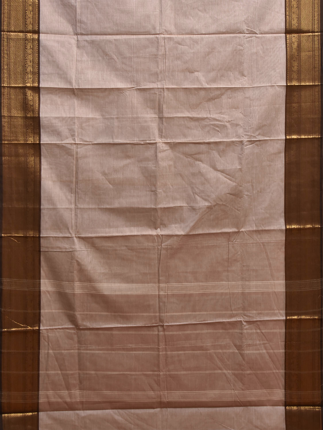 Cream and Brown Kanchipuram Cotton Plain Saree with Border and Strips Pallu Design. Traditional Simple South Indian Attire Saree for any Casual Occasions. As it’s a cotton saree we advice gentle handwash separately for fabric care.