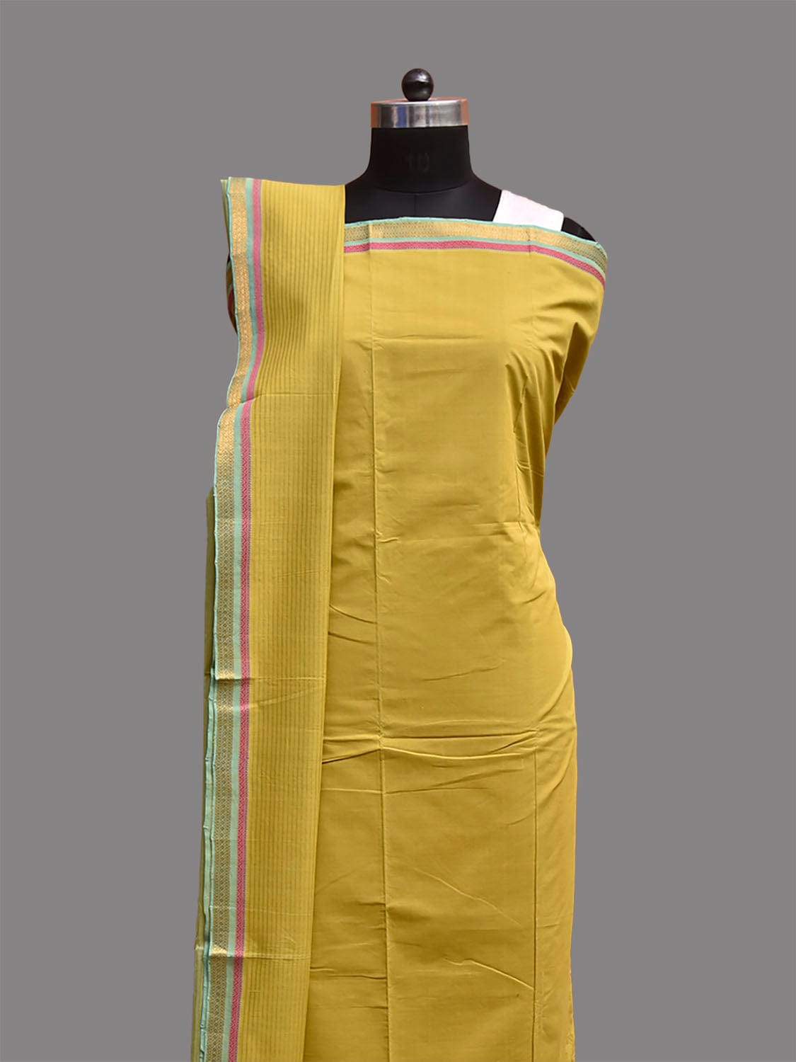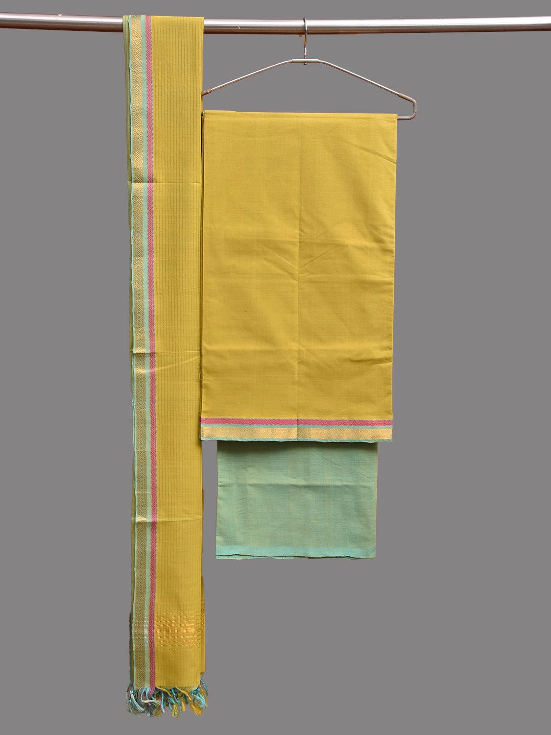 Light Green Mangalgiri Cotton Dress Material with Top Bottom and Strips Dupatta. We Advise Gentle Handwash for Fabric Care.