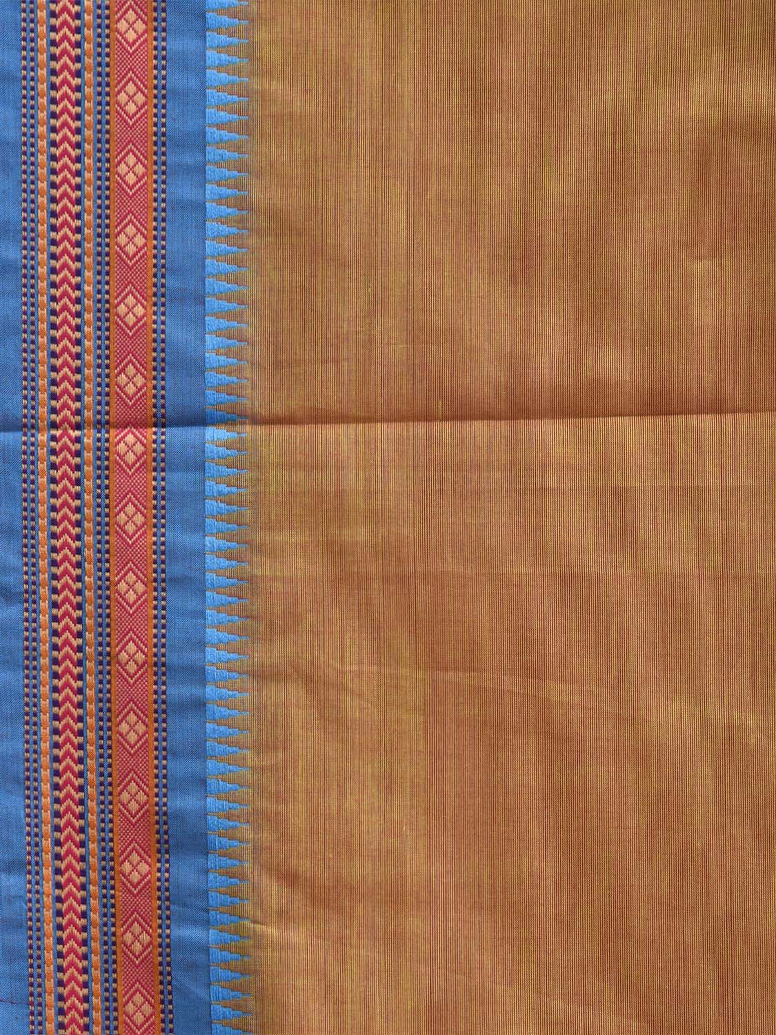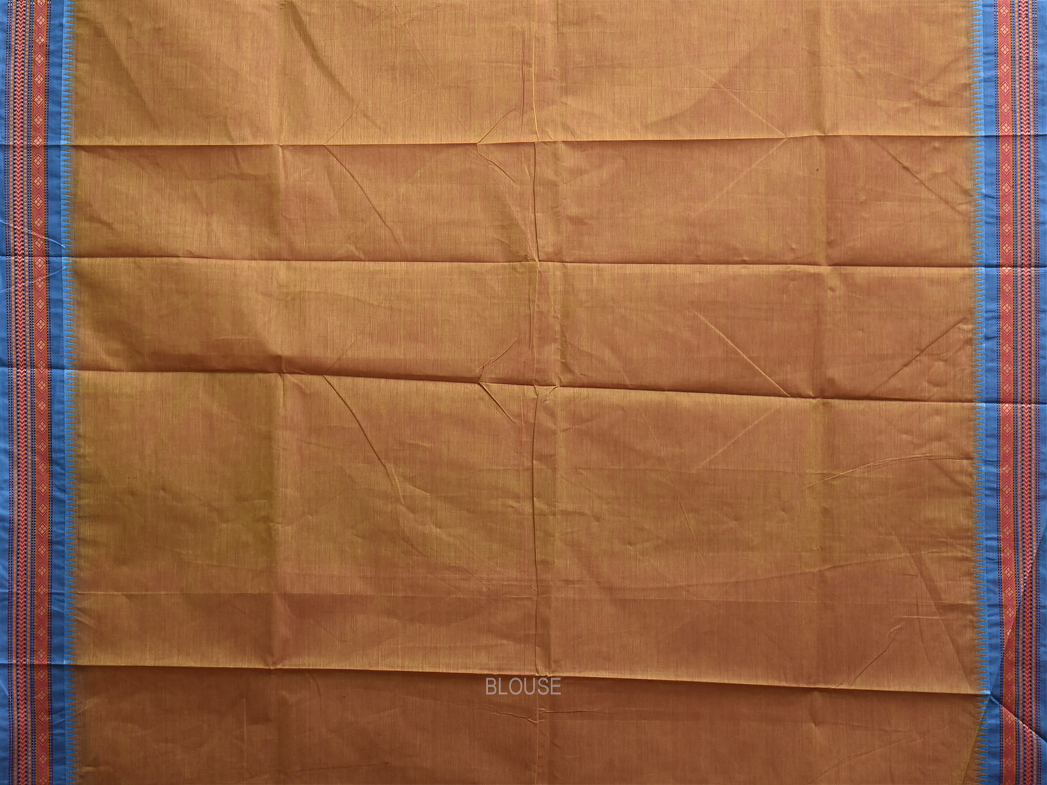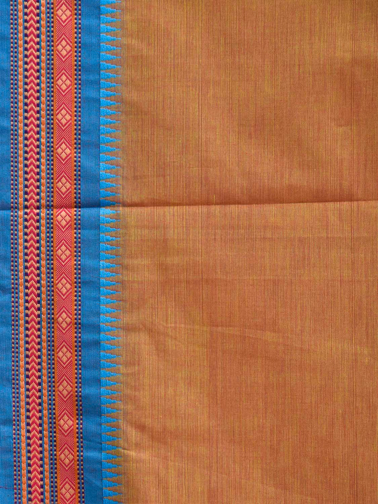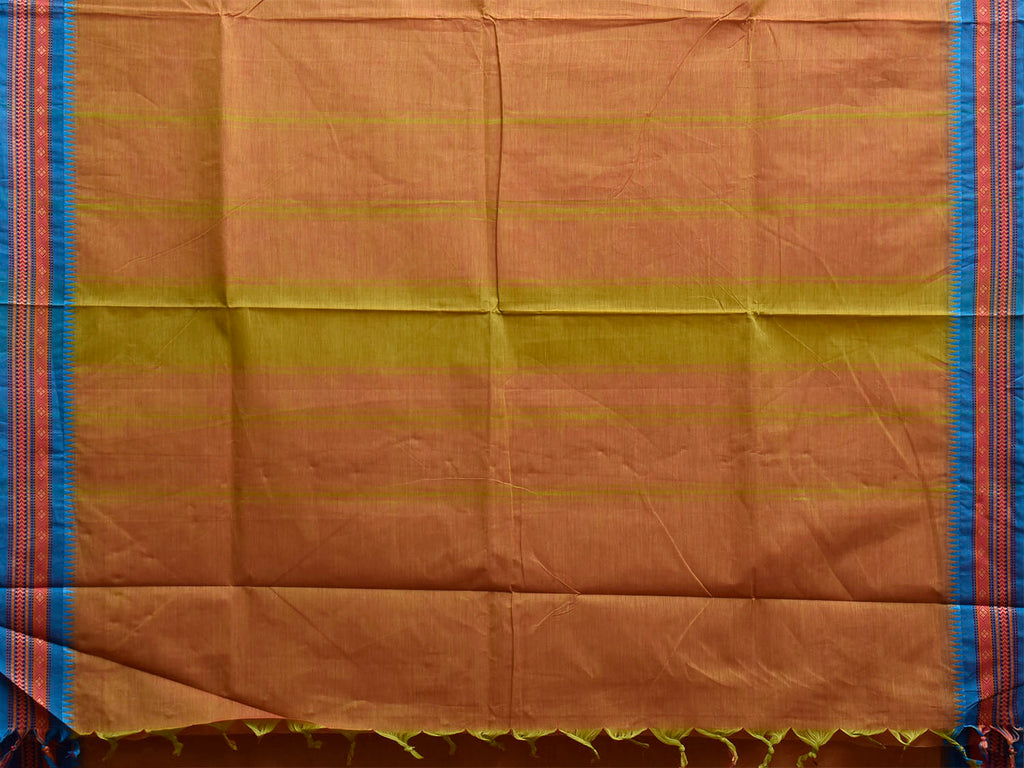 Light Orange and Blue Kanchipuram Cotton Plain Saree with Strips Pallu and Border Design. Traditional Simple South Indian Attire Saree for any Casual Occasions. As it’s a cotton saree we advice gentle handwash separately for fabric care.