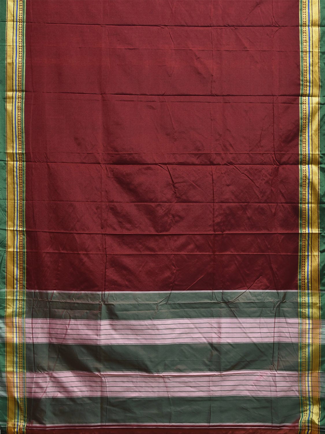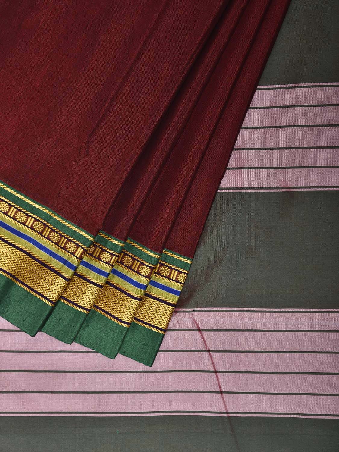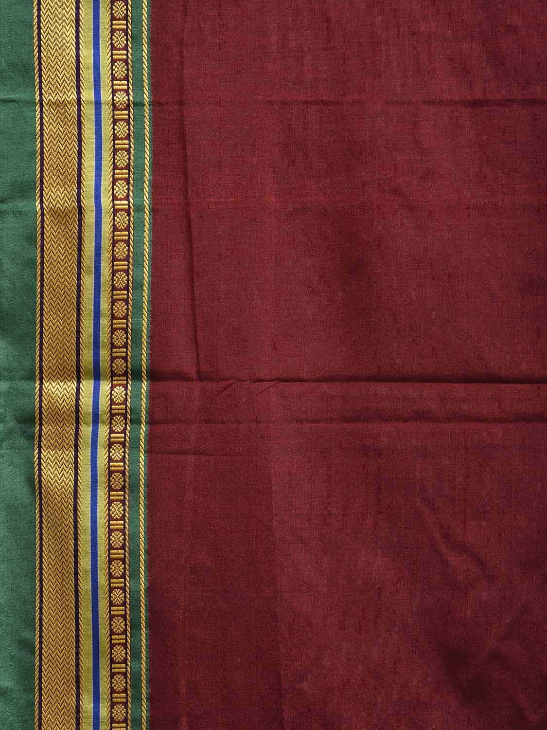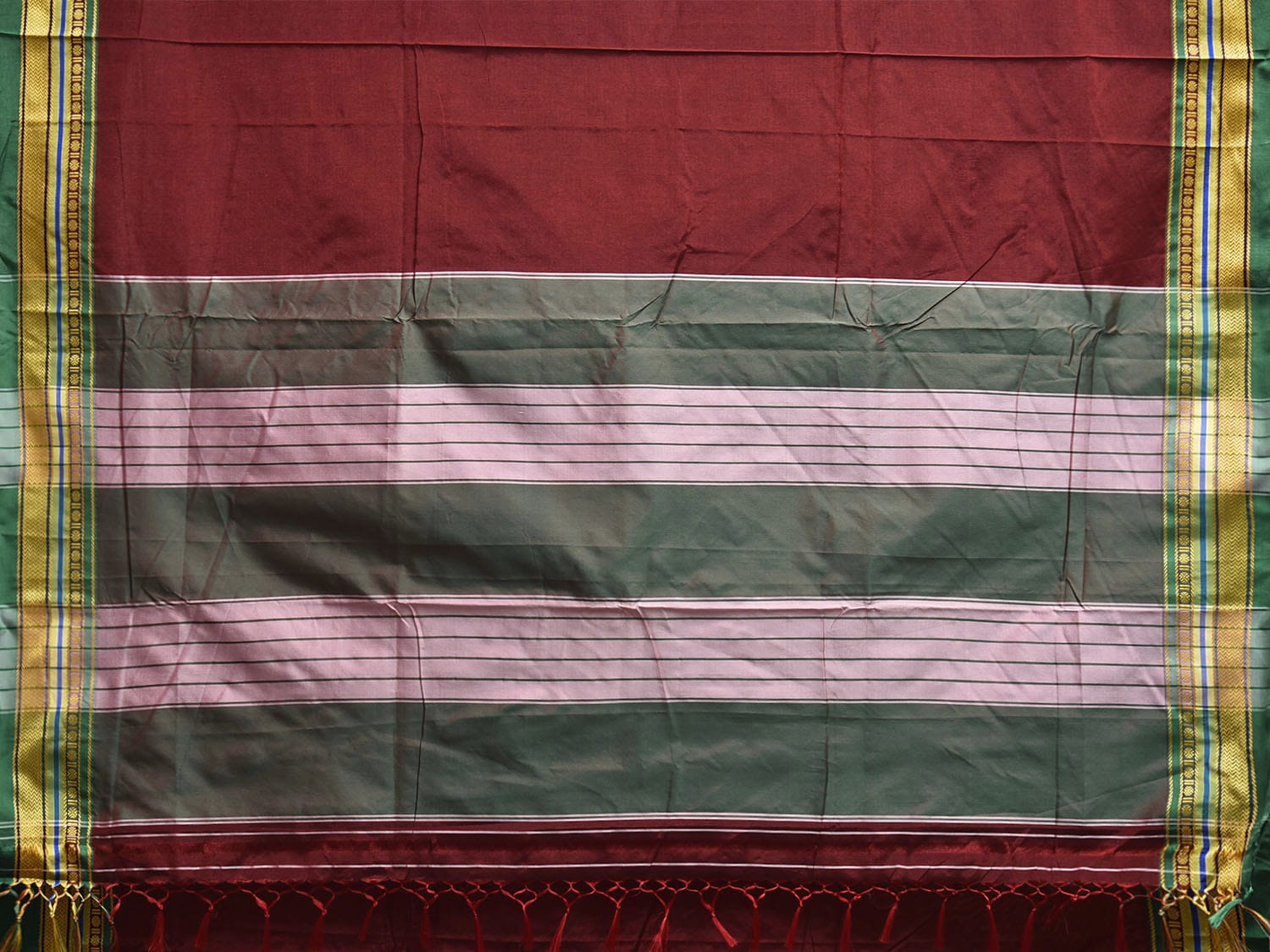 Maroon and Green ilkal Cotton Plain Saree with Strips Pallu Design No Blouse. For fabric care we advise gentle handwash separately.