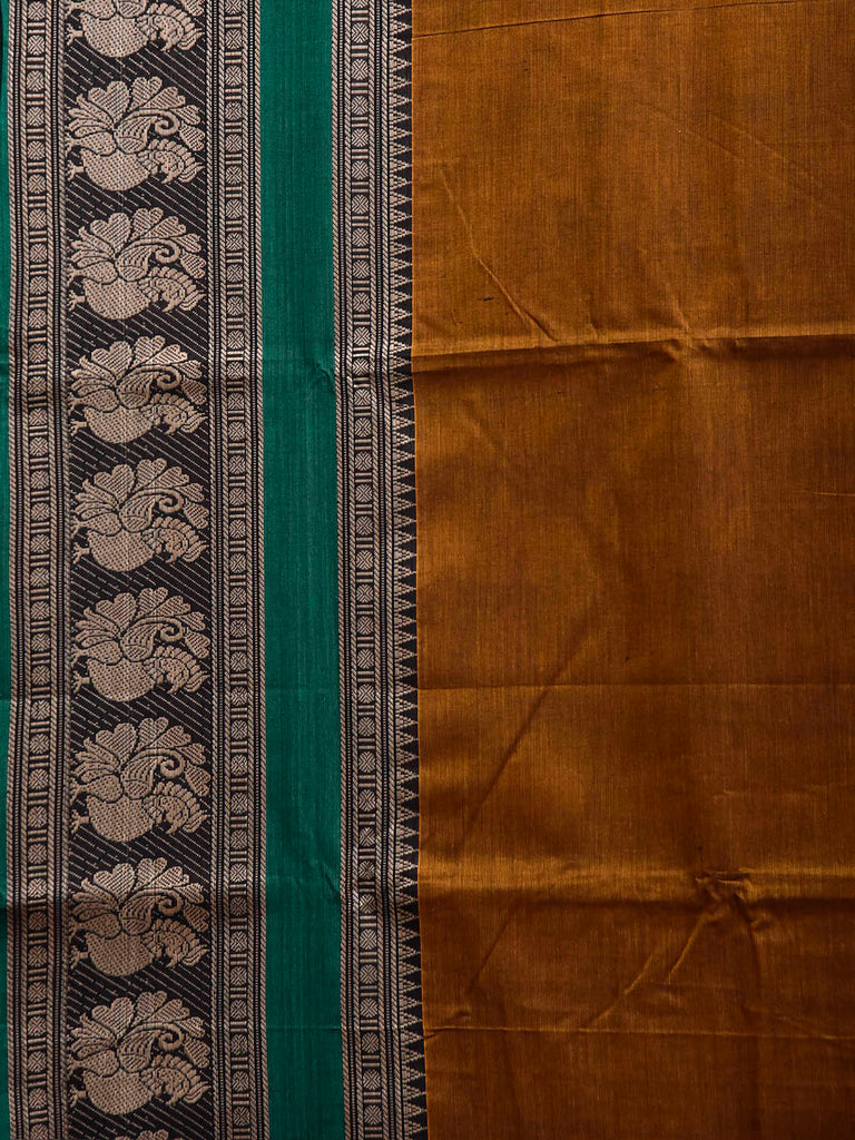 Olive and Green Narayanpet Cotton Plain Saree with Strips Pallu and Border Design No Blouse. This saree has no blouse.