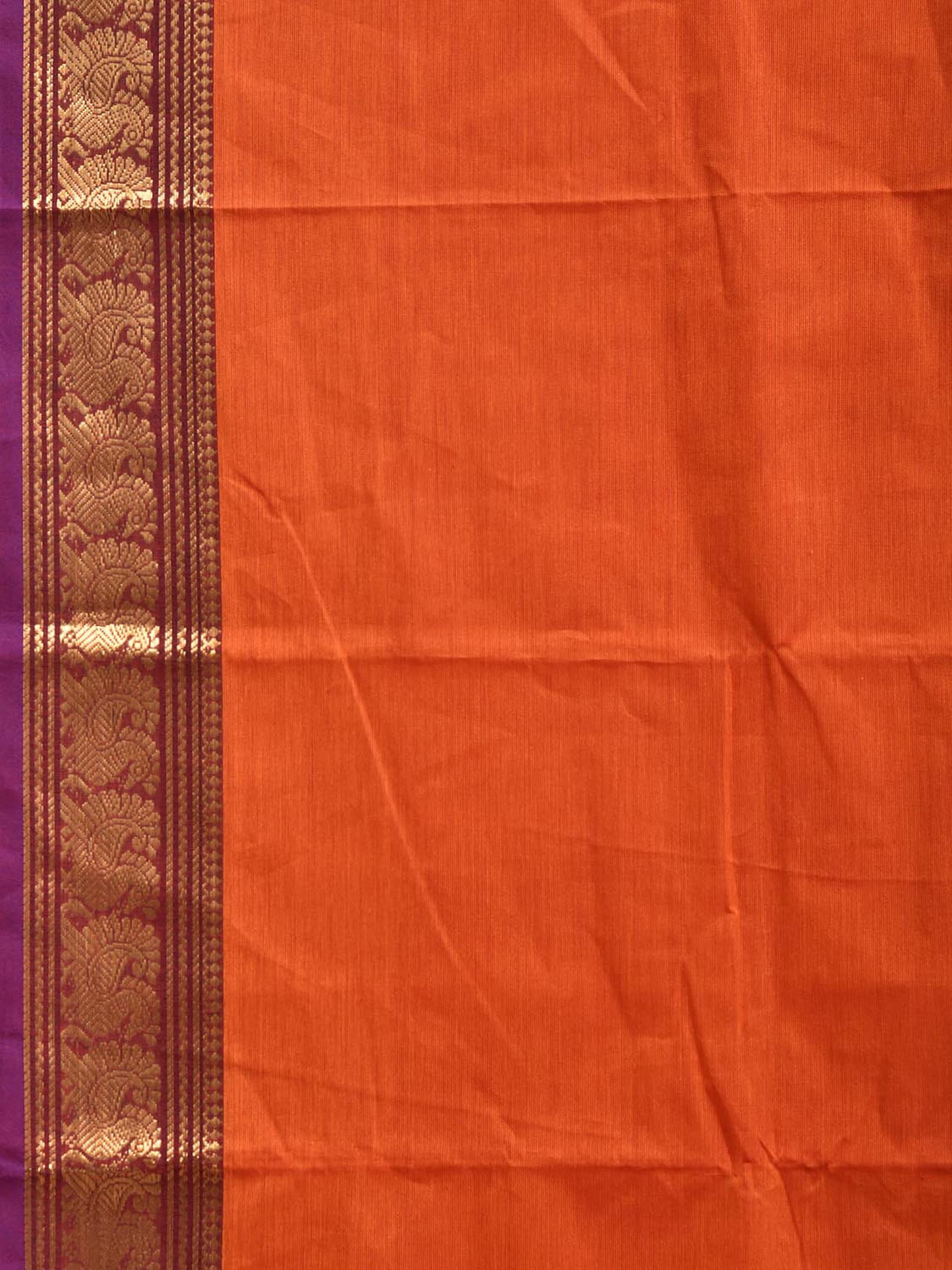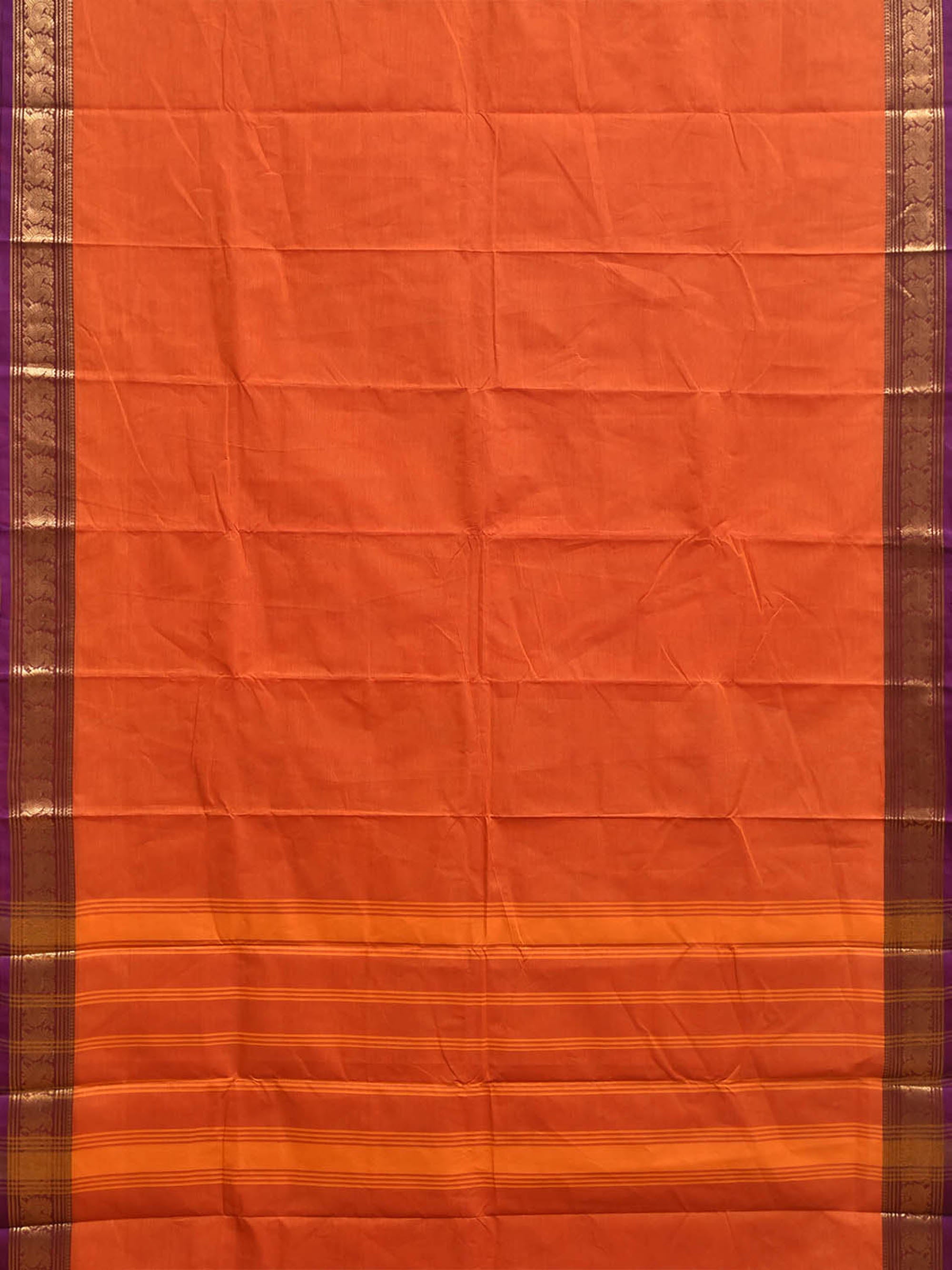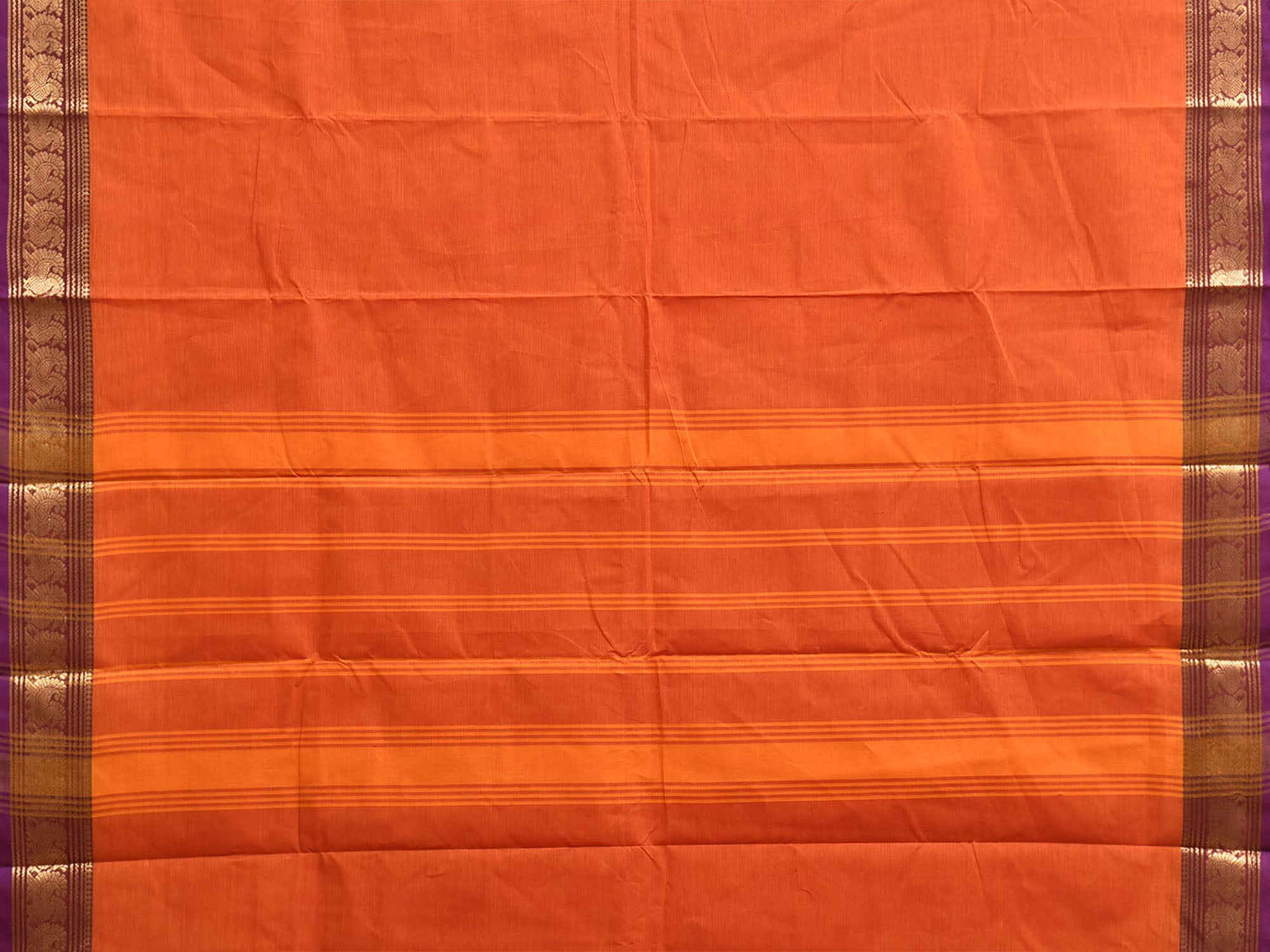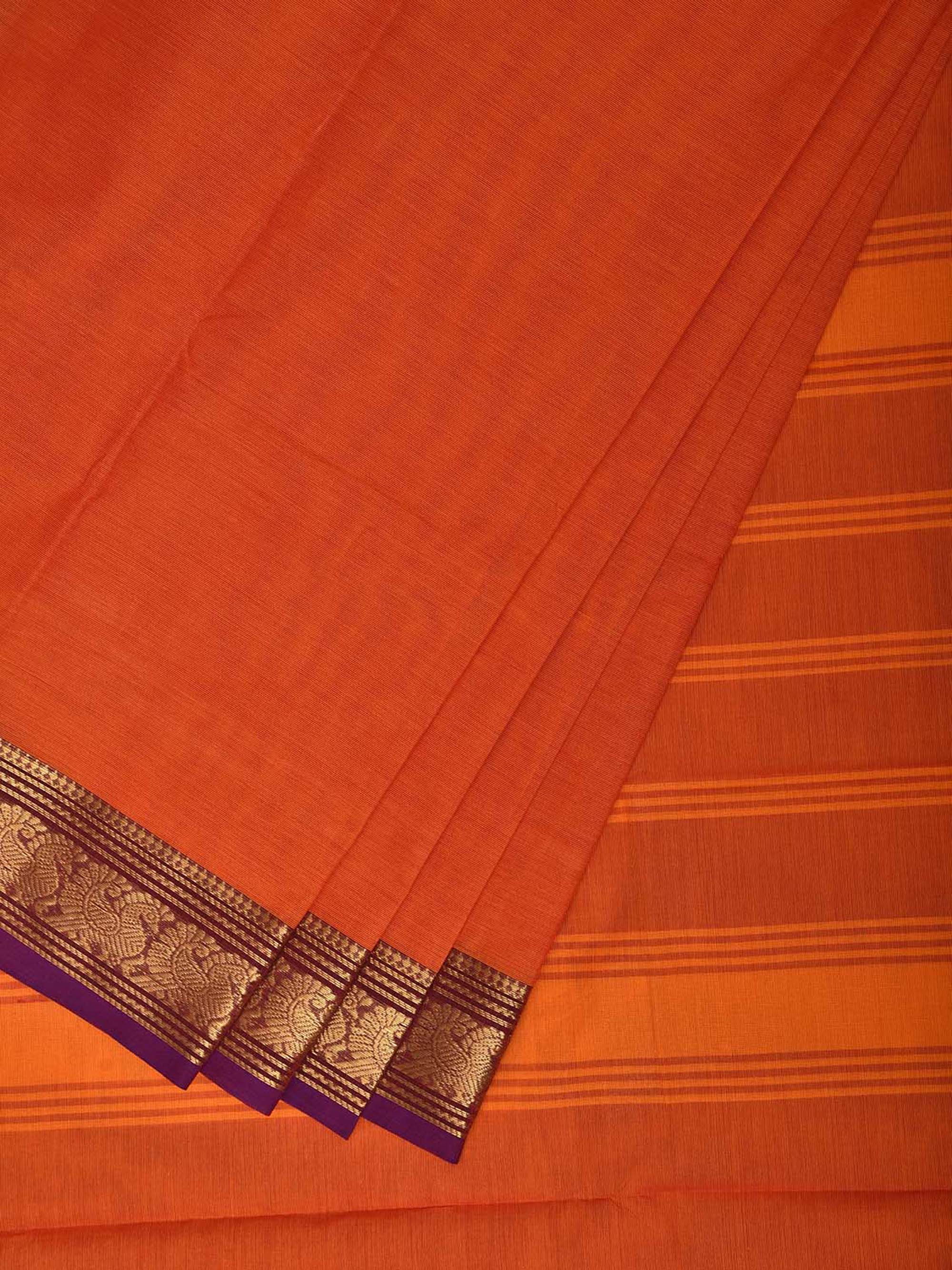 Orange Kanchipuram Cotton Plain Saree with Strips Pallu Design No Blouse. Traditional Simple South Indian Attire Saree for any Casual Occasions. As it’s a cotton saree we advice gentle handwash separately for fabric care. This saree has no blouse.