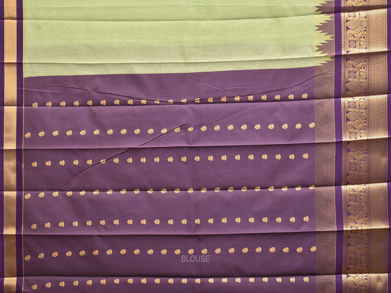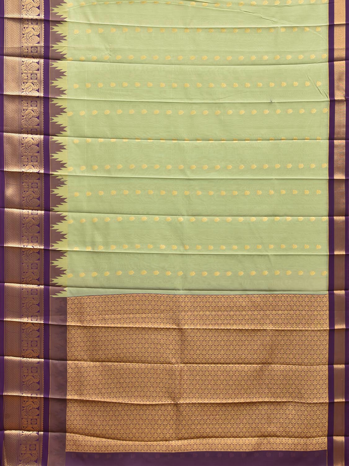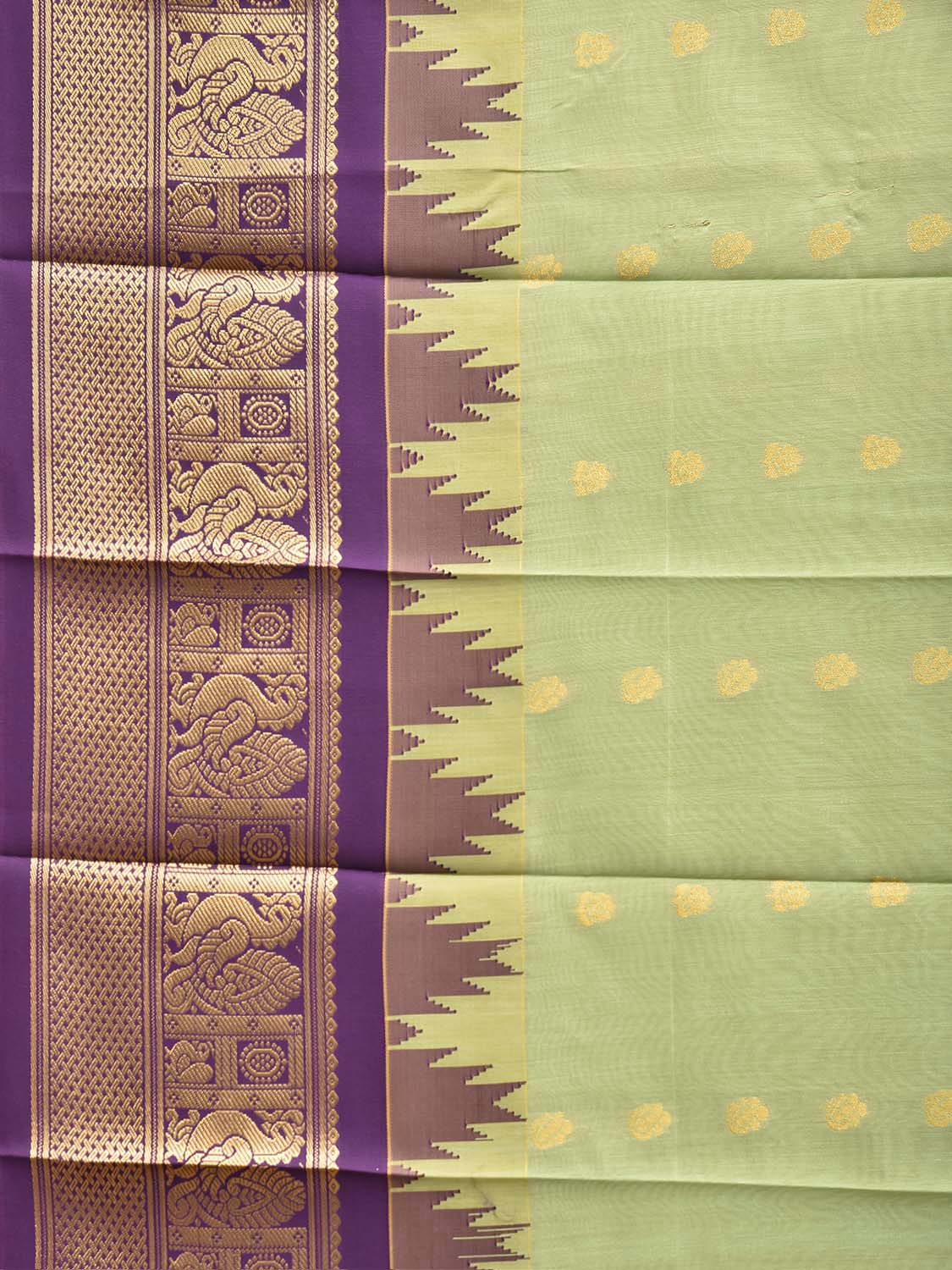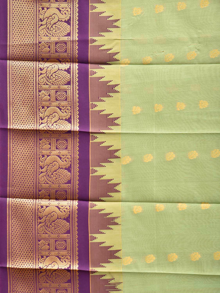 Sea Green and Purple Gadwal Cotton Viscose Saree with Body Buta and Temple Border Design. Gadwal Sarees are known for their traditional design of border and pallu made of silk and body being either cotton or silk. They are known as Sico sarees for border and pallu being silk and body being cotton. We advice dry clean for fabric care.