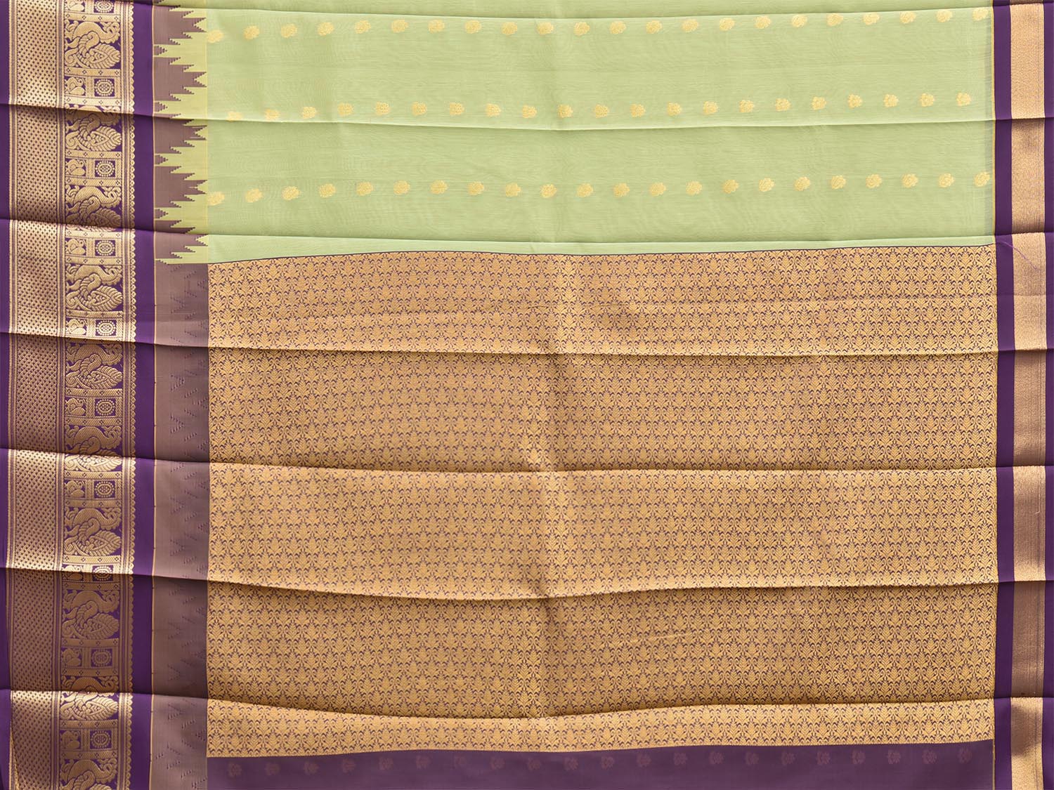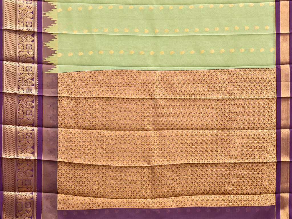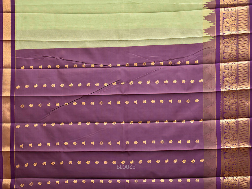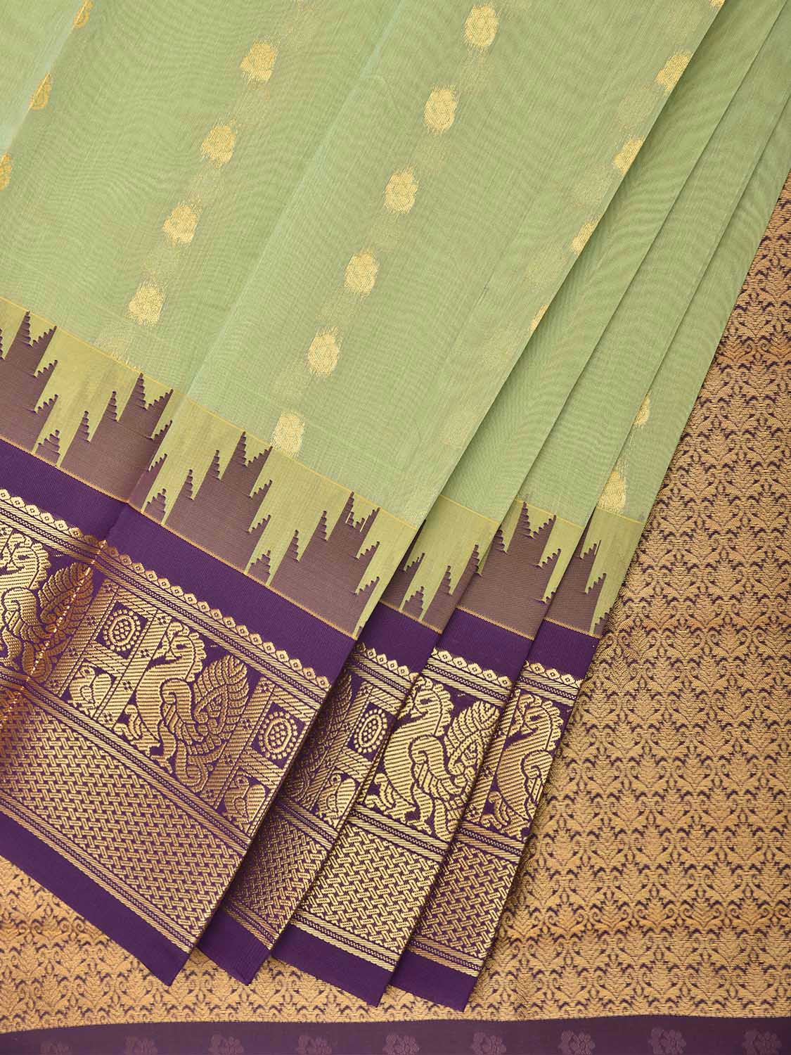 Sea Green and Purple Gadwal Cotton Viscose Saree with Body Buta and Temple Border Design. Gadwal Sarees are known for their traditional design of border and pallu made of silk and body being either cotton or silk. They are known as Sico sarees for border and pallu being silk and body being cotton. We advice dry clean for fabric care.