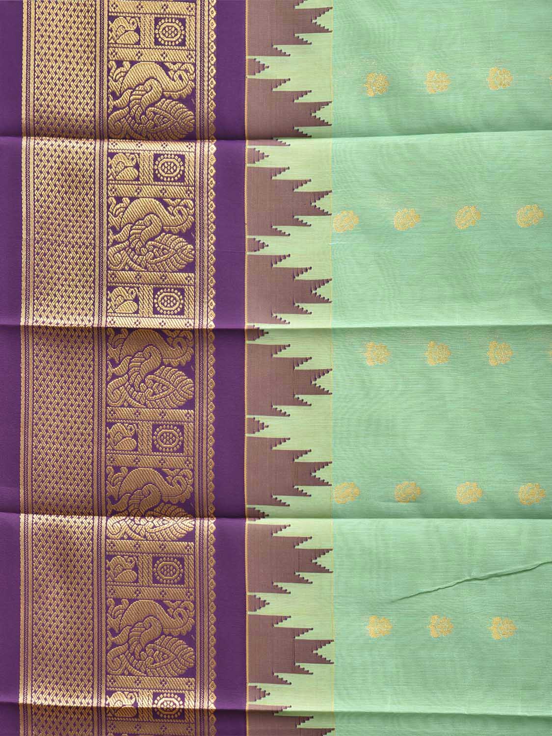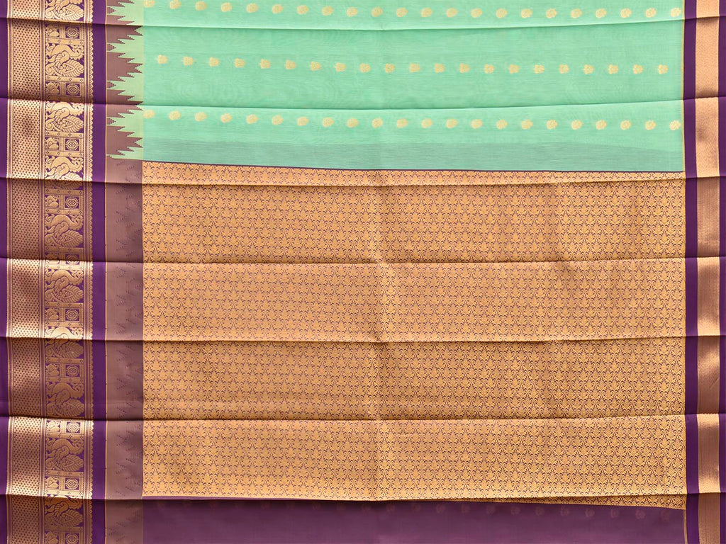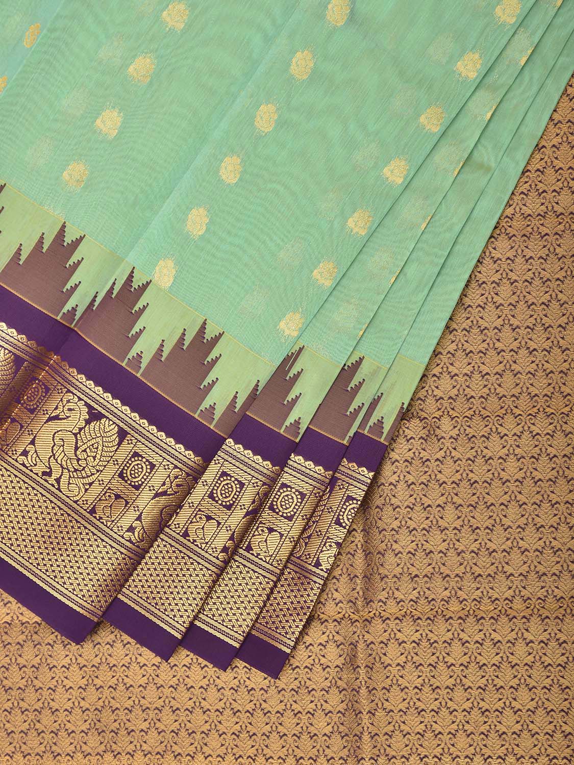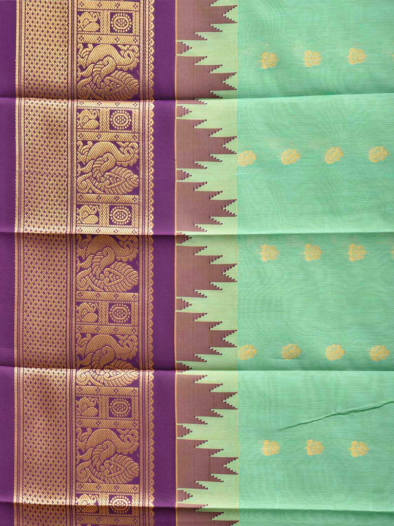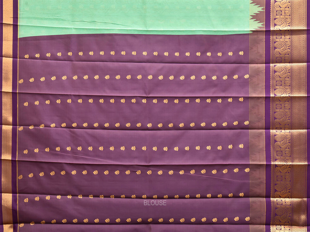 Turquoise and Purple Gadwal Cotton Viscose Saree with Body Buta and Temple Border Design. Gadwal Sarees are known for their traditional design of border and pallu made of silk and body being either cotton or silk. They are known as Sico sarees for border and pallu being silk and body being cotton. We advice dry clean for fabric care.
