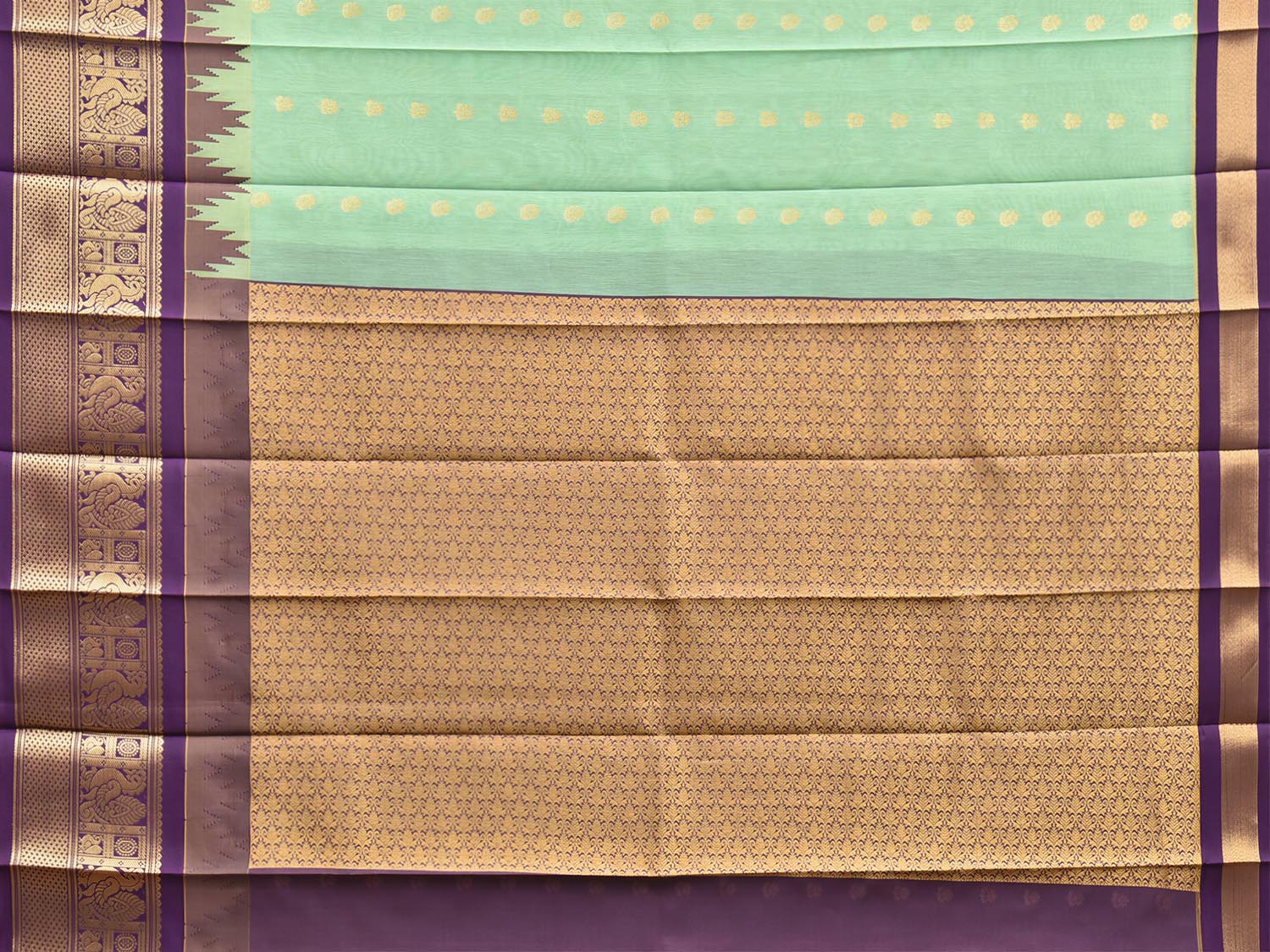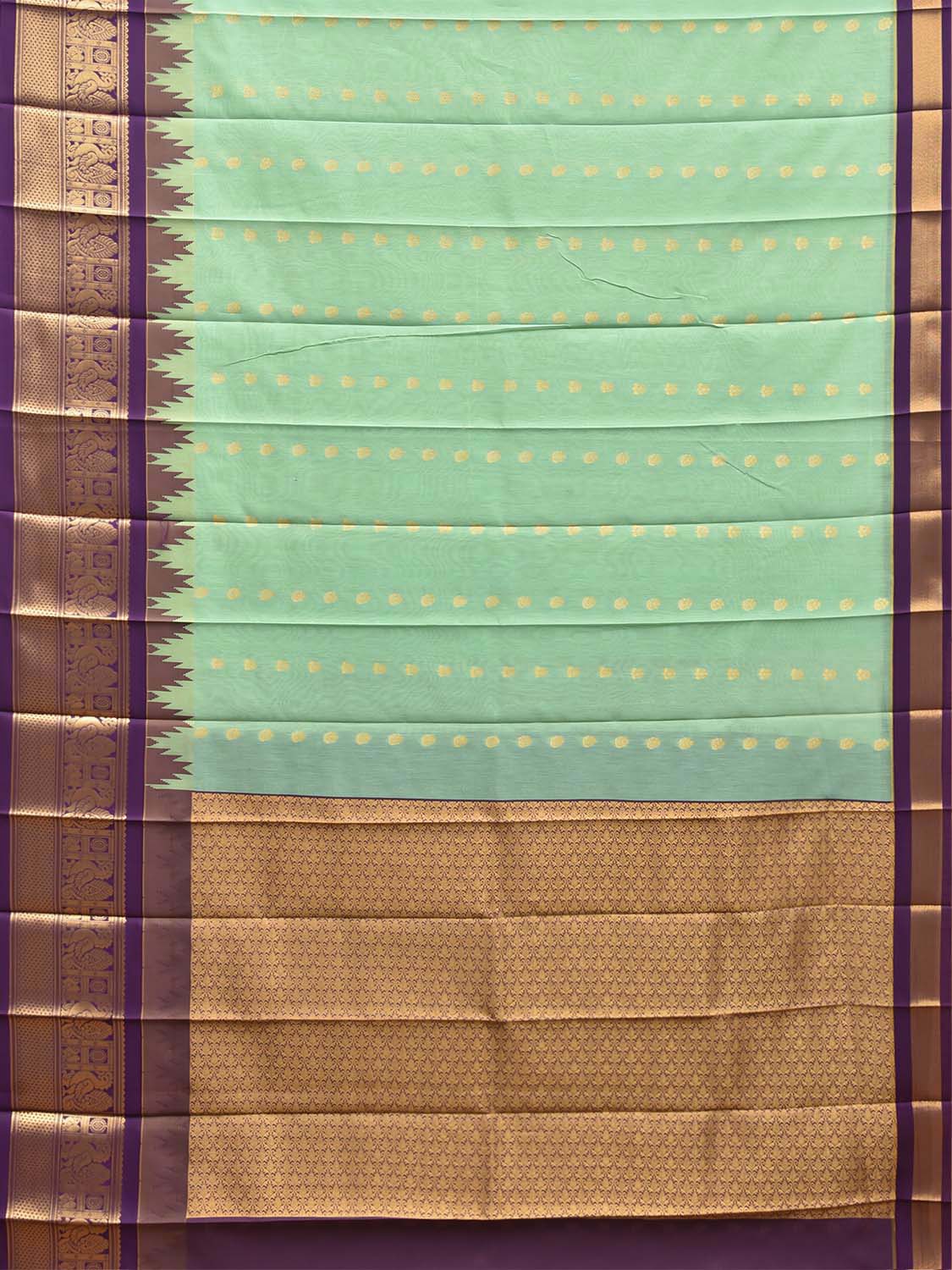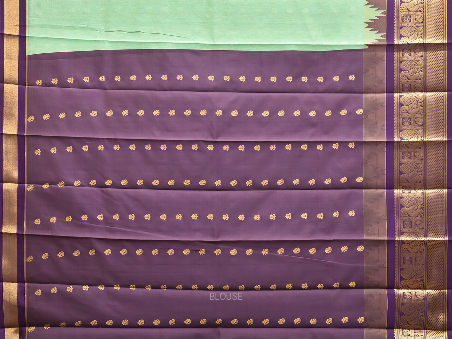 Turquoise and Purple Gadwal Cotton Viscose Saree with Body Buta and Temple Border Design. Gadwal Sarees are known for their traditional design of border and pallu made of silk and body being either cotton or silk. They are known as Sico sarees for border and pallu being silk and body being cotton. We advice dry clean for fabric care.