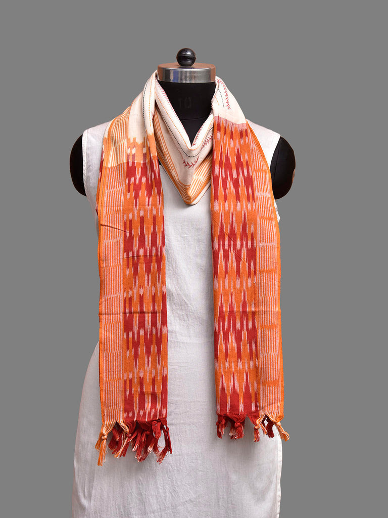 White and Red Pochampally Ikat Cotton Handloom Dupatta with Embroidary Strips Design. This Handloom Dupatta has been woven using the resist-dyeing, which produces the unique patterns adorning the fabric. We advise gentle handwash separately for fabric care.