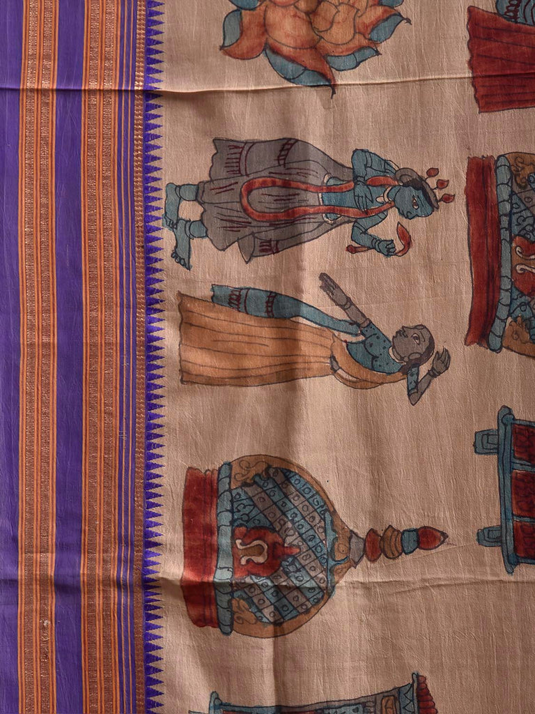 Cream and Dark Blue Kalamkari Hand Painted Narayanpet Pure Silk Saree with All Over Design No Blouse. This hand painted kalamkari is done using natural dyes. As they are natural colors they bleed with initial washes, so we suggest Dry clean. This Saree has No Blouse.