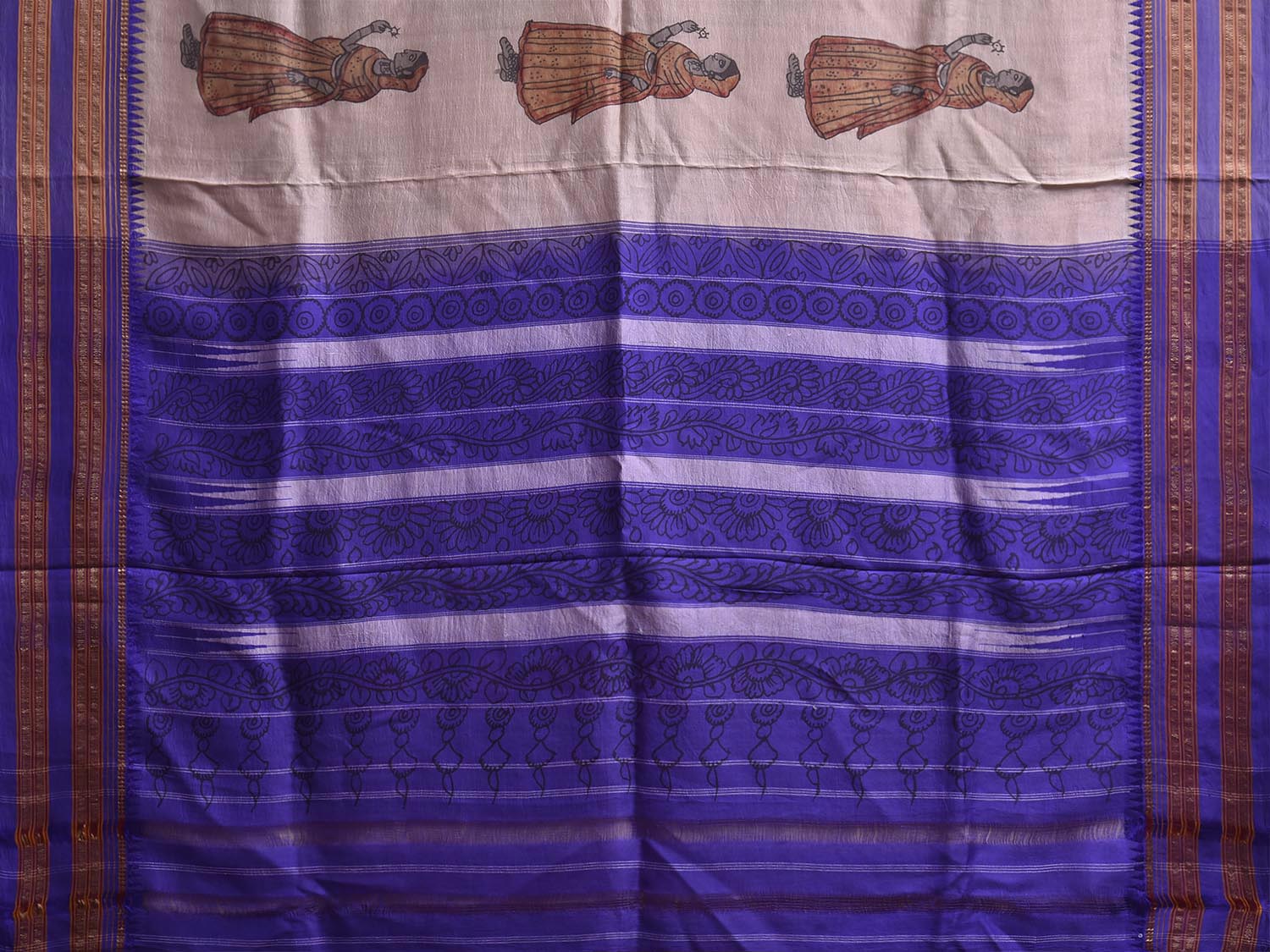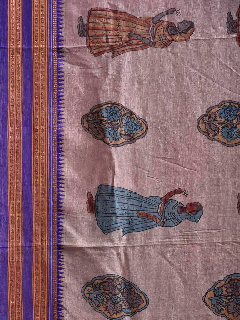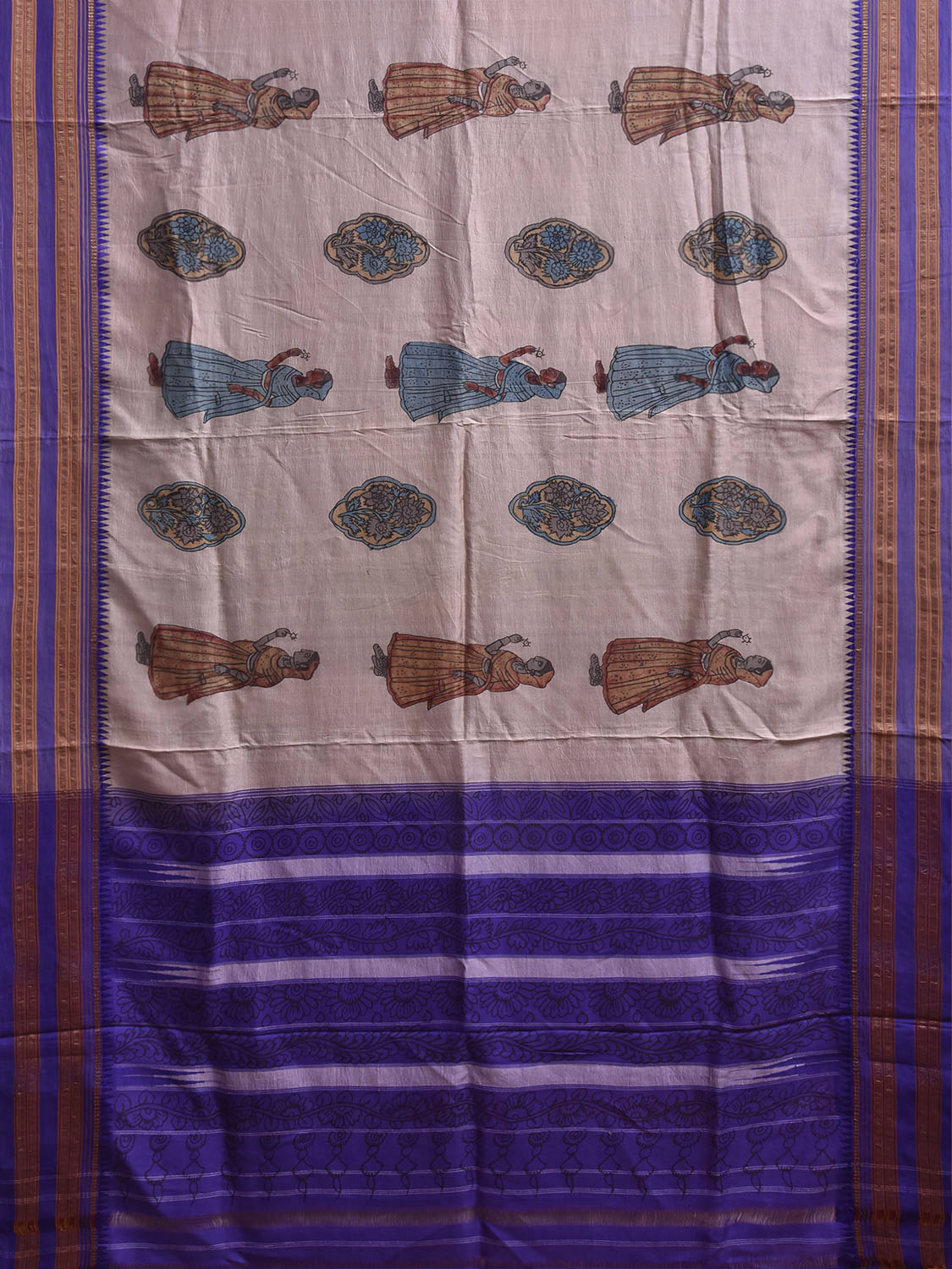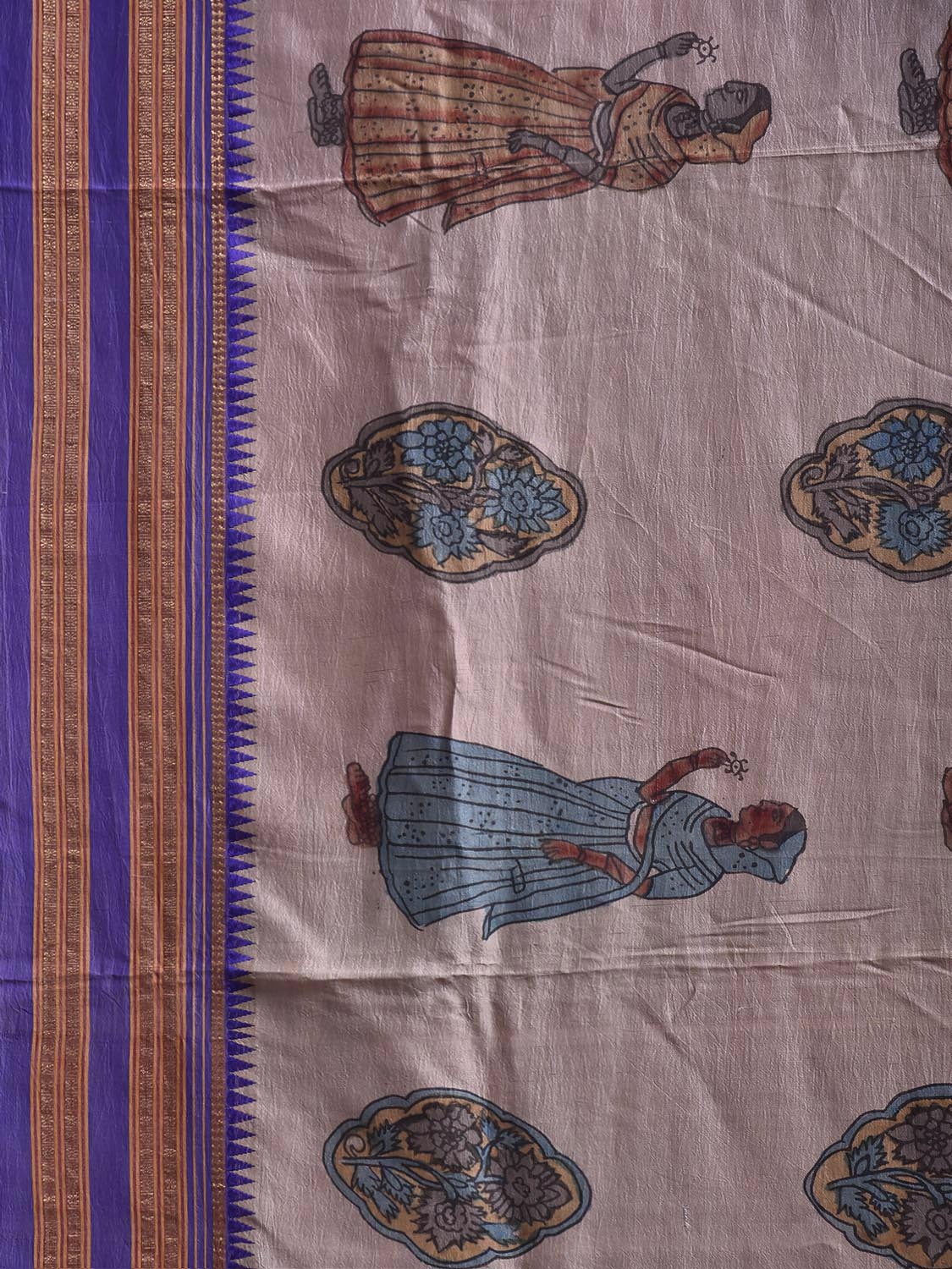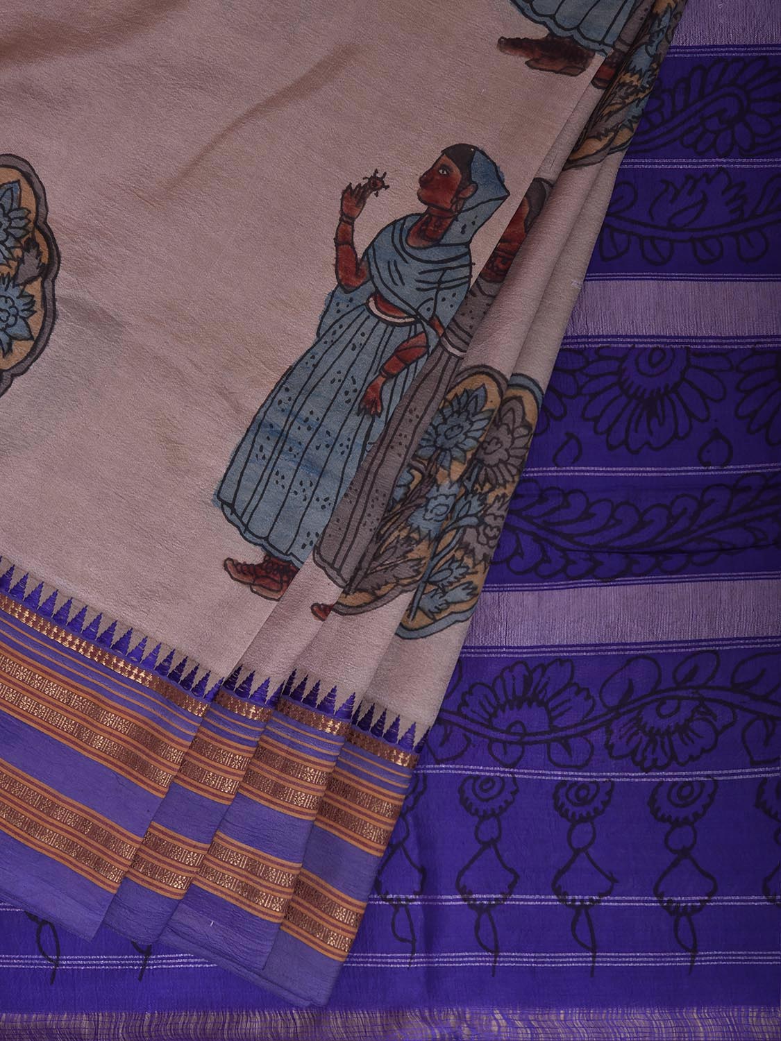 Cream and Dark Blue Kalamkari Hand Painted Narayanpet Pure Silk Saree with Female Figures and Floral Design No Blouse. This hand painted kalamkari is done using natural dyes. As they are natural colors they bleed with initial washes, so we suggest Dry clean. This Saree has No Blouse.
