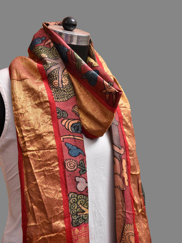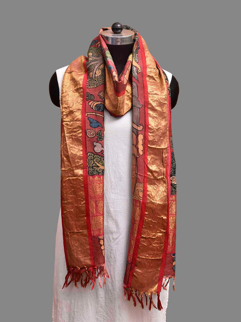 Maroon and Red Kalamkari Hand Painted Kanchipuram Silk Handloom Dupatta with Animals Design. This hand painted kalamkari is done using natural dyes. As they are natural colors they bleed with initial washes, so we suggest Dry clean.