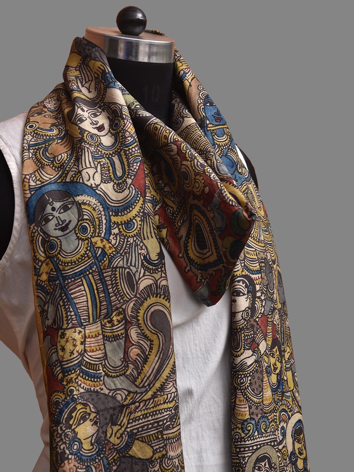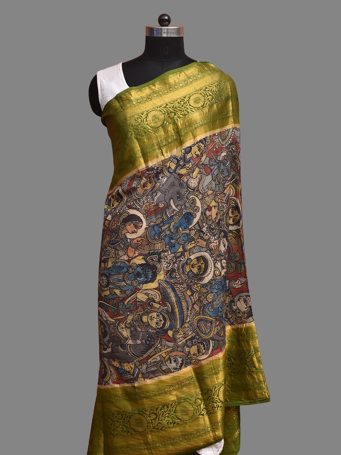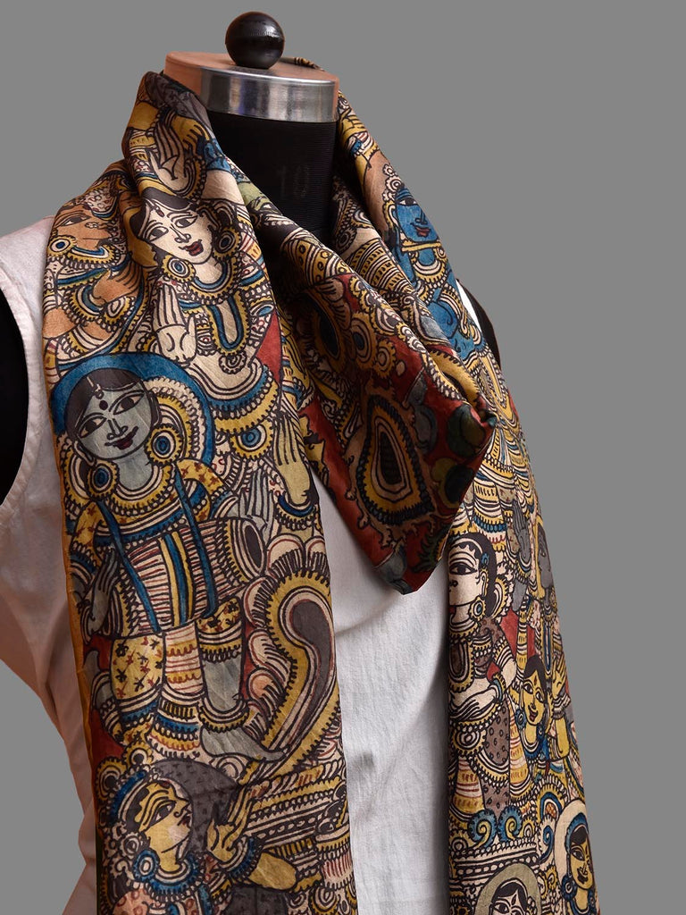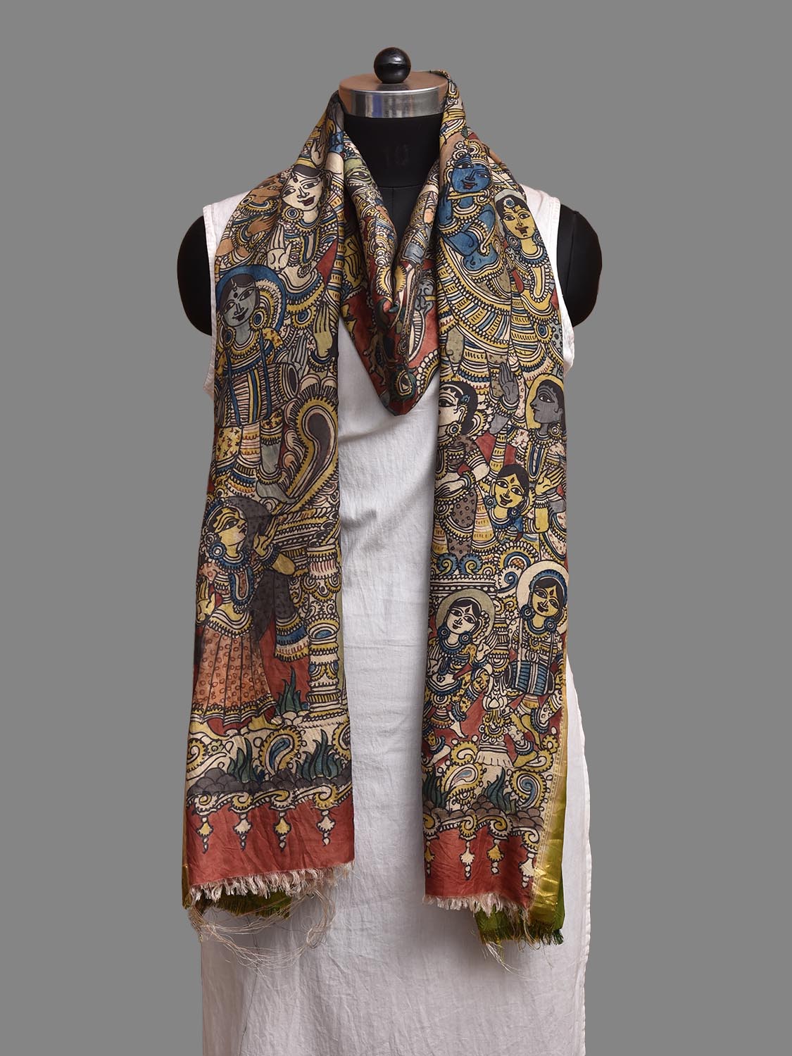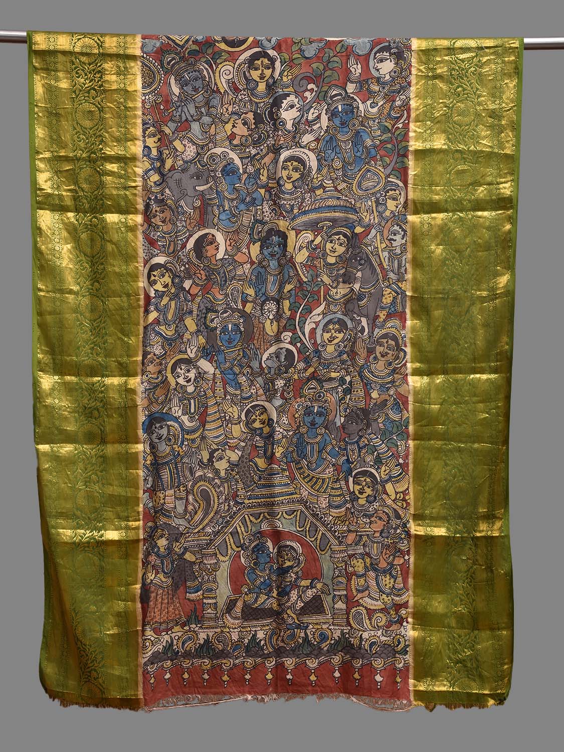 Red and Green Kalamkari Hand Painted Kanchipuram Silk Handloom Dupatta with Krishna Design. This hand painted kalamkari is done using natural dyes. As they are natural colors they bleed with initial washes, so we suggest Dry clean.