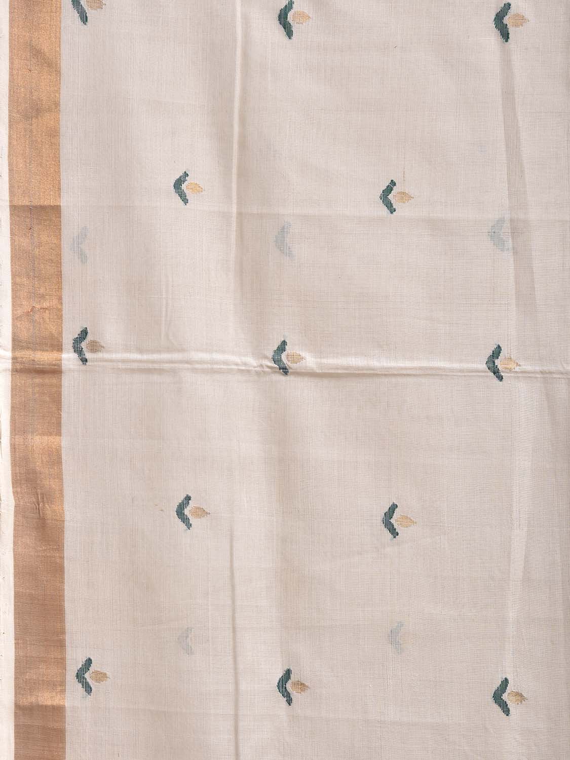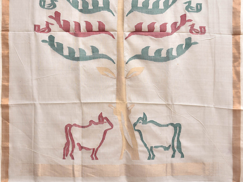 White Khadi Cotton Handloom Saree with Cows and Tree Pallu Design. Khadi saree is primarily woven from cotton and may also include silk, or wool. It is a versatile fabric, cool in summer and warm in winter. For fabric care we advise dry clean.