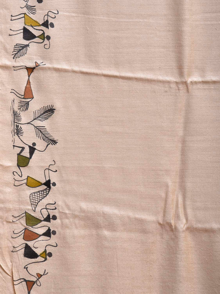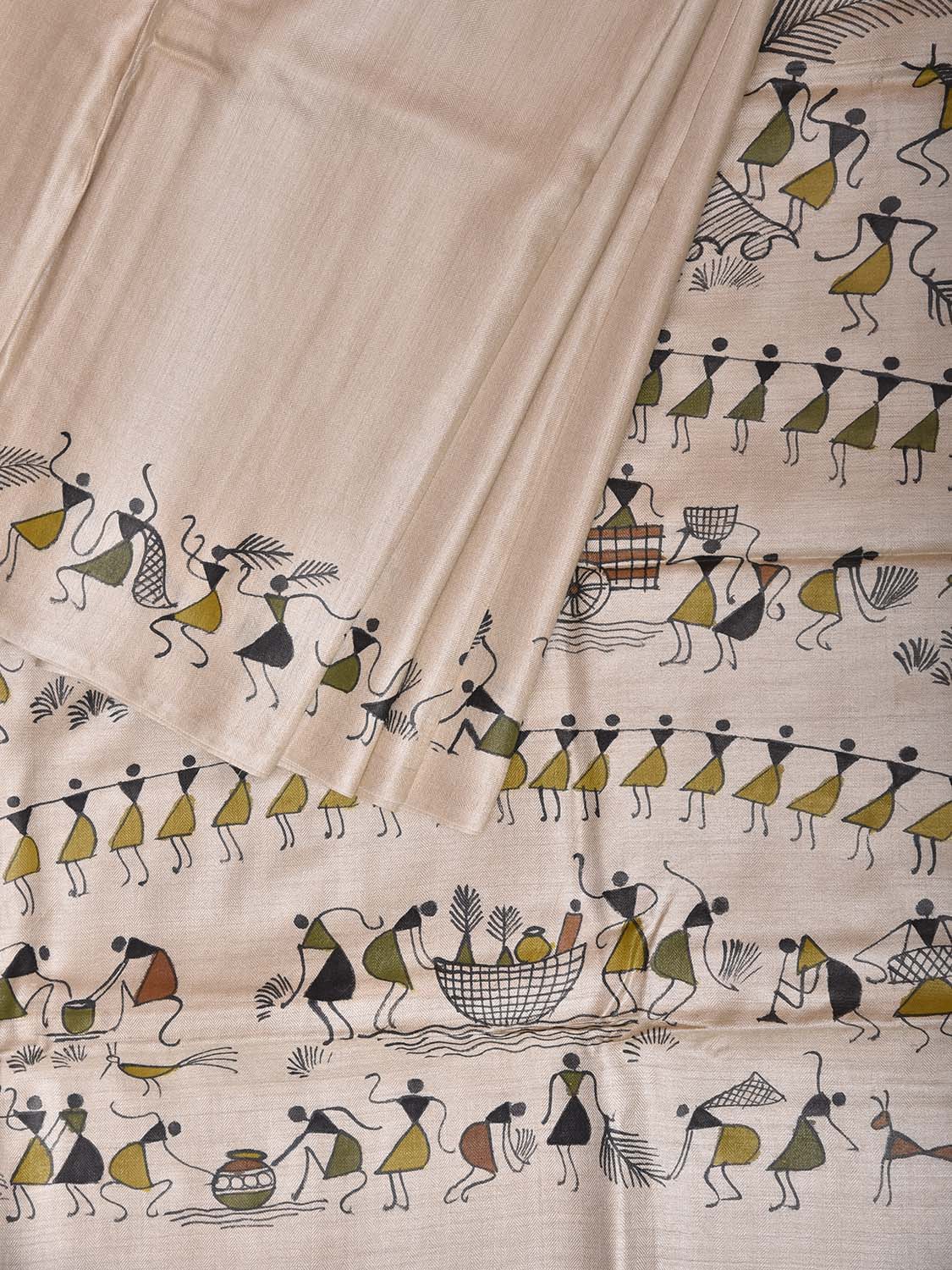 Cream Warli Print Tussar Saree with Pallu and Border Design. For fabric care we advise dry clean.