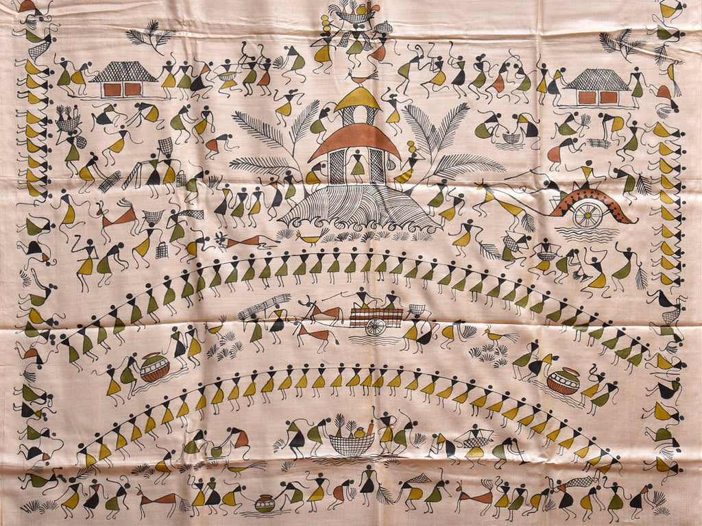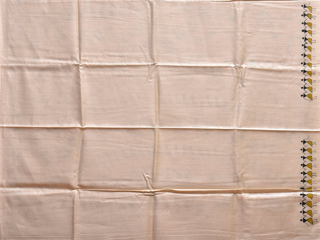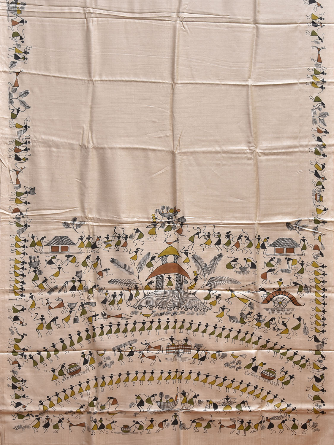 Cream Warli Print Tussar Saree with Pallu and Border Design o0752