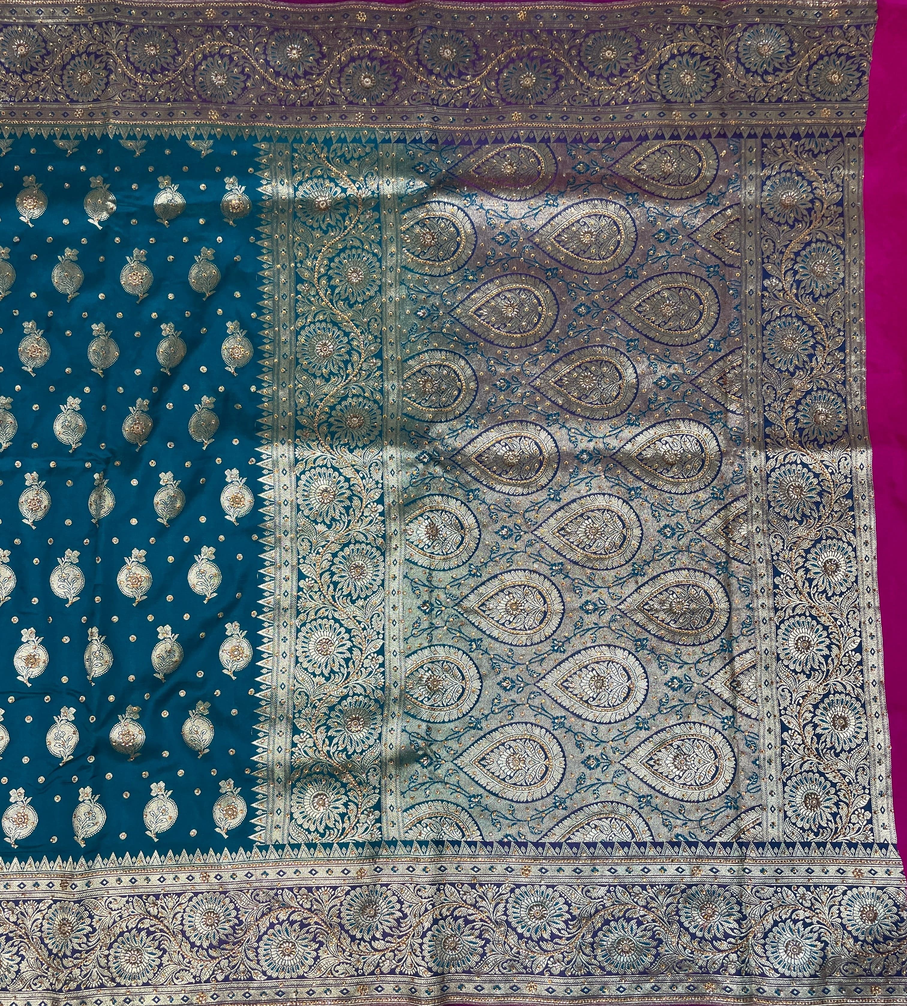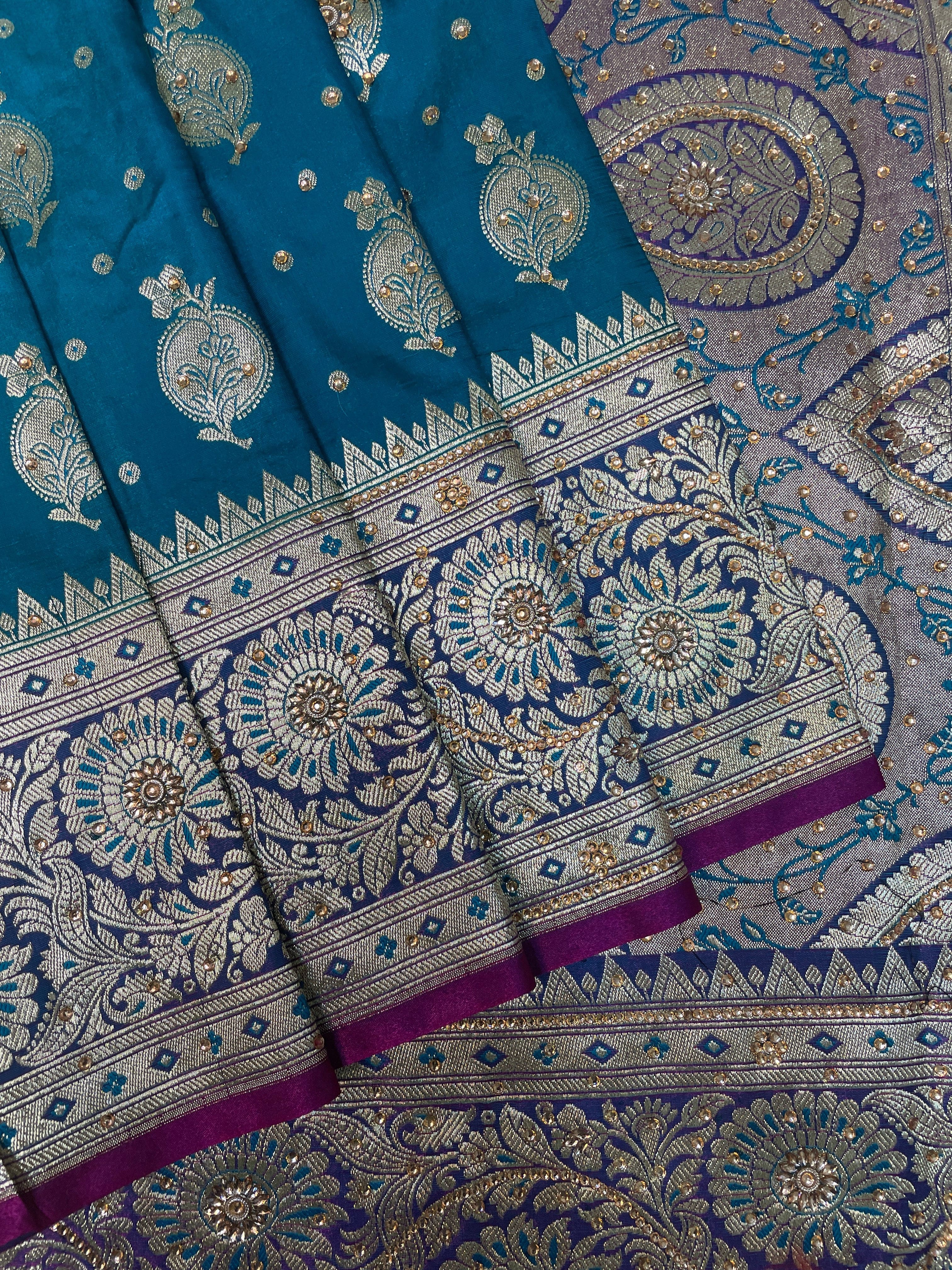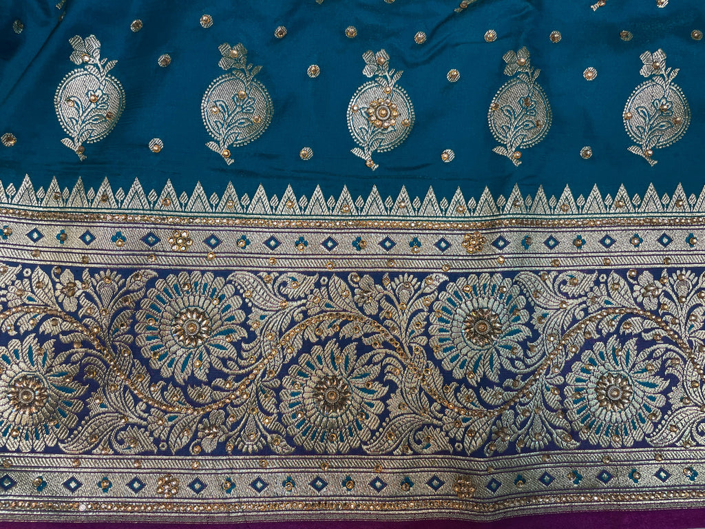 Teal Blue And Pink Katan Banarasi Saree with Silver Zari Floral Weaving And Grand Pallu B0621ds