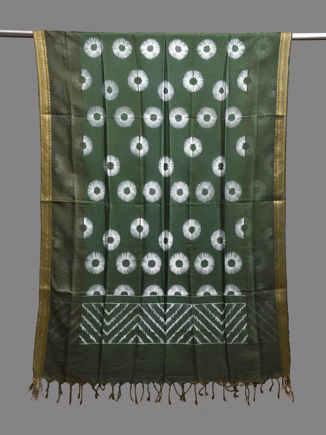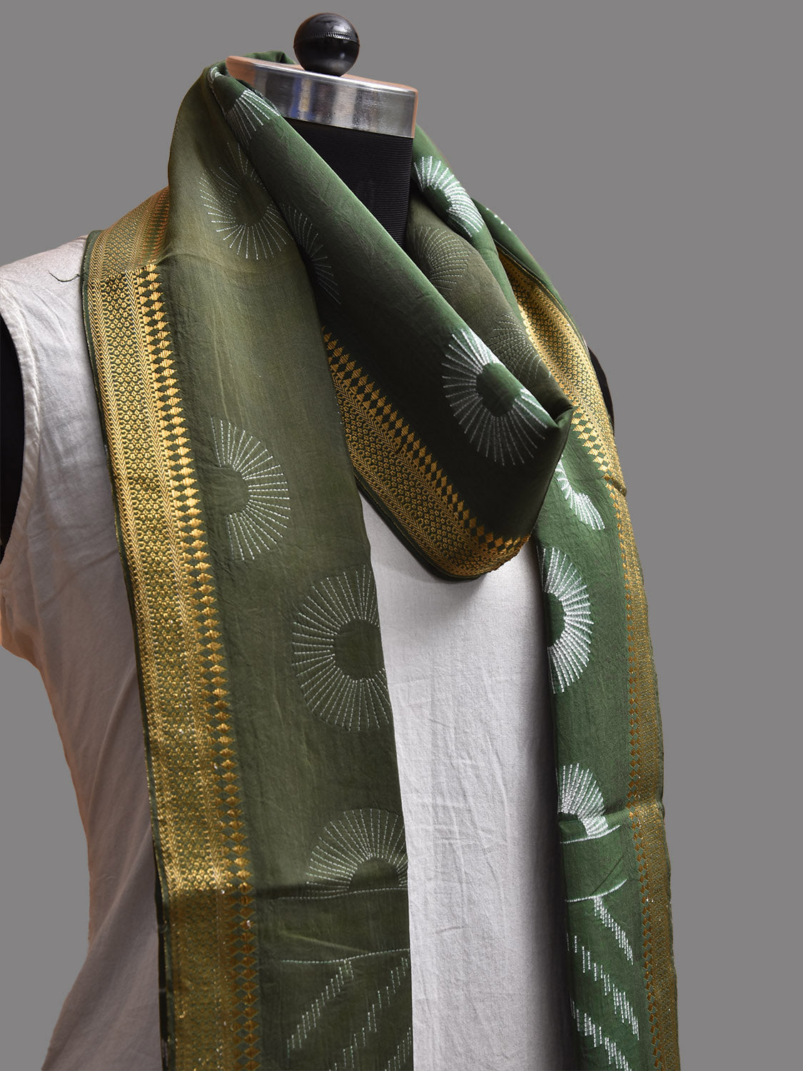 Green Shibori Mangalgiri Sico Dupatta with Zari Border Design. Shibori is Japanese a Technique of tie and dye, and resist some parts by clamping or stitching the fabric. The result produced are unique geometric patterns & any other eloborate design. For fabric care we advise gentle handwash separately.